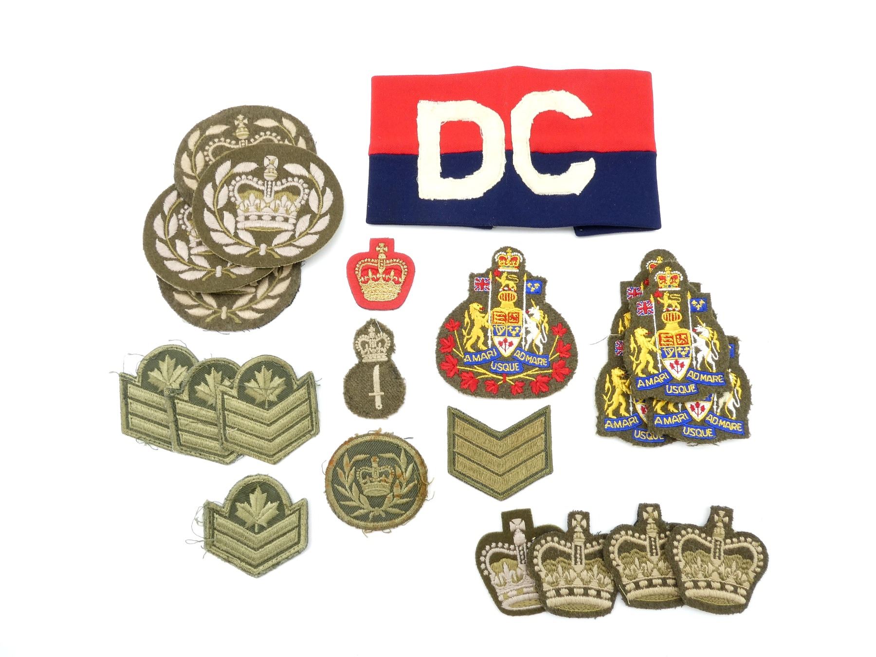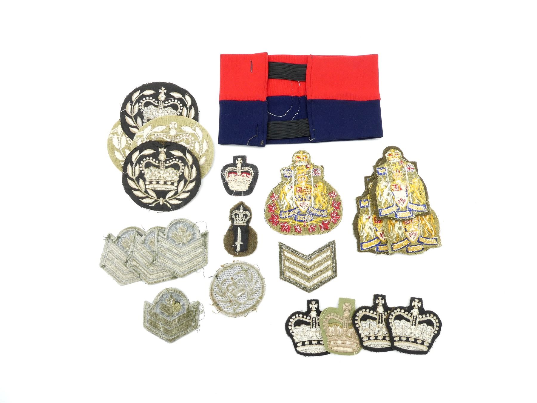 APPROX. (22) PIECES, VARIOUS SIZES / COLOURS, QUEEN'S CROWNS, INCLUDES; VARIOUS WARRANT OFFICER QUEEN'S CROWN BADGES, VARIOUS MASTER WARRANT OFFICER QUEEN'S CROWN BADGES, VARIOUS CHIEF WARRANT OFFICER COAT OF ARMS BADGES, SERGEANT RANK CHEVRONS, CORPORAL RANK CHEVRONS, ETC. SEE PHOTOS.
