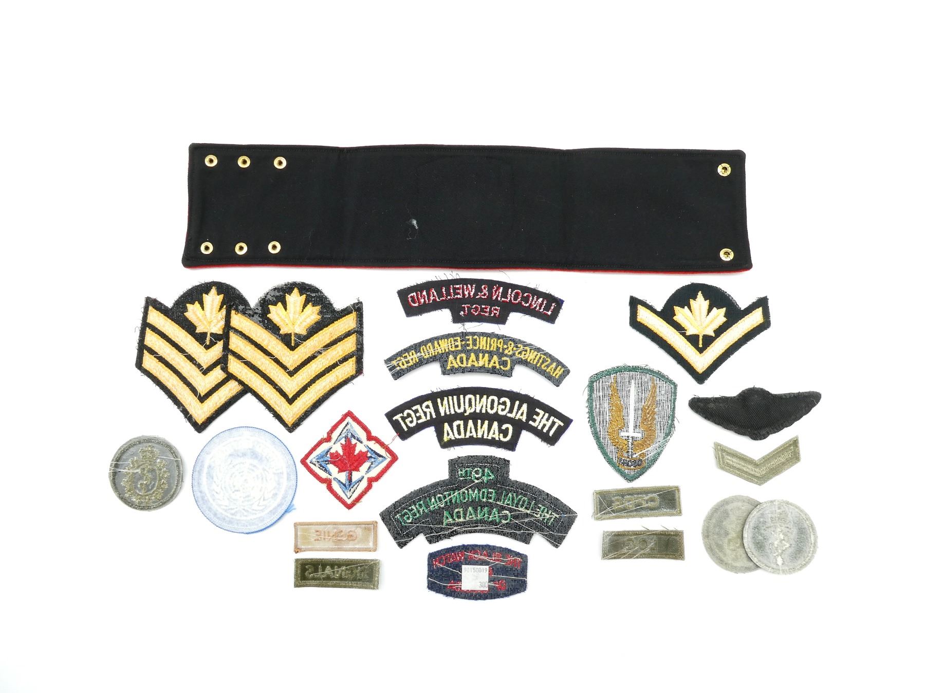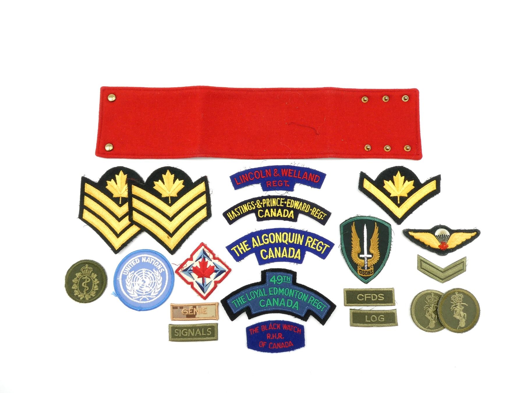 APPROX. (21) PIECES, VARIOUS SIZES / COLOURS, QUEEN'S CROWNS, INCLUDES; SERGEANT RANK CHEVRONS, TRAINED PRIVATE RANK CHEVRONS, HASTING & PRINCE EDWARD REGIMENT, THE ALGONQUIN REGIMENT, LINCOLN & WELLAND REGIMENT, THE BLACK WATCH R.H.R. OF CANADA, 49TH THE LOYAL EDMONTON REGIMENT, MOBILE COMMAND, ETC. SEE PHOTOS.