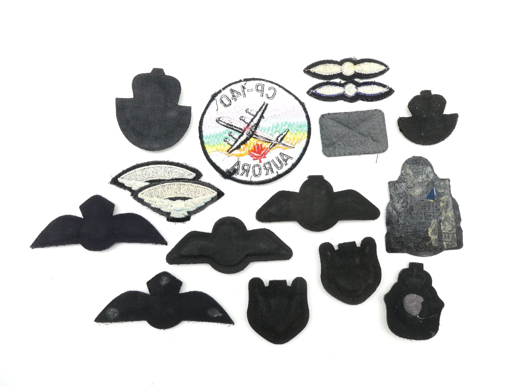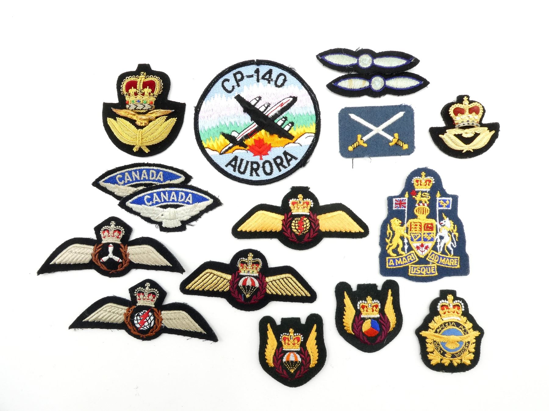APPROX. (16) PIECES, VARIOUS SIZES / COLOURS, QUEEN'S CROWNS, INCLUDES; CHIEF WARRANT OFFICER COAT OF ARMS, CROSSED SWORDS, CP-140 AURORA BADGE, FLIGHT ENGINEER WINGS, NAVIGATOR WINGS, TACTICAL HELICOPTER OBSERVER TRADE BADGE, AIR RESCUE SERVICE BADGE, PARACHUTIST BADGE, ETC. SEE PHOTOS.