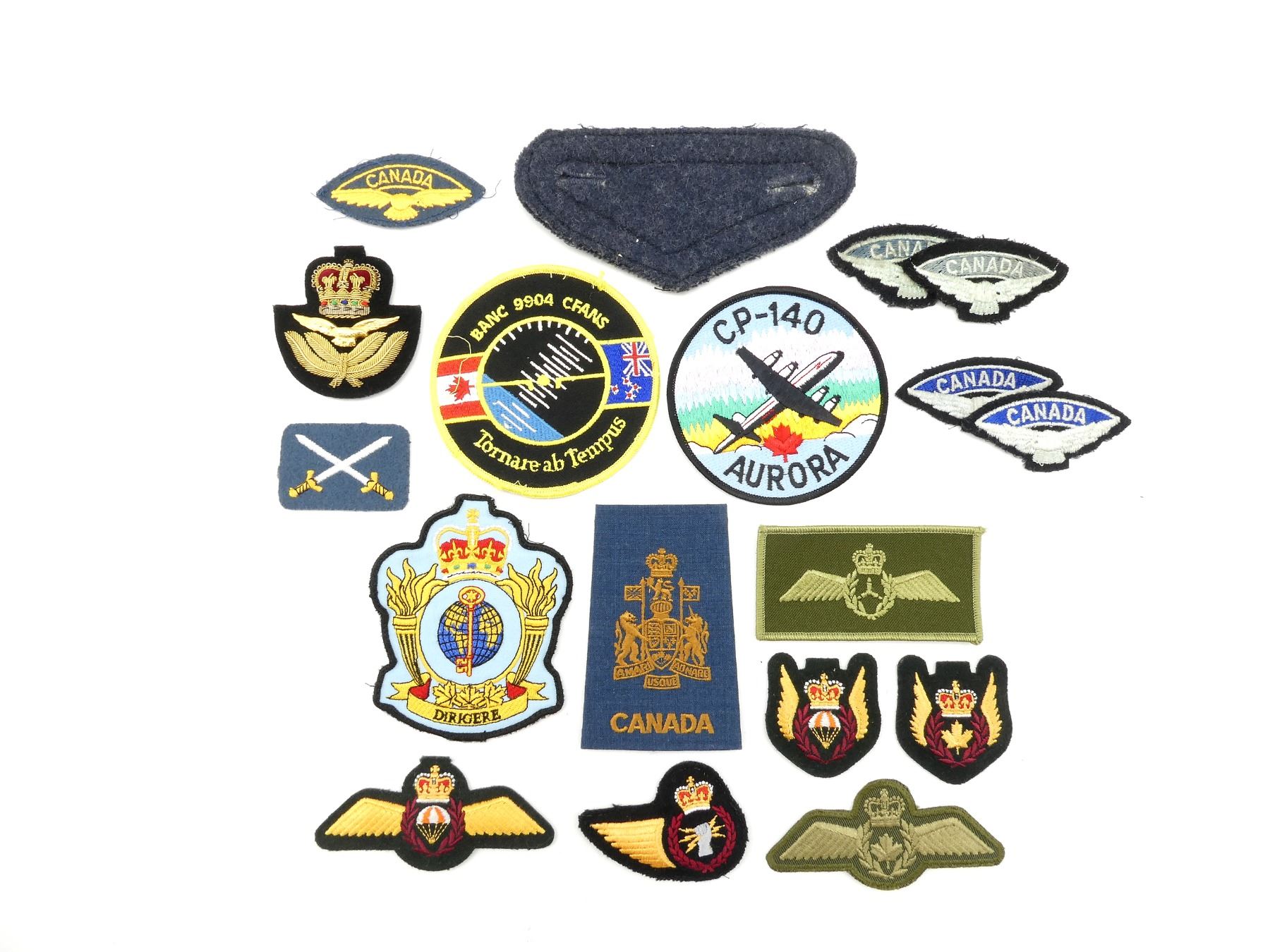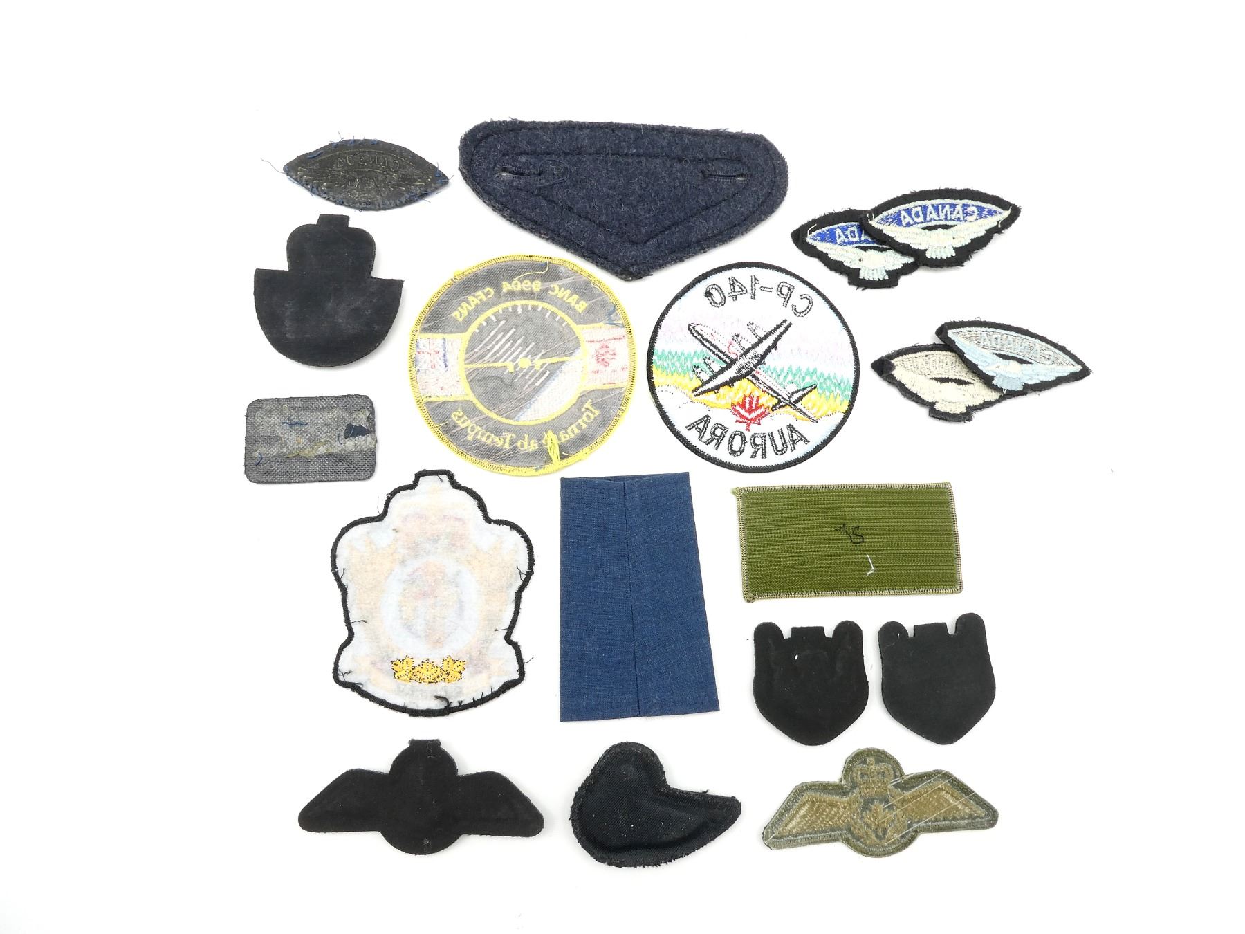 APPROX. (18) PIECES, VARIOUS SIZES / COLOURS, QUEEN'S CROWNS, INCLUDES; BANC 9904 CFANS BADGE, CP-140 AURORA BADGE, AEROSPACE TELECOMMUNICATIONS & INFORMATION SYSTEMS TECHNICIAN TRADE BADGE, SEARCH & RESCUE SPECIALIST BADGE, FLIGHT ENGINEER BADGE, PILOT WINGS, VARIOUS RCAF SHOULDER FLASH BADGES, CHIEF WARRANT OFFICER SLIP-ON SHOULDER BOARD, ETC. SEE PHOTOS.