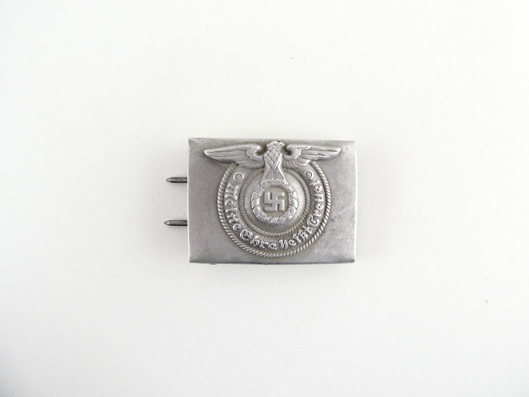 (1) REPRODUCTION SS BELT BUCKLE, BUCKLE MARKED: "MEINE EHRE HEIST TREUE" WITH FLYING EAGLE HOLDING SWASTIKA, OTHER-SIDE MARKED: "RZM", "36/42", "SS", MISSING METAL LOOP BACKING. SEE PHOTOS.