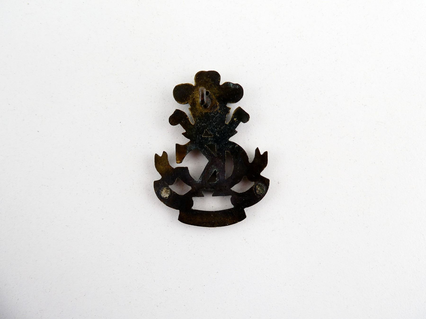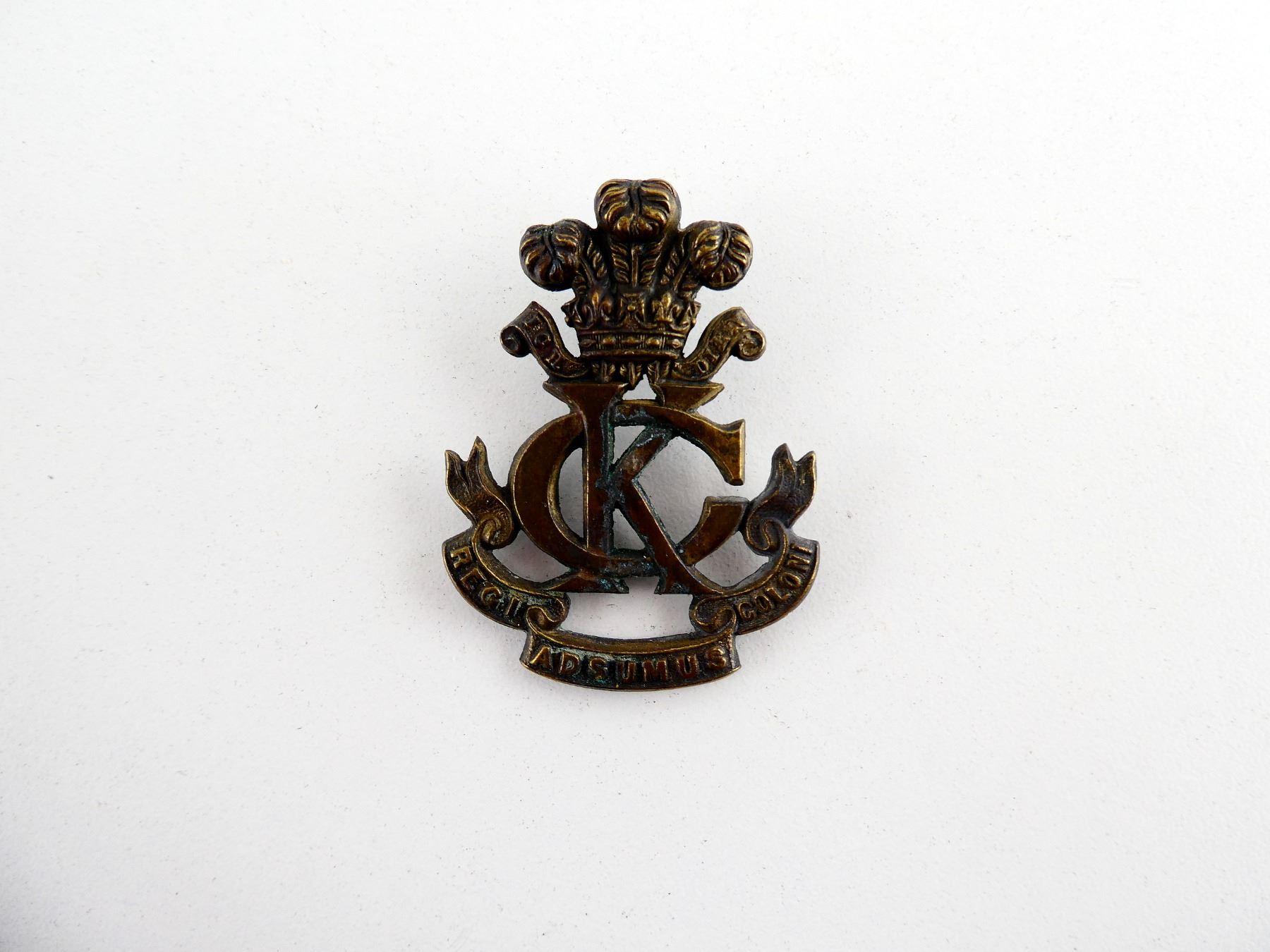 (1) BRASS CAP BADGE WITH THREE PLUMED CROWN OVER "ICH DIEN" IN BANNER OVER INTERTWINED "KC" OVER "REGI, ADSUMUS, COLONI" IN BANNER, PART OF BACKING MISSING, THE KING'S COLONIALS WAS CREATED IN 1901. SEE PHOTOS.
