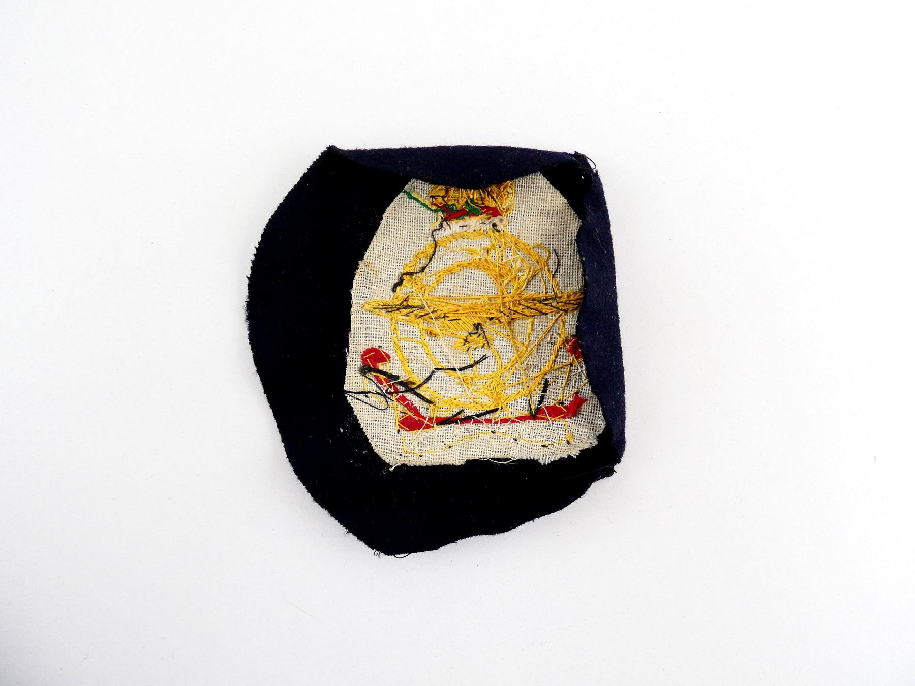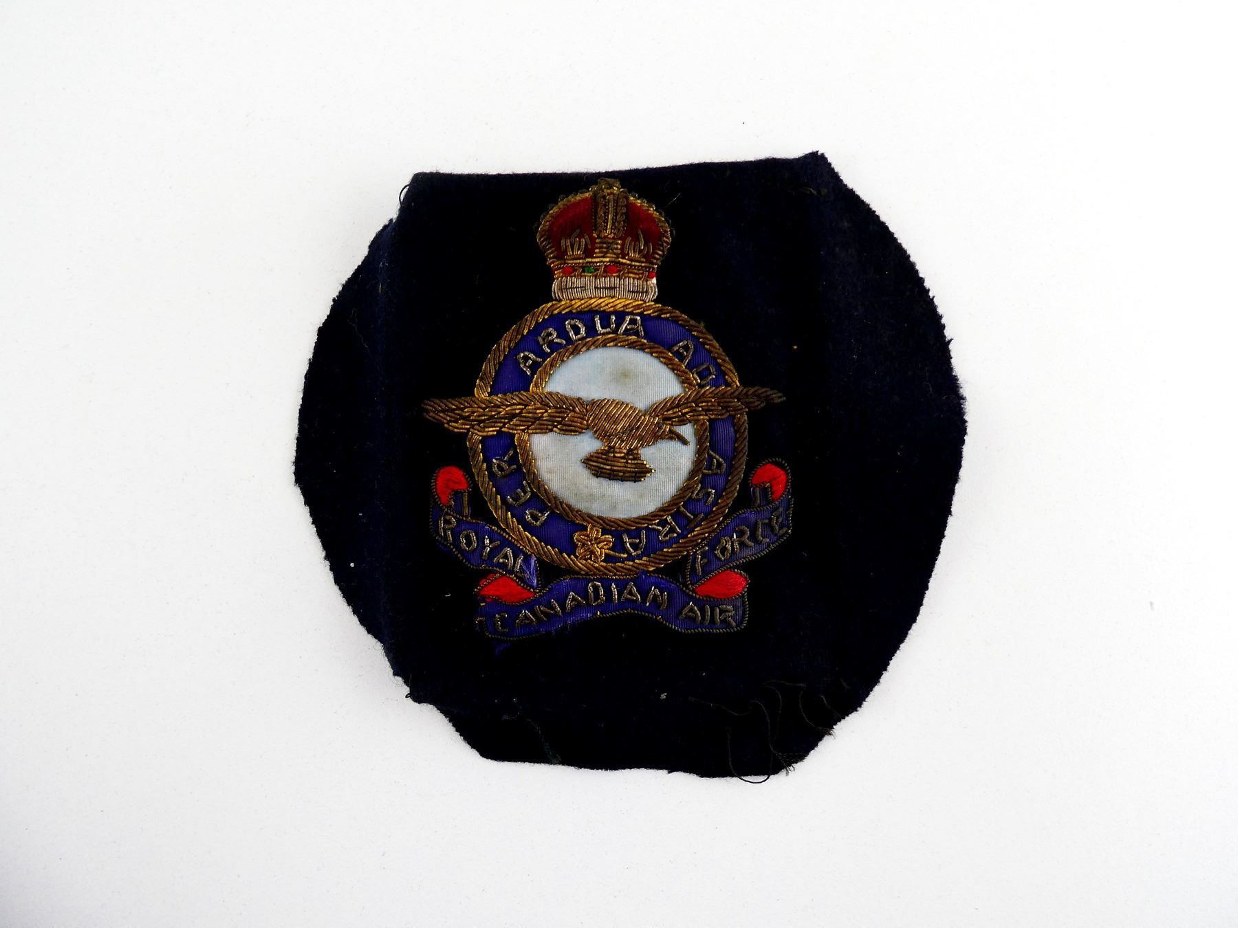 (1) RCAF WIRE BULLION WITH KING'S CROWN ON NAVY BLUE WOOL BACKING, SHOWS AGE / WEAR. SEE PHOTOS.
