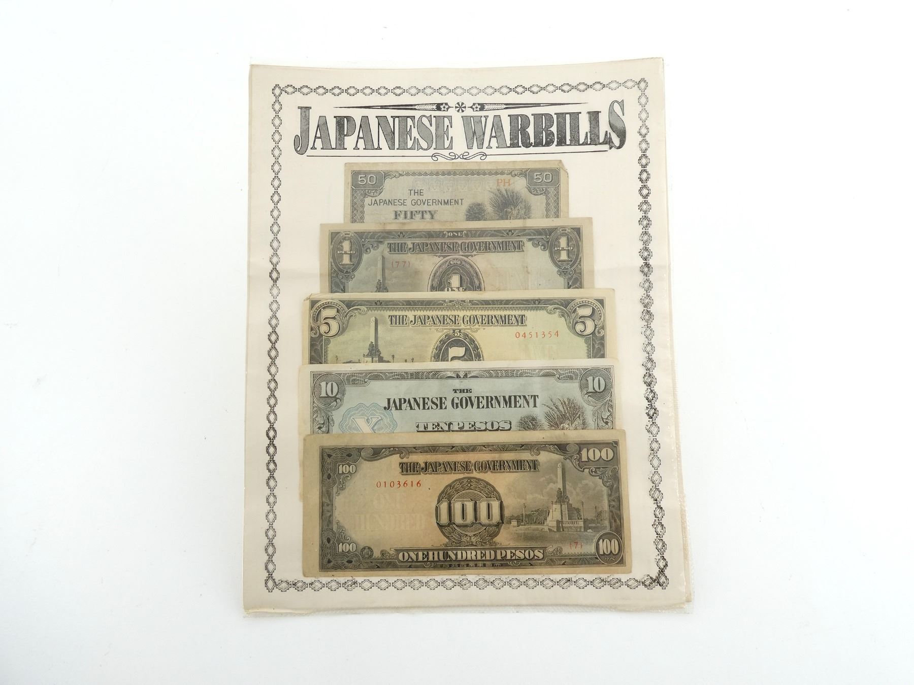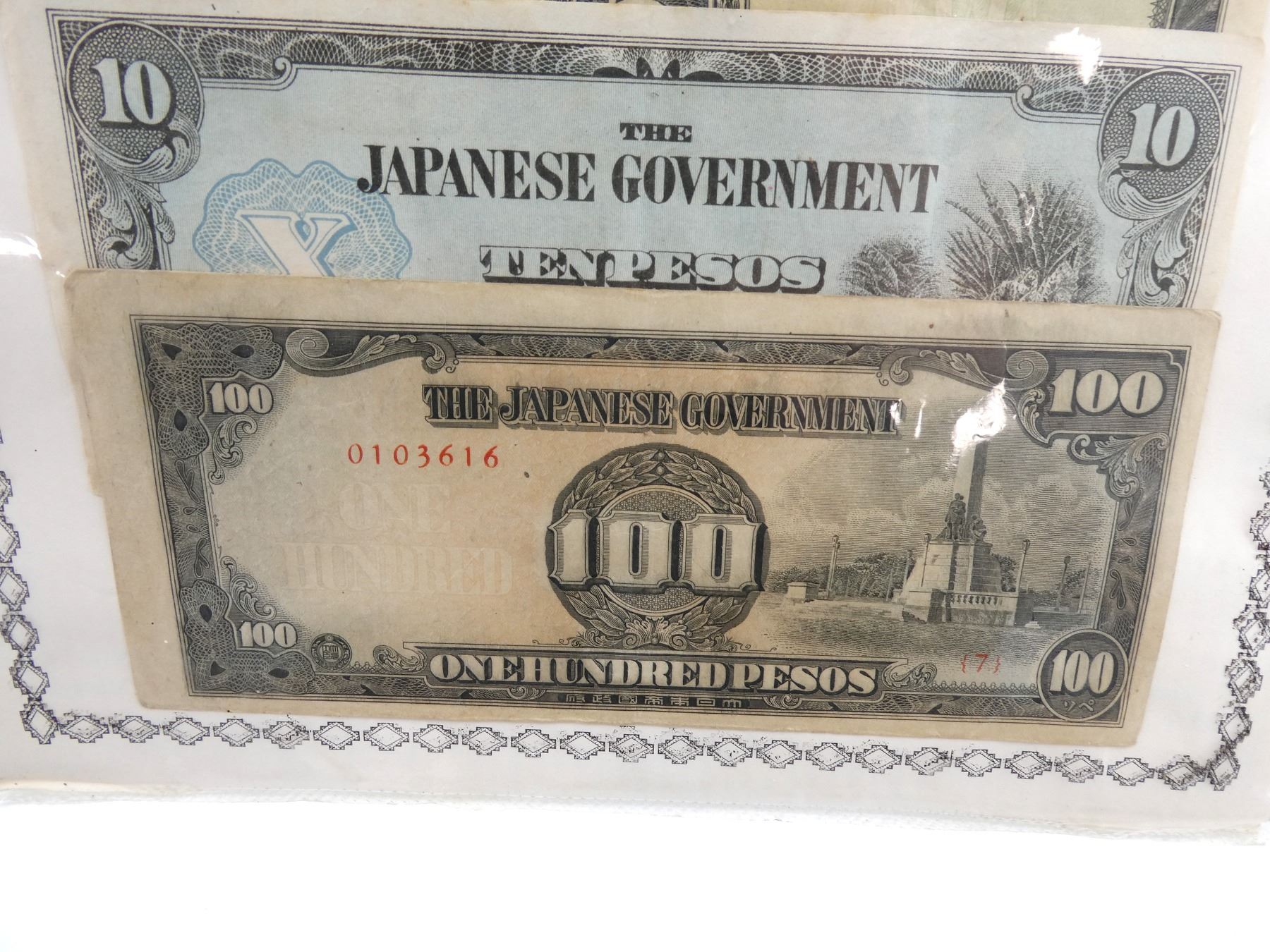 LOT INCLUDES; (5) JAPANESE BANK NOTES, FIFTY CENTAVOS, ONE PESO, FIVE PESOS, TEN PESOS, ONE HUNDRED PESOS, ALL AFFIXED / GLUED TO PAPER BACKING, PACKAGING WAS SEALED, OPENED FOR PHOTOGRAPHY ONLY. SEE PHOTOS.