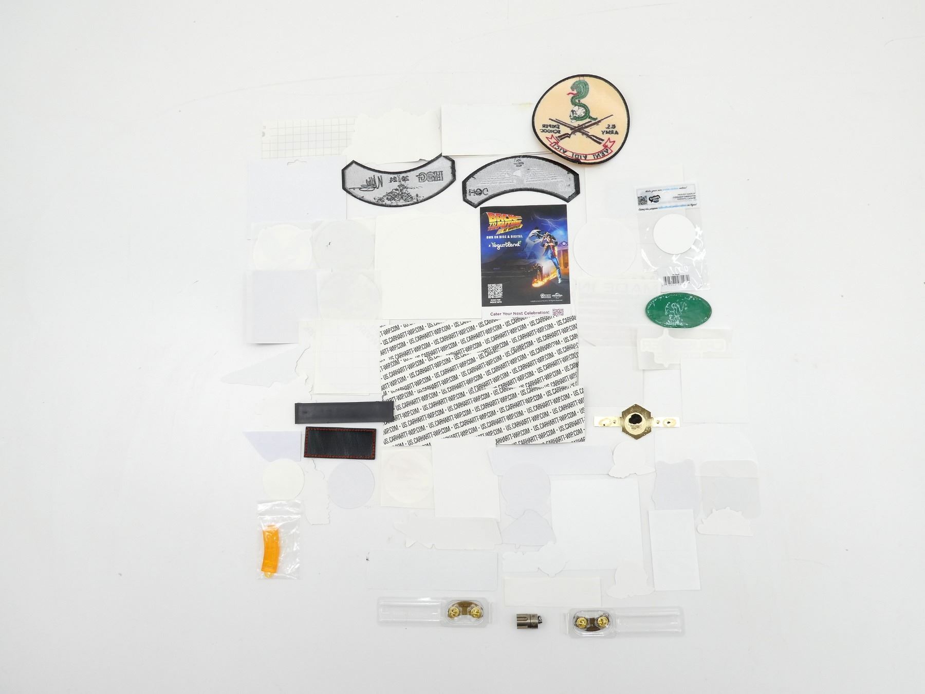APPROX. (60) PIECES, VARIOUS STICKERS, BADGES, PINS, VARIOUS SIZES / MATERIALS, MILITARY / NON-MILITARY INCLUDES; AIRBORNE STICKER, ARMY STICKER, BRITISH STYLE PARATROOPER STICKER, U.S. ARMY SNIPER SCHOOL BADGE, PALMETTO STATE ARMORY STICKER, U.S. HOLOCAUST MEMORIAL MUSEUM STICKER, REDDING PRECISION RELOADING STICKERS, MADE IN U.S.A. STICKERS, INTERNATIONAL SPY MUSEUM STICKER, ETC. SEE PHOTOS.