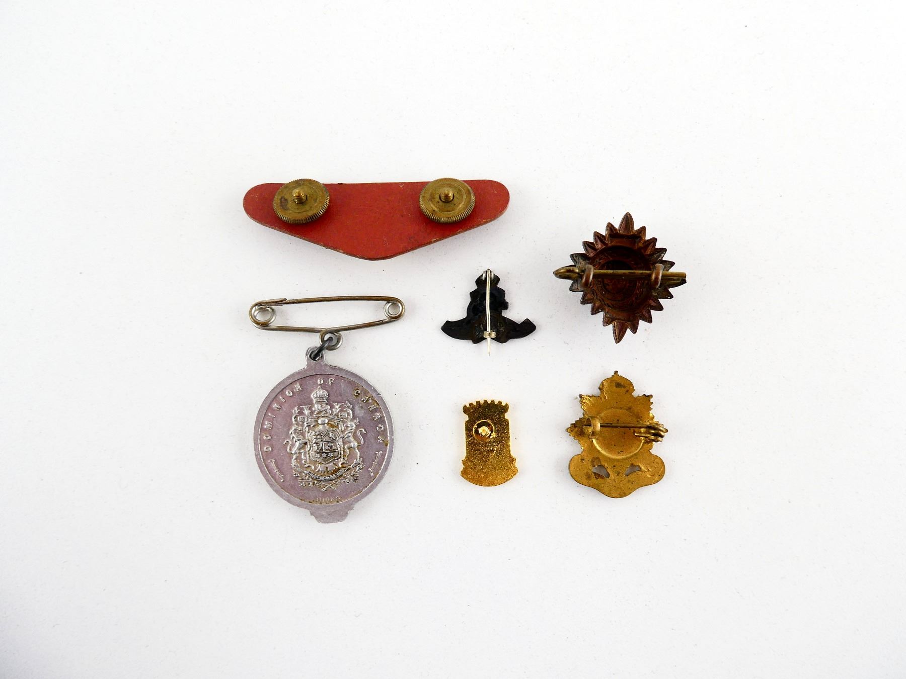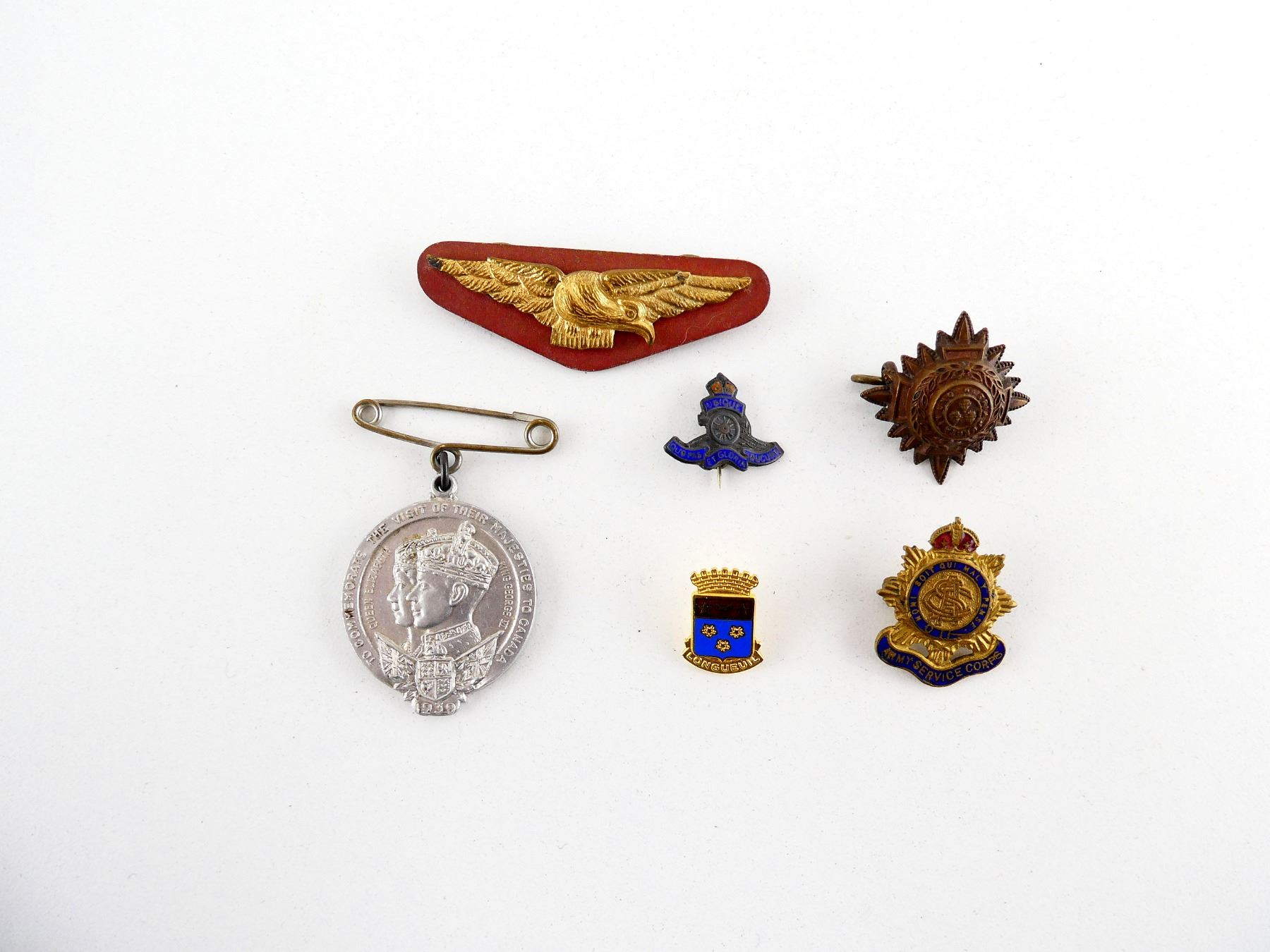 LOT INCLUDES; (1) KING'S CROWN ARMY SERVICE CORPS PIN, (1) RANK PIP, (1) KING'S CROWN ROYAL CANADIAN ARTILLERY PIN, (1) MEDALLION COMMEMORATING QUEEN ELIZABETH / KING GEORGE VI'S VISIT TO CANADA, DATED: "1939", (1) RAF EAGLE PIN & (1) COAT OF ARMS PIN FOR THE CITY OF LONGUEUIL, QUEBEC. SEE PHOTOS.