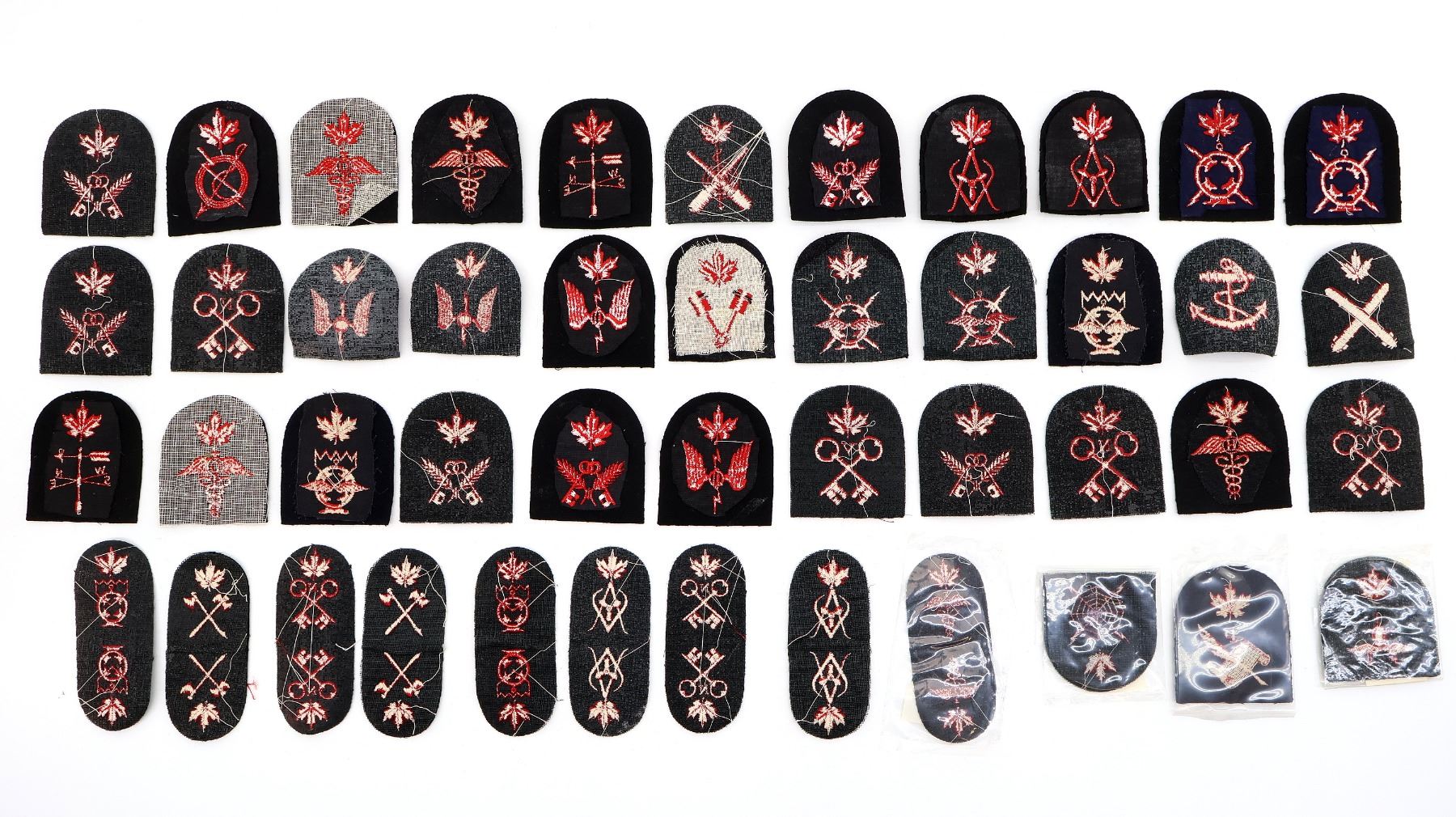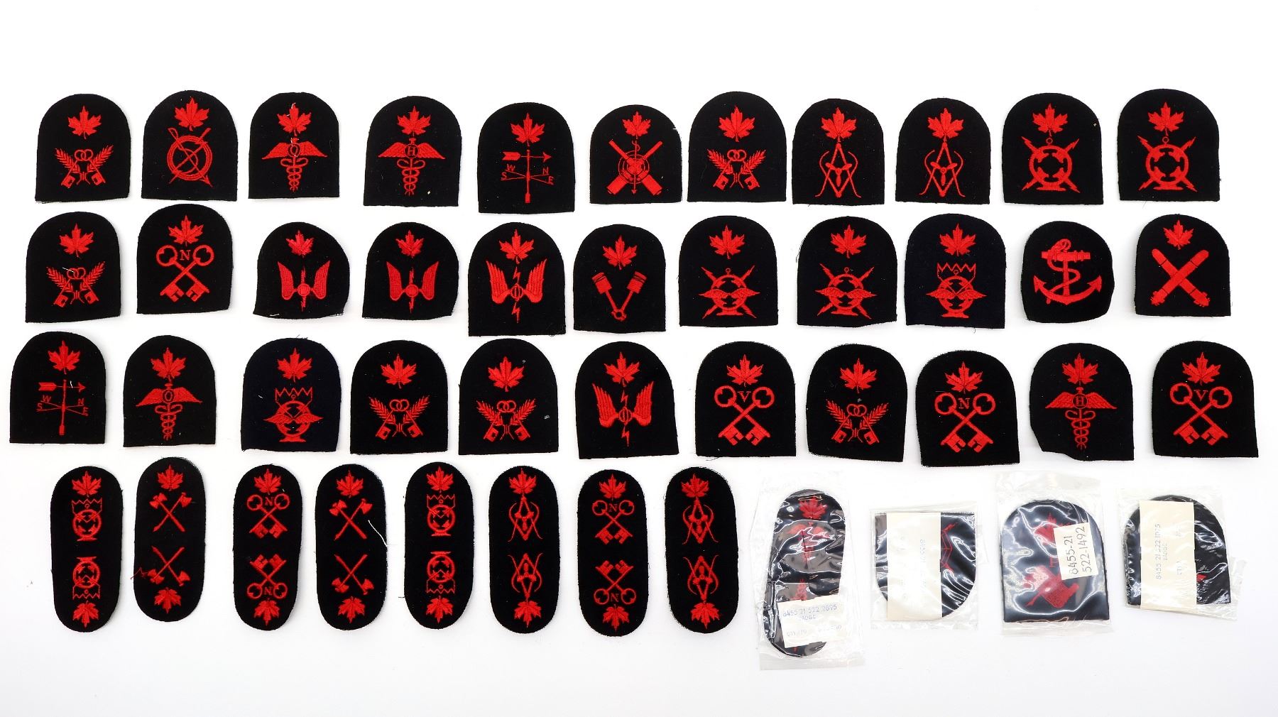 APPROX. (45) PIECES, VARIOUS SIZES, RED / BLACK, SOME NEW OLD STOCK, INCLUDES; AIR ELECTRONIC TECHNICIAN, FIRECONTROLMAN, HULL TECHNICIAN, METEOROLOGIST'S MATE, OPERATING ROOM ASSISTANT, HYGIENE ASSISTANT, RADAR PLOTTER (NEW OLD STOCK), RADIOMAN, RADIOMAN SPECIAL, SONARMAN, ETC. SEE PHOTOS.