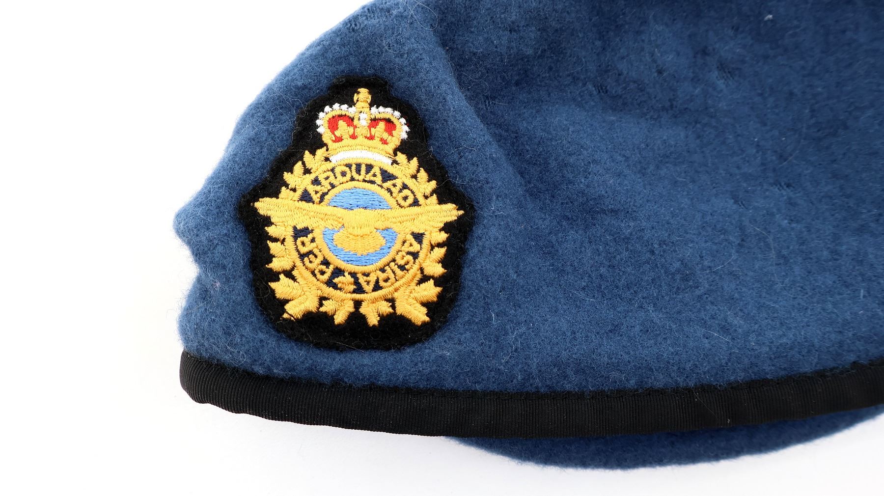 APPROX. (18) PIECES, VARIOUS SIZES / COLOURS / MATERIALS, INCLUDES; TRAINED AVIATOR SLIP-ON, BASIC AVIATOR SLIP-ON, CORPORAL SLIP-ON, MASTER CORPORAL SLIP-ON, CANADA FLAG BADGE, CORPORAL RANK CHEVRON, RCAF BLUE WOOL BERET, ETC. SEE PHOTOS.
