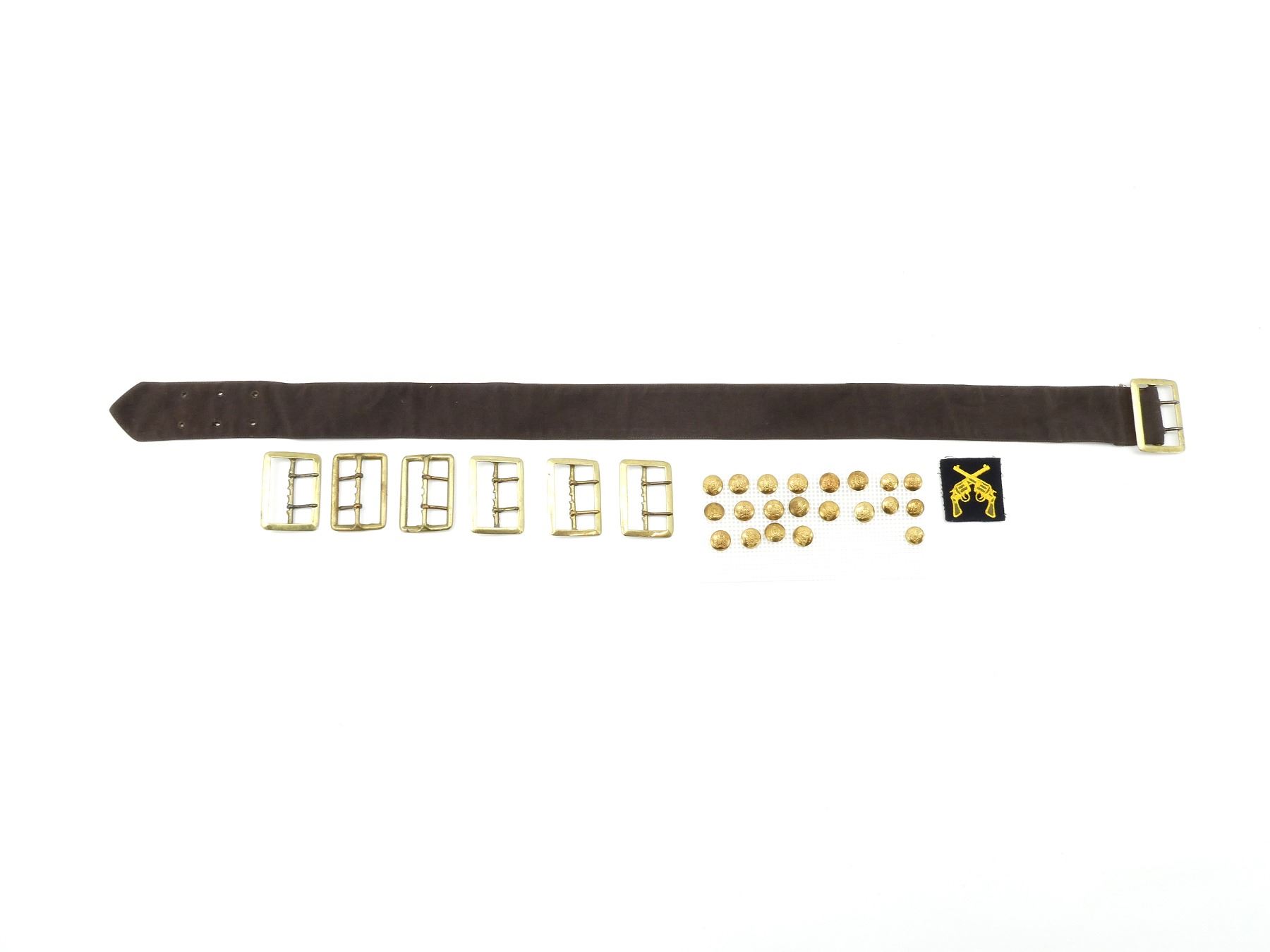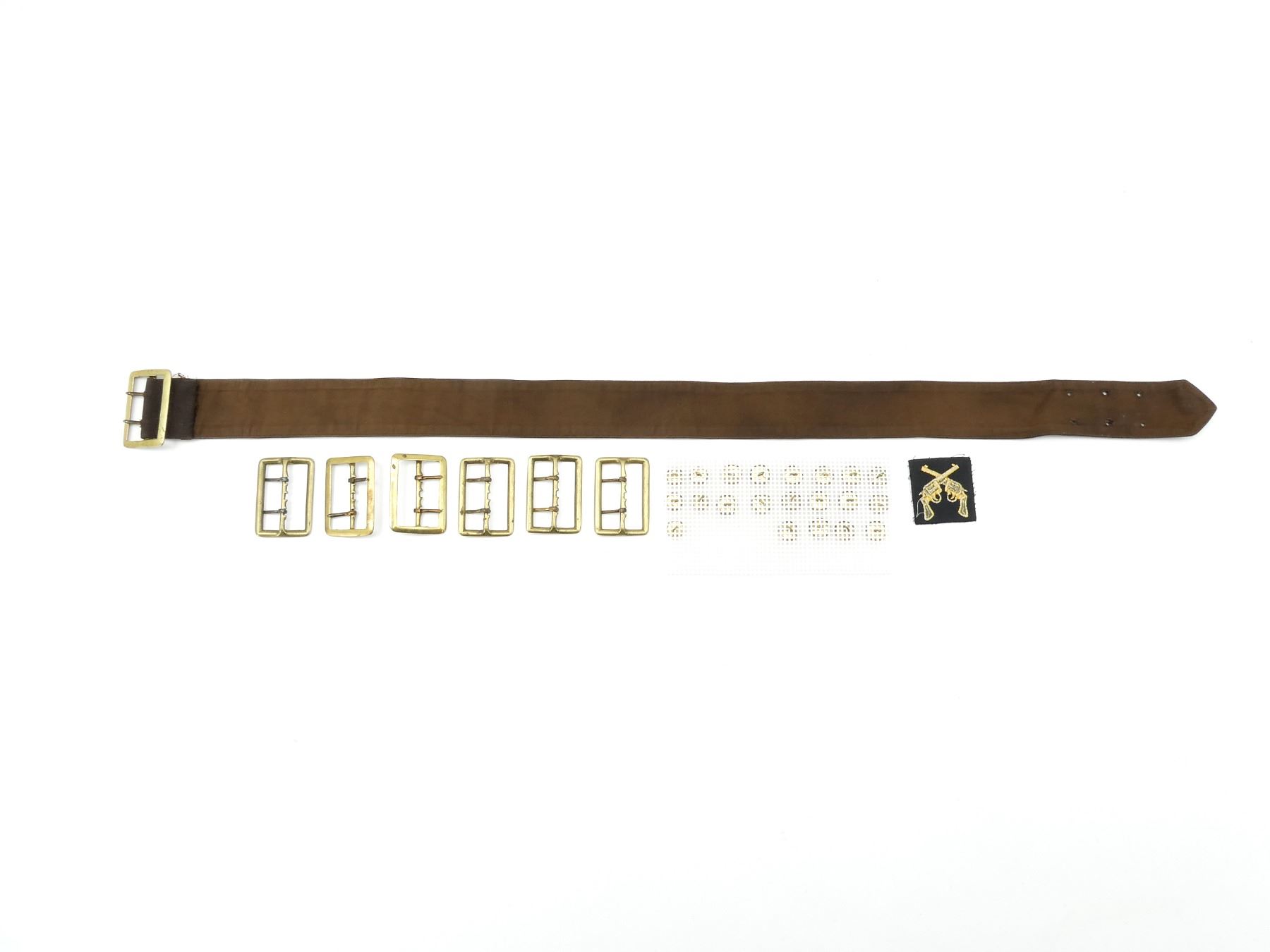 LOT INCLUDES; (1) BROWN CLOTH BELT WITH BRASS BUCKLE, NO VISIBLE MARKINGS, OVERALL LENGTH APPROX. 39", (1) PISTOL MARKSMANSHIP BADGE, (6) SQUARED BRASS BELT BUCKLES, NO VISIBLE MARKINGS, APPROX. 2.75" X 2", (16) LARGE BRASS RCMP BUTTONS, QUEEN'S CROWNS & (5) SMALL BRASS RCMP BUTTONS, QUEEN'S CROWNS. SEE PHOTOS.