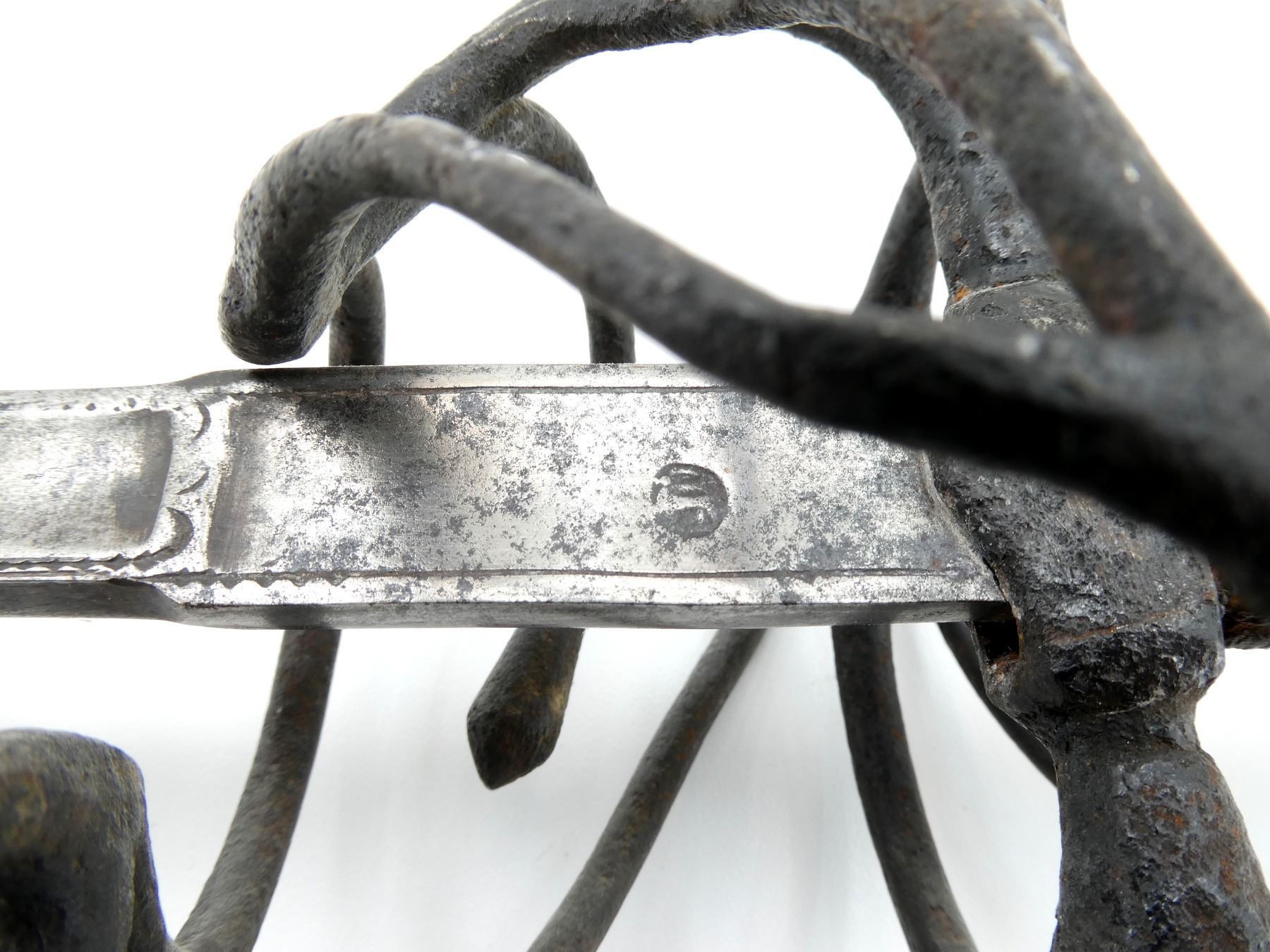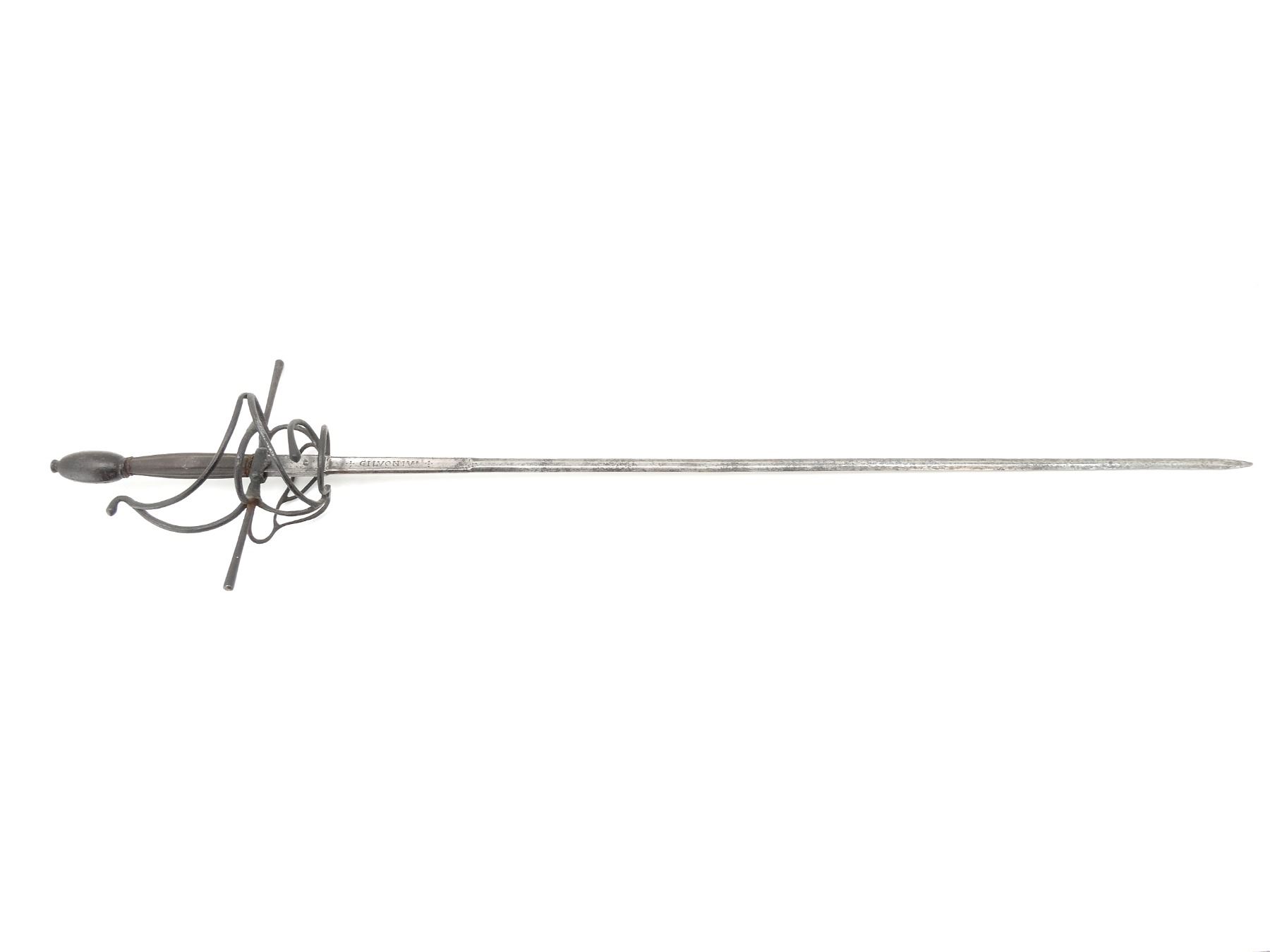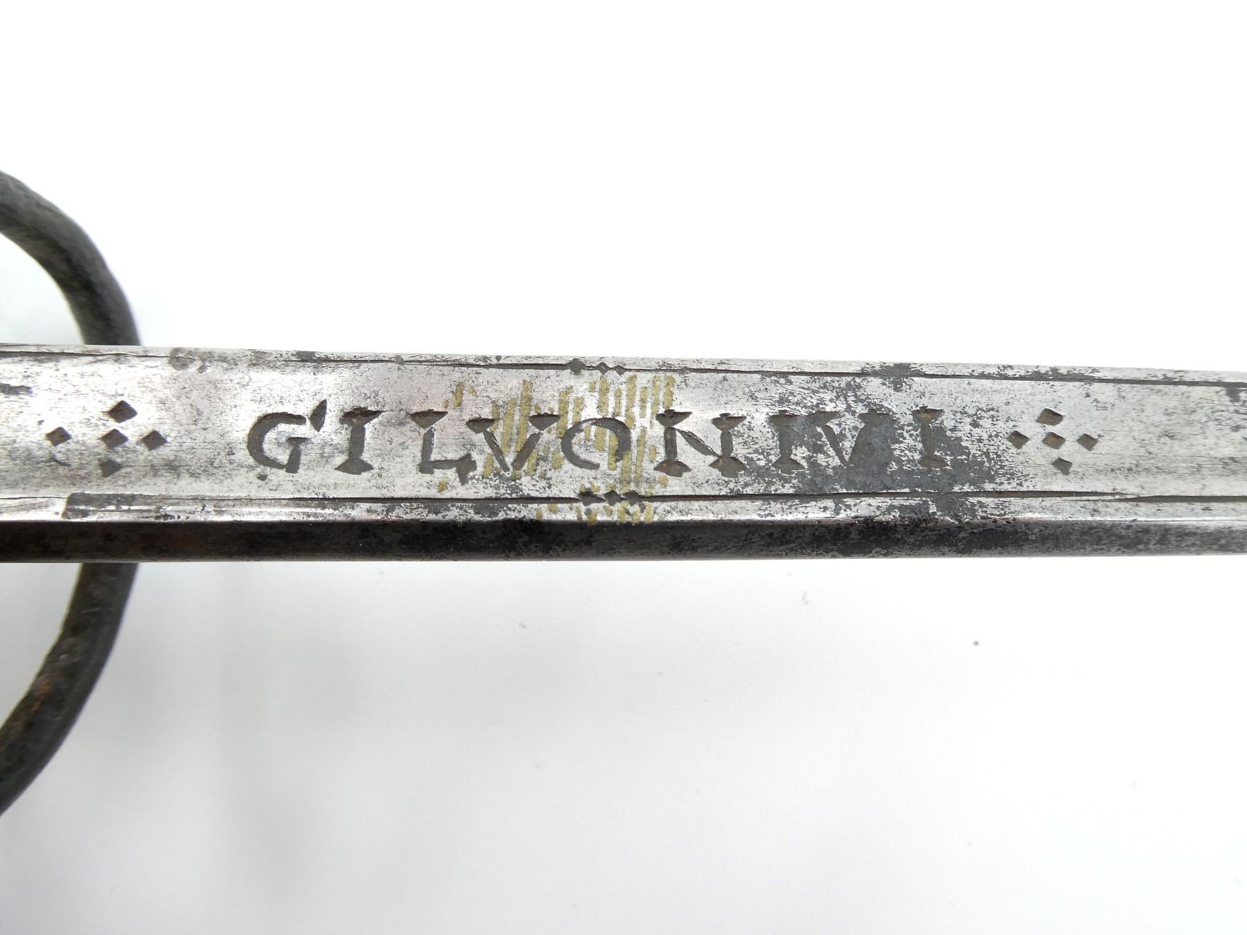 (1) STRAIGHT THIN DOUBLED-EDGED GENTLY TAPERING FULLERED BLADE, RICASSO STAMPED WITH A STAG IN A CIRCULAR SHAPE (BERNS MEVES MAKER MARK) ON BOTH SIDES, BLADE MARKED: "GILVONIVI" WITH DECORATIVE BORDER / DIAMOND SHAPES ON BOTH SIDES, HILT SHOWS LIGHT PITTING / BLACKENED OVERALL, DECORATIVE SWIRLED HILT, NO VISIBLE MARKINGS, 1-PIECE WIRE WRAPPED GRIP, GRIP IS SLIGHTLY LOOSE / WIGGLES, OVULAR METAL POMMEL, IS LOOSE / WIGGLES, NO VISIBLE MARKINGS, NO SCABBARD, BLADE APPROX. 37.25" & OVERALL LENGTH APPROX. 44.75". SEE PHOTOS.