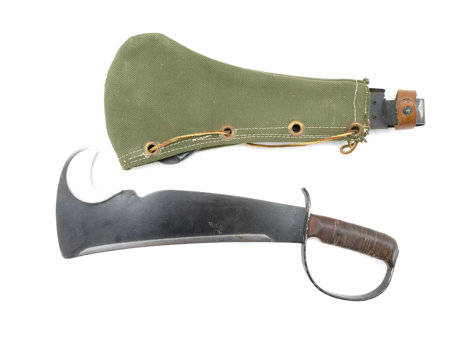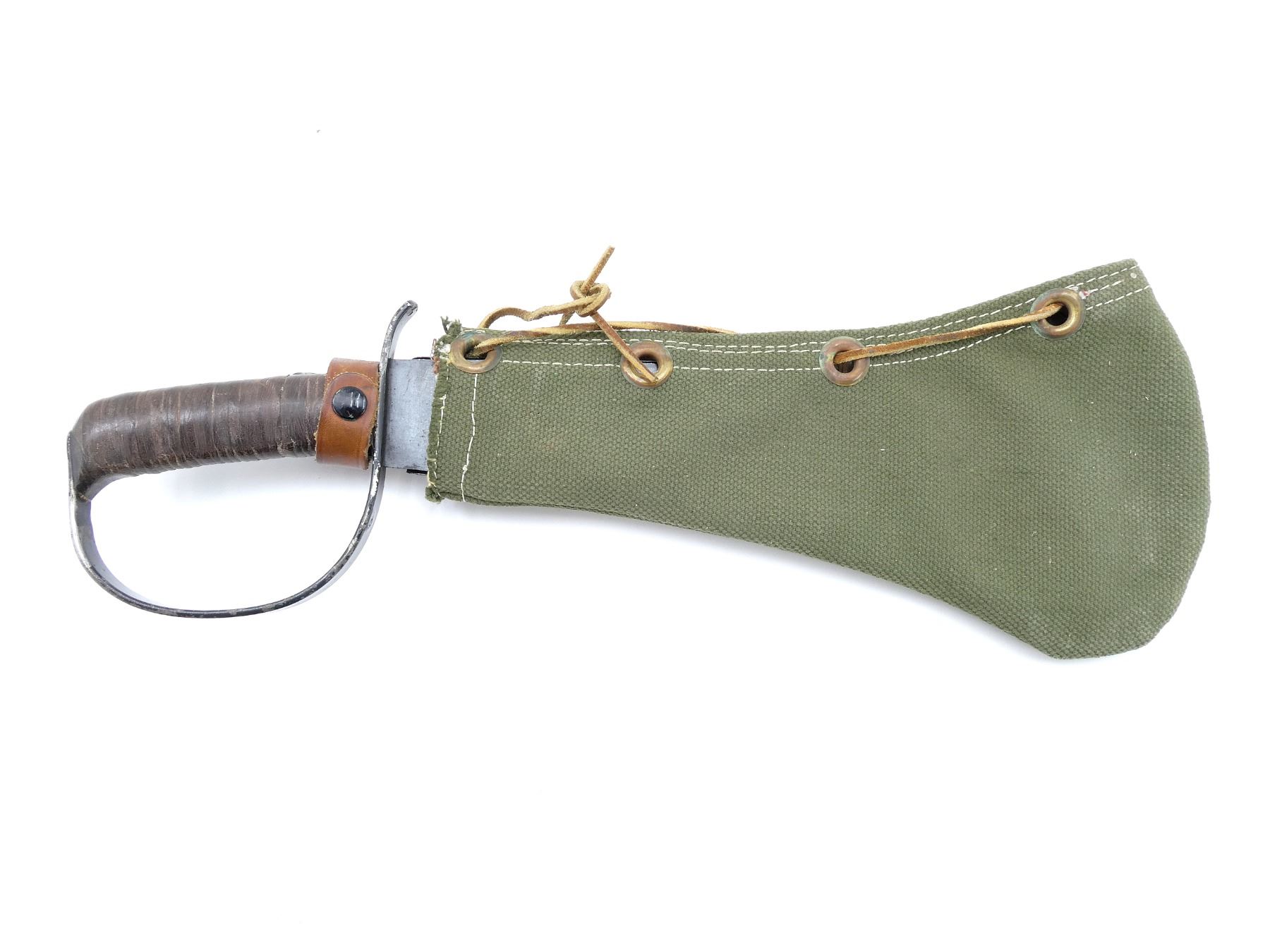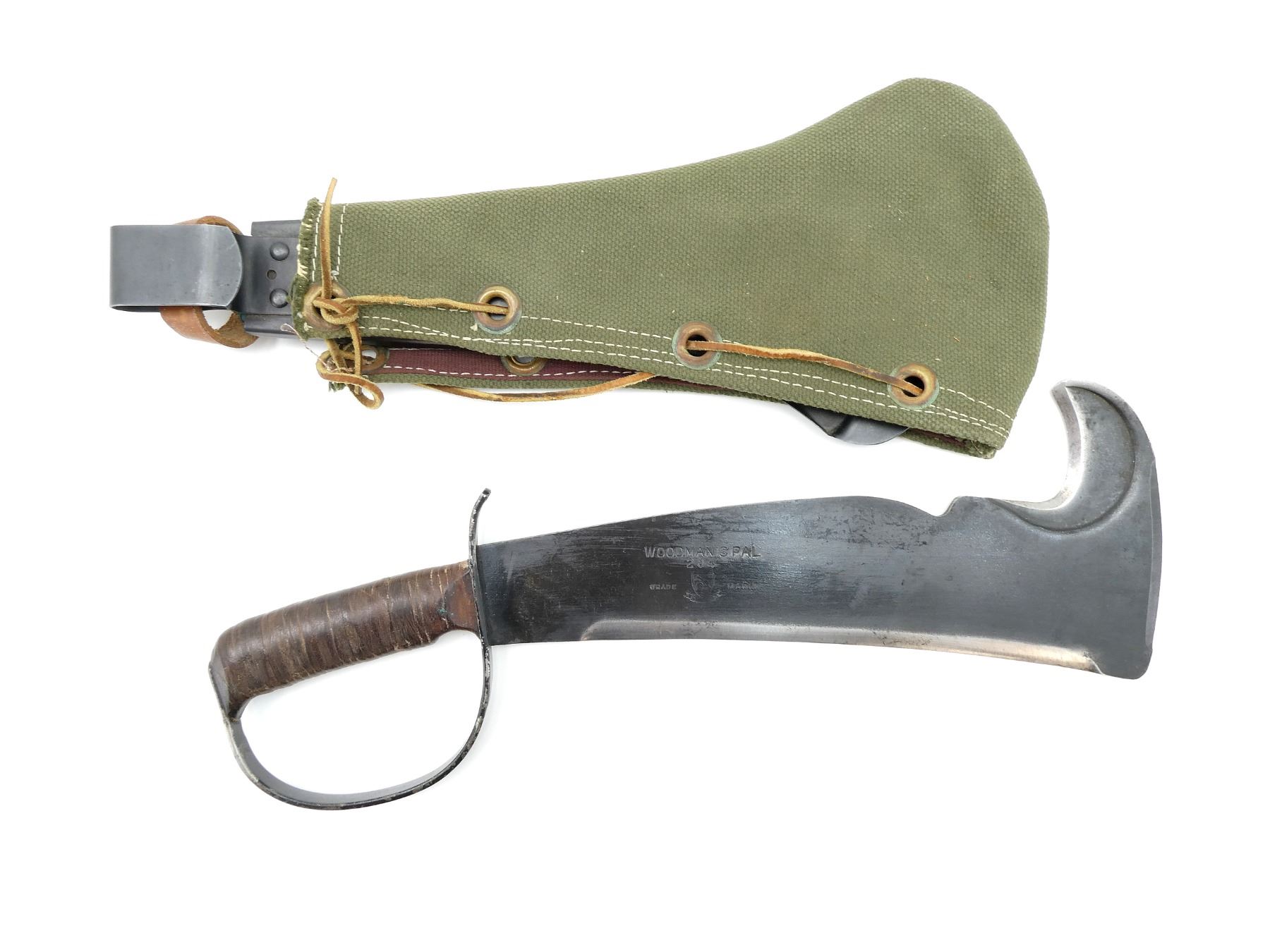 (1) SURVIVAL AXE BLADE MARKED: "WOODMAN'S PAL, 284, TRADE", VICTOR TOOL LOGO, "MARK", VARIOUS BLADE EDGES, LEATHER WASHER GRIP WITH THUMB GROOVE, BLACK PAINTED STEEL D-SHAPED HAND-GUARD MARKED: "LC-14-B", BLUED STEEL SCABBARD WITH LEATHER STRAP, NO VISIBLE MARKINGS, GREEN CANVAS COVER WITH BRASS GROMMETS / LEATHER THONG, NO VISIBLE MARKINGS, BLADE APPROX. 12" & OVERALL LENGTH APPROX. 16.5". SEE PHOTOS.