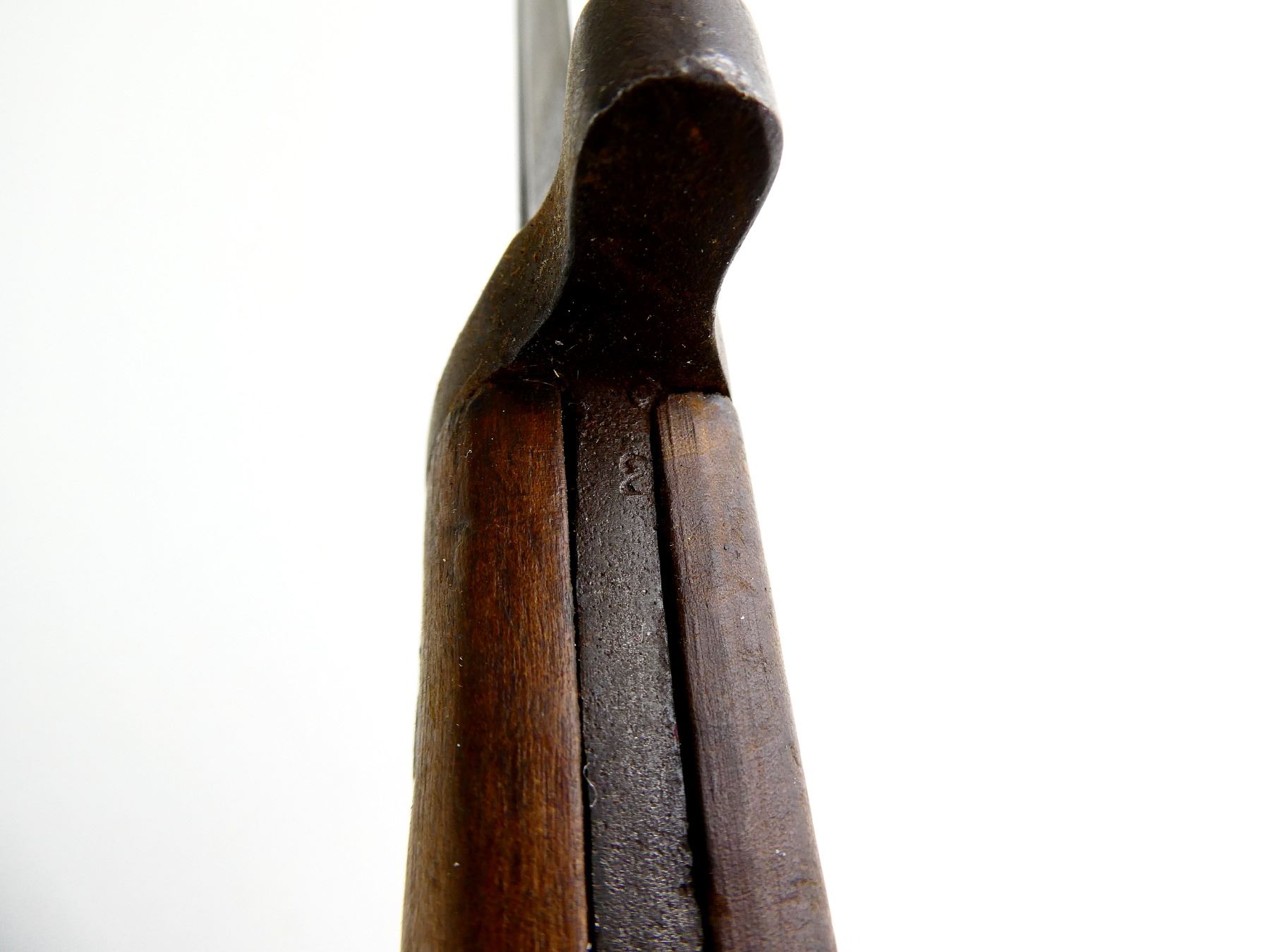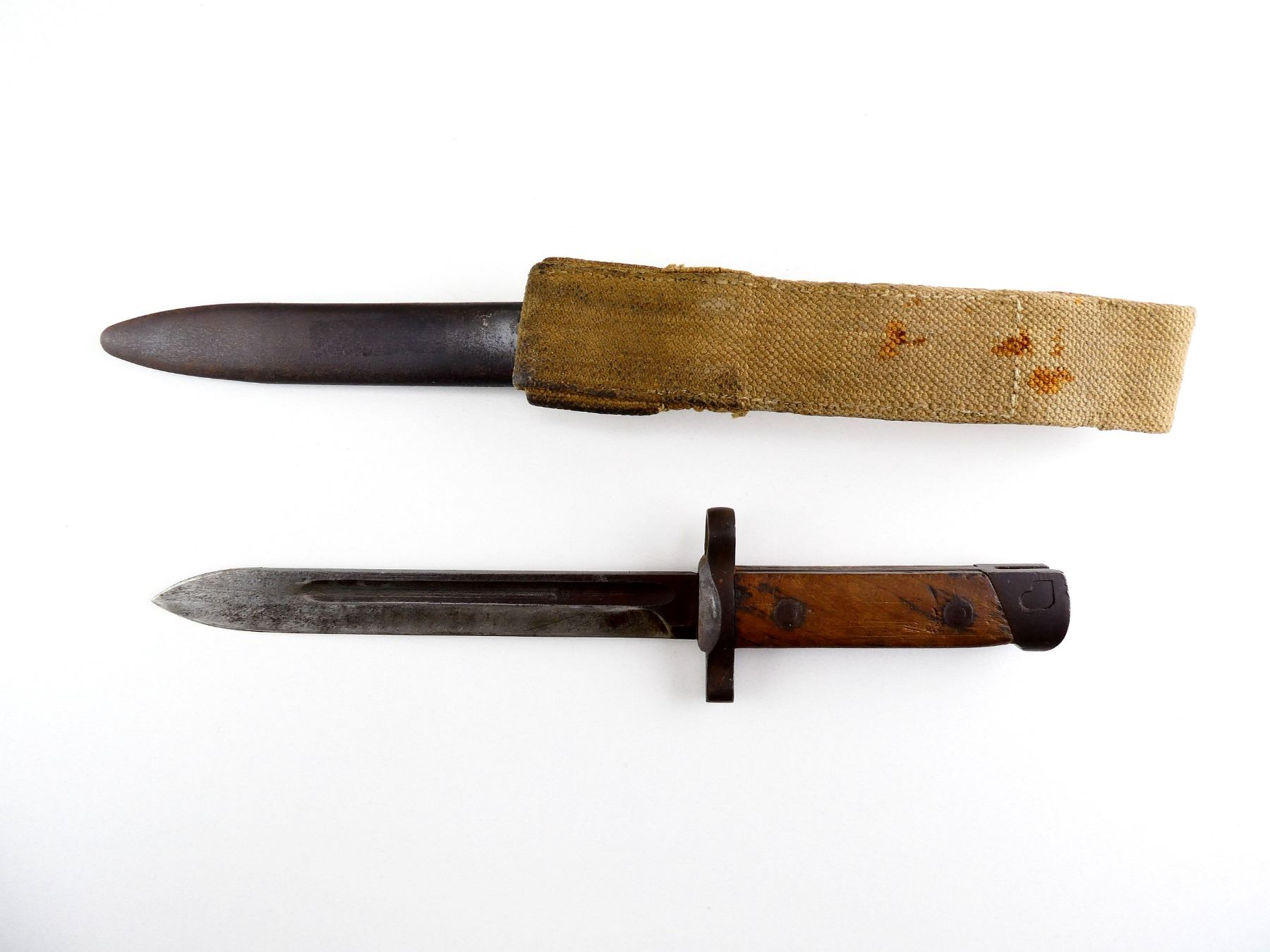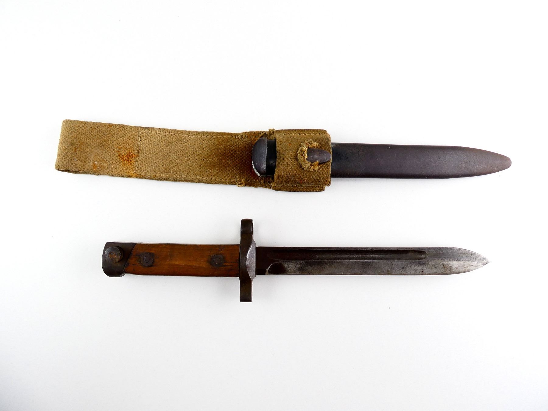 (1) FITS 6.5MM & 7.35MM M1938 MANNLICHER-CARCANO SHORT RIFLES, FIXED BLADE, MADE USING NEWER M1938 CARCANO BAYONET PARTS, 2-PIECE WOOD GRIP, METAL IN-BETWEEN WOOD MARKED: "1" FAINT / UN-CLEAR CIRCULAR PROOF MARK, "C 95646", METAL POMMEL, NO VISIBLE MARKINGS, METAL SCABBARD WITH TAN CANVAS FROG, NO VISIBLE MARKINGS, BLADE APPROX. 7", OVERALL LENGTH APPROX. 11 3/8". SEE PHOTOS.