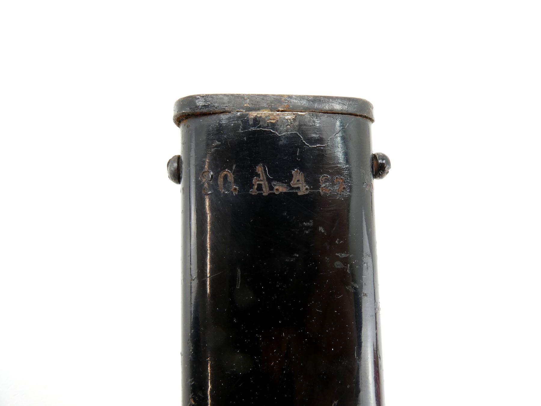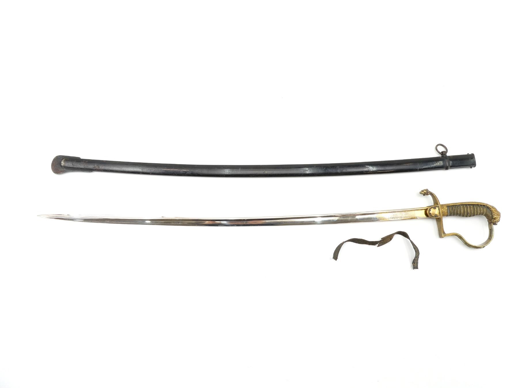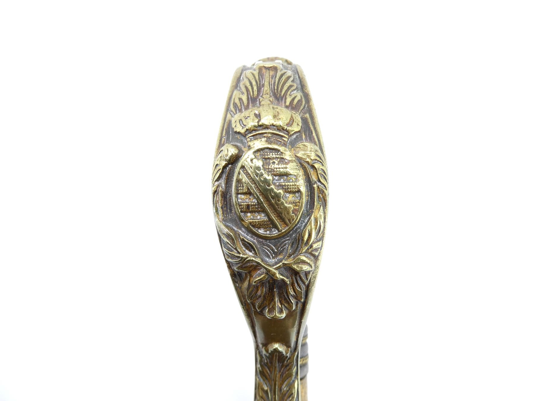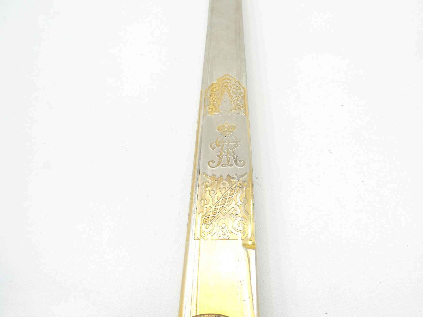 (1) SLIGHTLY CURVED BLADE, DOUBLED-EDGED NEAR TIP, BLADE ETCHED / GILDED ROYAL CYPHER CROWN OVER "FAR" (KING FRIEDRICH AUGUST III 1904-1918) WITH VARIOUS DECORATIVE ETCHINGS, OTHER-SIDE RICASSO MARKED WITH TWO SEATED SQUIRRELS BACK-TO-BACK OVER "C.E.", BLADE ETCHED / GILDED CROWN OVER ROYAL COAT OF ARMS WITH MOTTO "PROVIDENTAE MEMOR" OVER "EISENHAUER" WITH VARIOUS DECORATIVE ETCHINGS, BRASS CROSS-PIECE WITH SHEATH-GUARD WINGS / LANGUETS, DECORATED ON FRONT SIDE WITH CROSSED CANNONS, OTHER-SIDE WITH SHIELD LIKE SHAPE, QUILLON SHAPED AS A LION'S HEAD, BAND UNDER CROSS-PIECE WITH DECORATIVE FLORAL DESIGNS, HILT / GUARD WITH ROYAL COAT OF ARMS UNDER CROWN, BLACK BRASS WIRE WRAPPED GRIP, PIECE OF LEATHER PORTAPEE REMAINS, POMMEL SHAPED AS LION'S HEAD WITH RED EYES, BRASS DECORATIVE BACKING ON GRIP, BLACK PAINTED METAL SCABBARD, UNDER THROAT MARKED: "30. A. 427", ONE HANGER LOOP, BLADE APPROX. 32" & OVERALL LENGTH APPROX. 37.5". SEE PHOTOS.