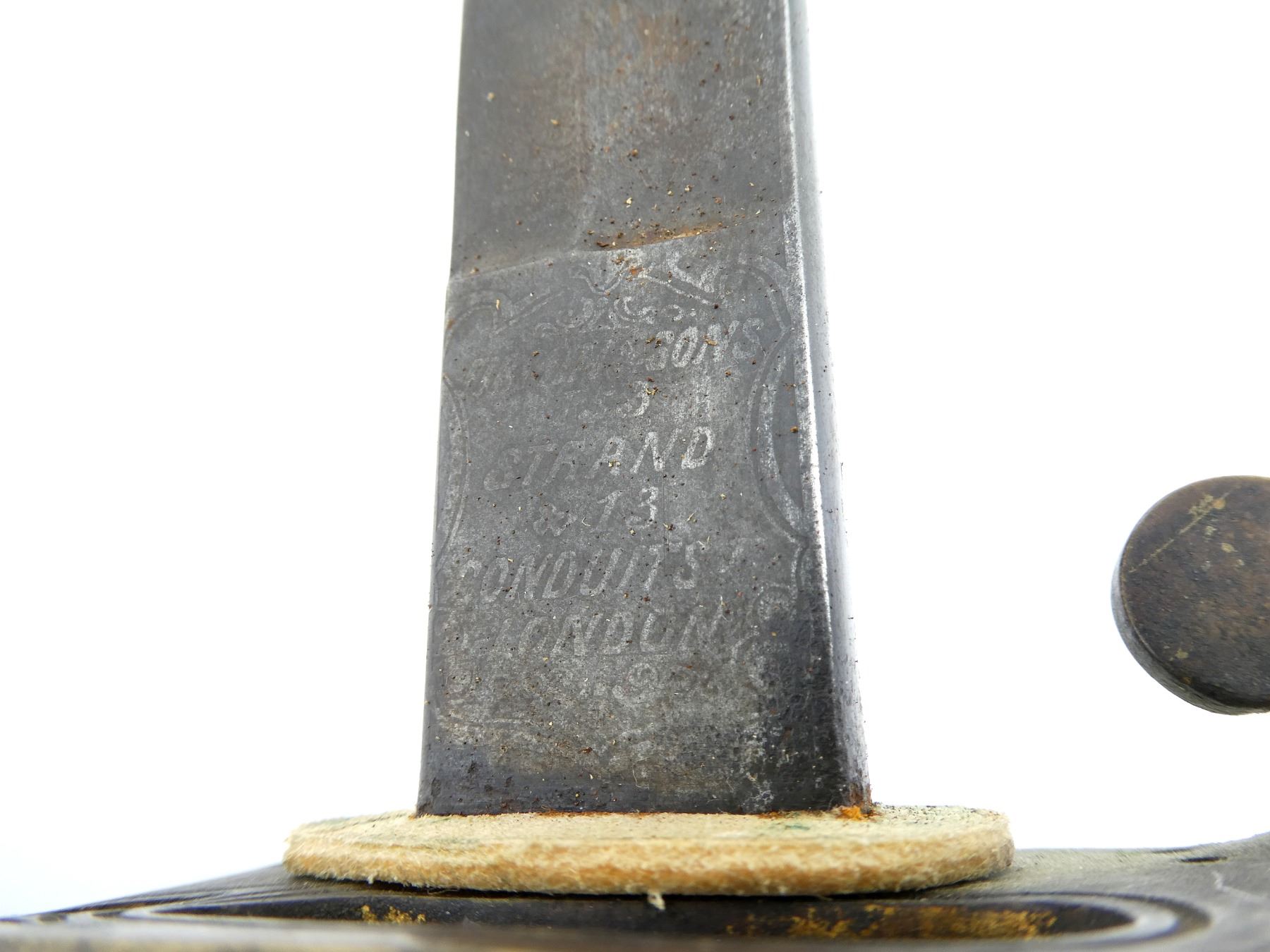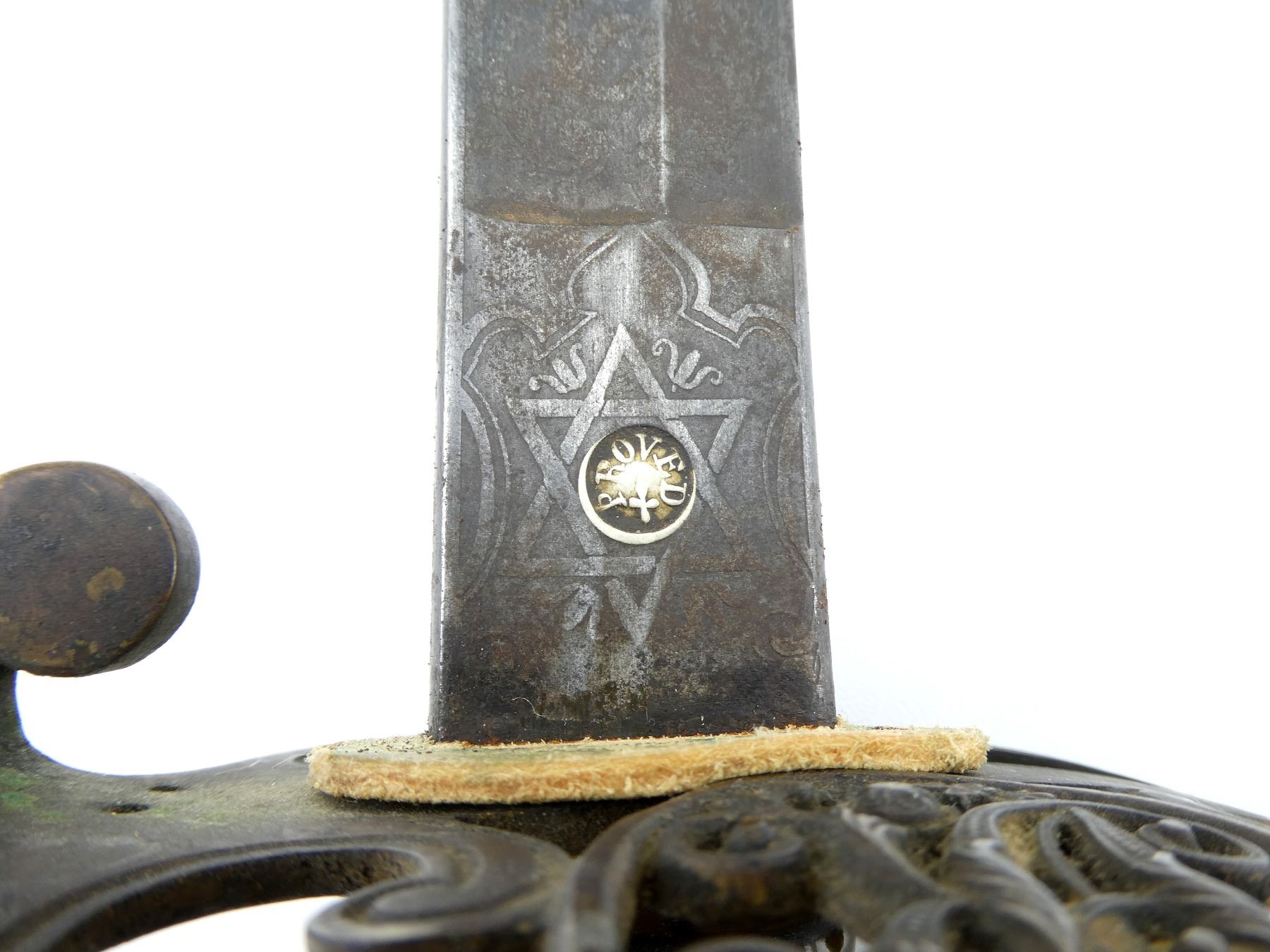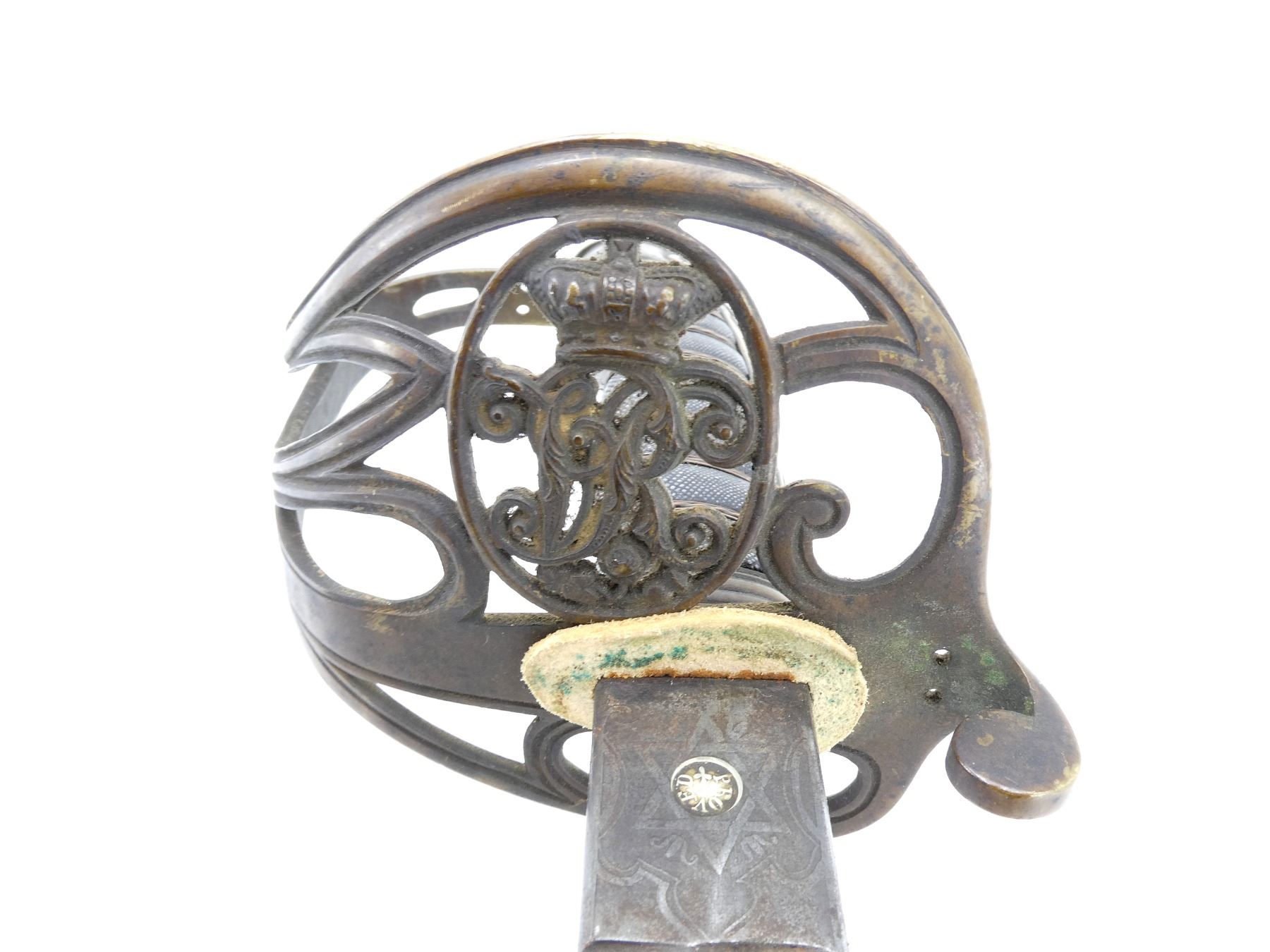 (1) SLIGHTLY CURVED PARTIALLY FULLERED SINGLE-EDGED BLADE, RICASSO ACID ETCHED: "FIRMIN & SONS, 153, STRAND, & 13, CONDUIT ST, LONDON", OTHER-SIDE MARKED WITH STAR SHAPE WITH EMBLEM MARKED: "PROVED" IN THE CENTER, BLADE ACID ETCHED: VICTORIAN CROWN OVER FAINT CYPHER, WITH VARIOUS DECORATIVE FLORAL DESIGNS, OTHER-SIDE FAINTLY ACID ETCHED: "CANADA" OVER BEAVER OVER "MILITIA" WITH VARIOUS DECORATIVE FLORAL DESIGNS, LEATHER BUFFER PAD / WASHER, DECORATIVE BRASS HILT WITH CROWN OVER "VR" CYPHER, BLACK WIRE WRAPPED GRIP, BRASS GRIP BACKING, BRASS POMMEL, NO VISIBLE MARKINGS, STEEL SCABBARD WITH TWO LOOP HANGERS, NO VISIBLE MARKINGS, BLADE APPROX. 32 5/8" & OVERALL LENGTH APPROX. 38.25". SEE PHOTOS.