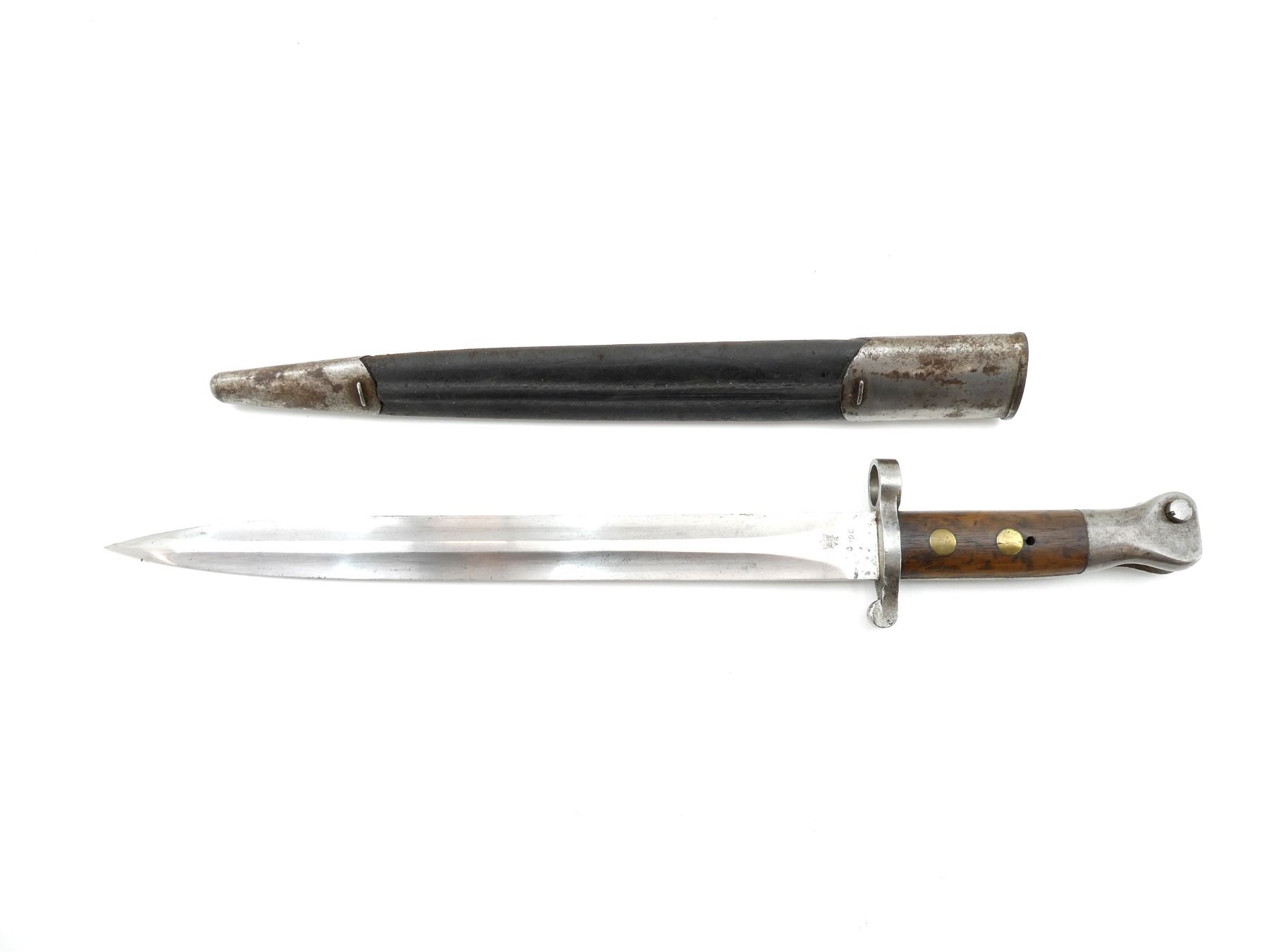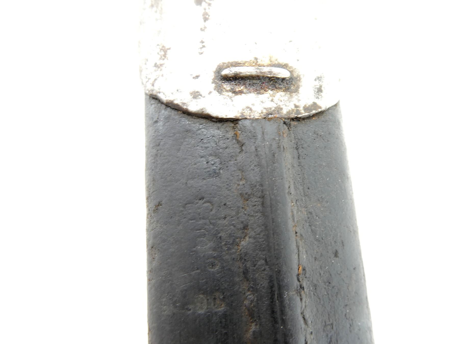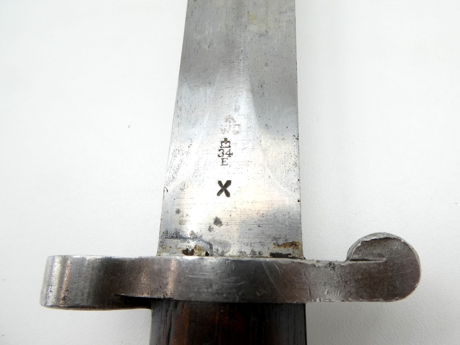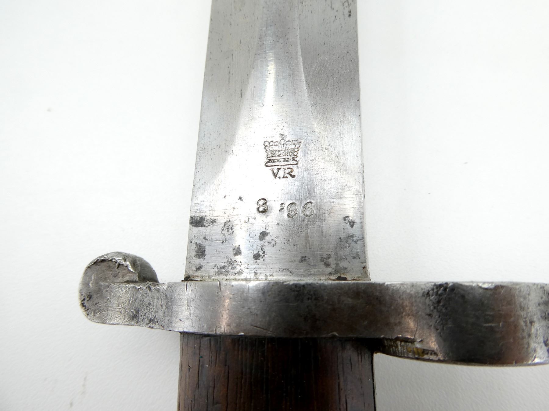 (1) FITS 1888 LEE METFORD & LONG LEE ENFIELD RIFLES, RICASSO MARKED: CROWN OVER "VR" OVER "8 '96", OTHER-SIDE MARKED: BROAD ARROW OVER "WD" OVER CROWN OVER "34" OVER "E" OVER "X (BEND TEST)", SPINE OF BLADE MARKED: CROWN OVER "16" OVER "E", 2-PIECE WOOD GRIP, METAL IN-BETWEEN GRIPS MARKED: CROWN OVER "10" OVER "M", OTHER-SIDE MARKED: "W", METAL POMMEL MARKED: "29" OVER "115", LEATHER & METAL SCABBARD, LEATHER MARKED: BROAD ARROW OVER "WD" OVER CROWN OVER "B" OVER "16" OVER " '96", STUD MARKED: "45" OVER "222", BLADE APPROX. 12 1/8" & OVERALL LENGTH APPROX. 16.75". SEE PHOTOS.