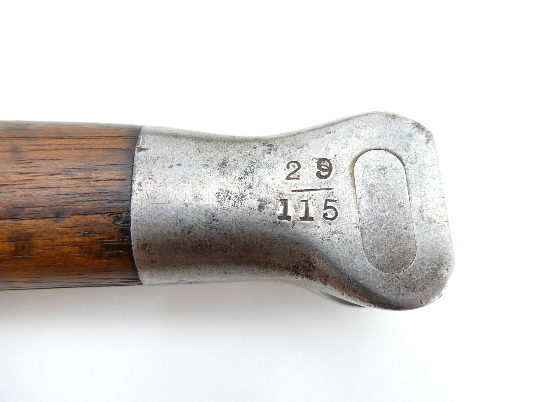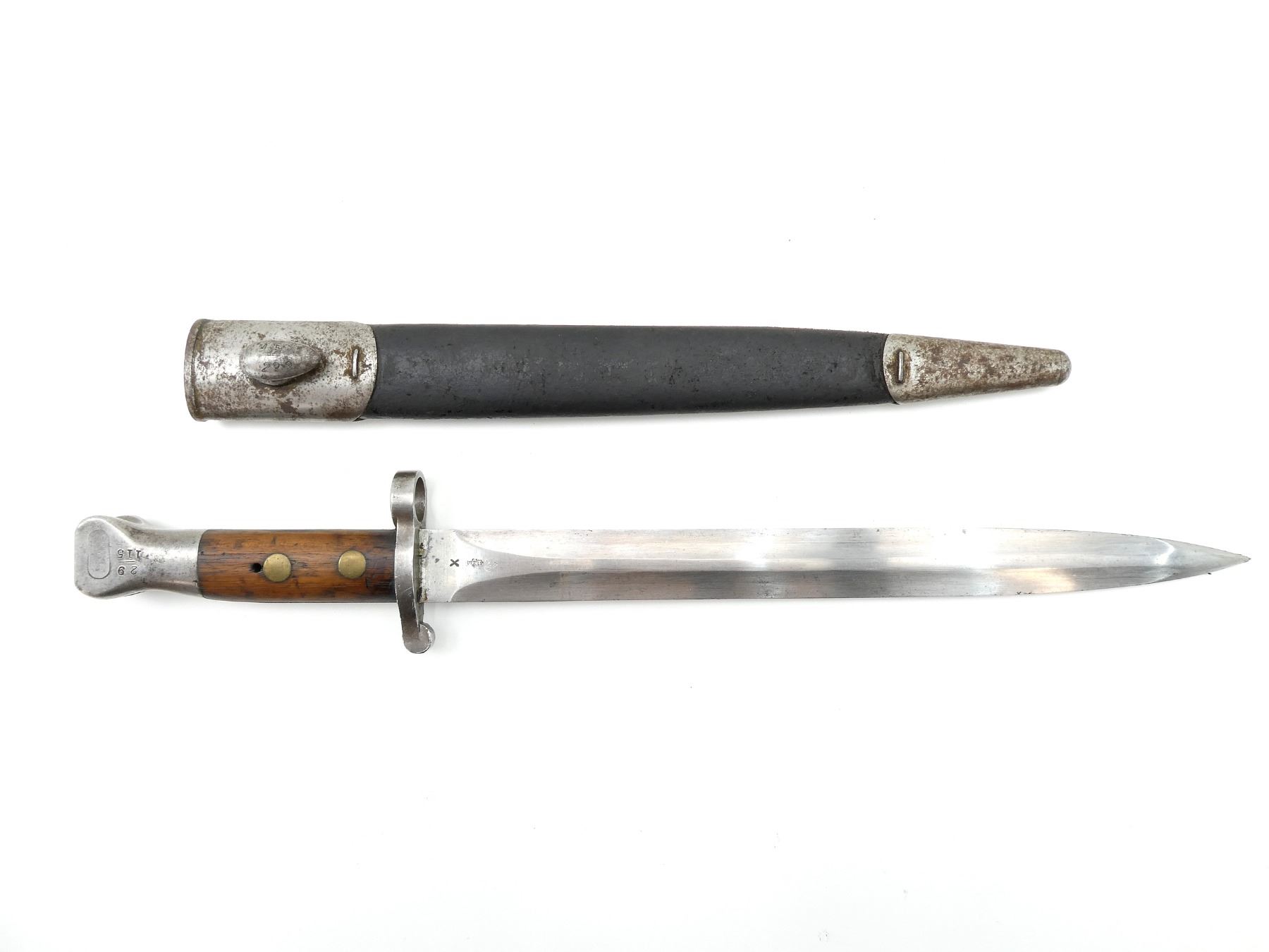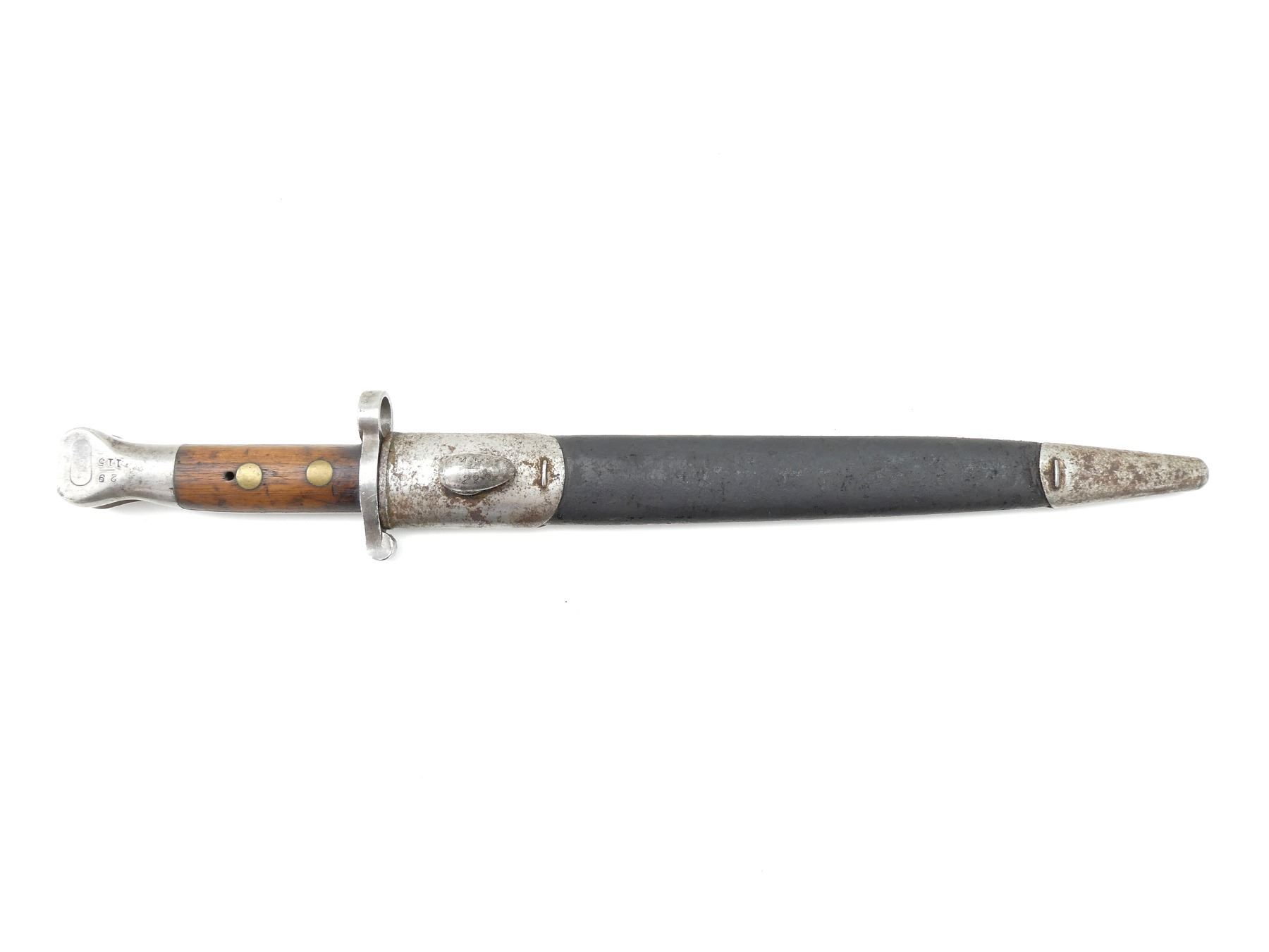 (1) FITS 1888 LEE METFORD & LONG LEE ENFIELD RIFLES, RICASSO MARKED: CROWN OVER "VR" OVER "8 '96", OTHER-SIDE MARKED: BROAD ARROW OVER "WD" OVER CROWN OVER "34" OVER "E" OVER "X (BEND TEST)", SPINE OF BLADE MARKED: CROWN OVER "16" OVER "E", 2-PIECE WOOD GRIP, METAL IN-BETWEEN GRIPS MARKED: CROWN OVER "10" OVER "M", OTHER-SIDE MARKED: "W", METAL POMMEL MARKED: "29" OVER "115", LEATHER & METAL SCABBARD, LEATHER MARKED: BROAD ARROW OVER "WD" OVER CROWN OVER "B" OVER "16" OVER " '96", STUD MARKED: "45" OVER "222", BLADE APPROX. 12 1/8" & OVERALL LENGTH APPROX. 16.75". SEE PHOTOS.