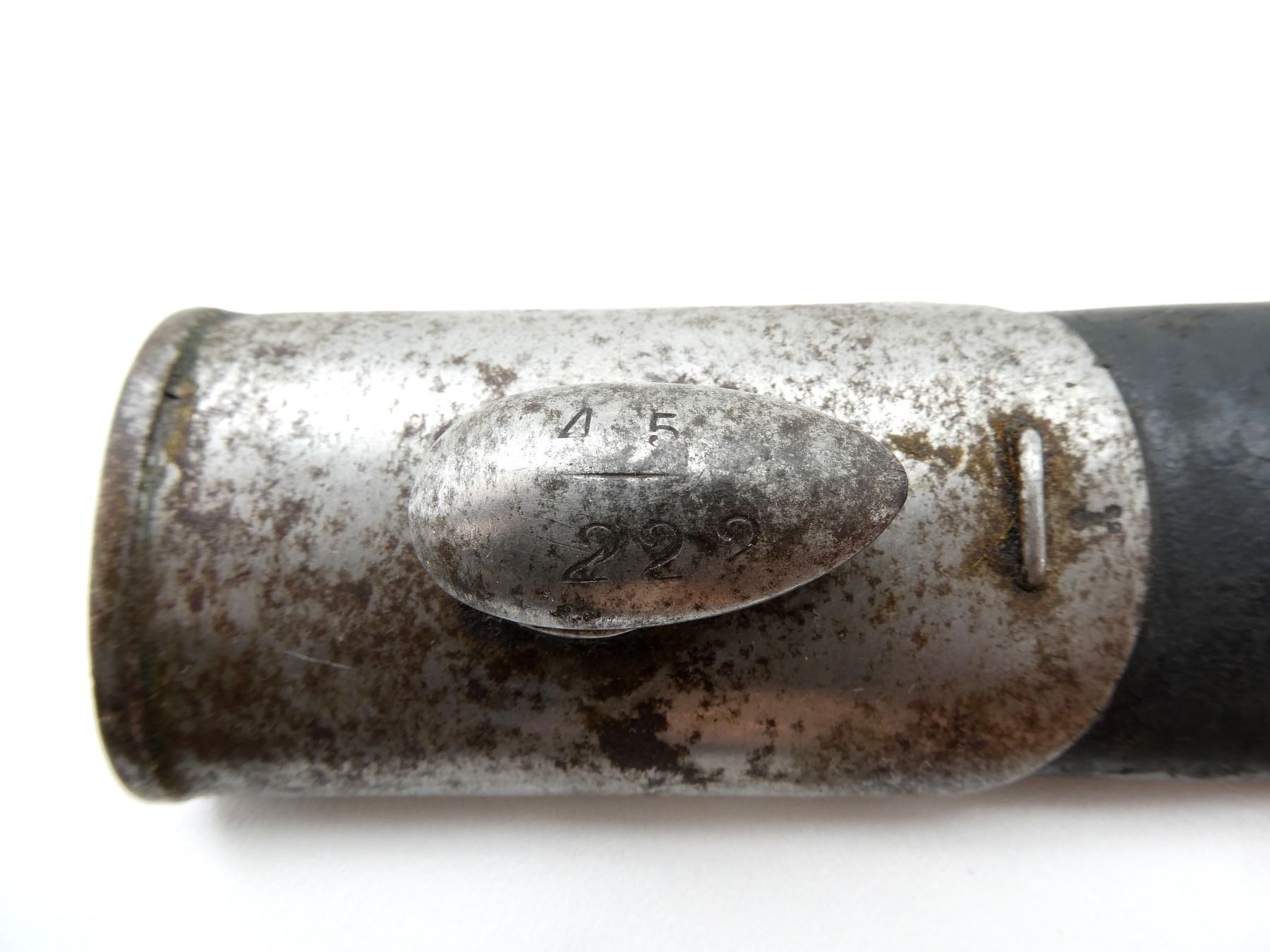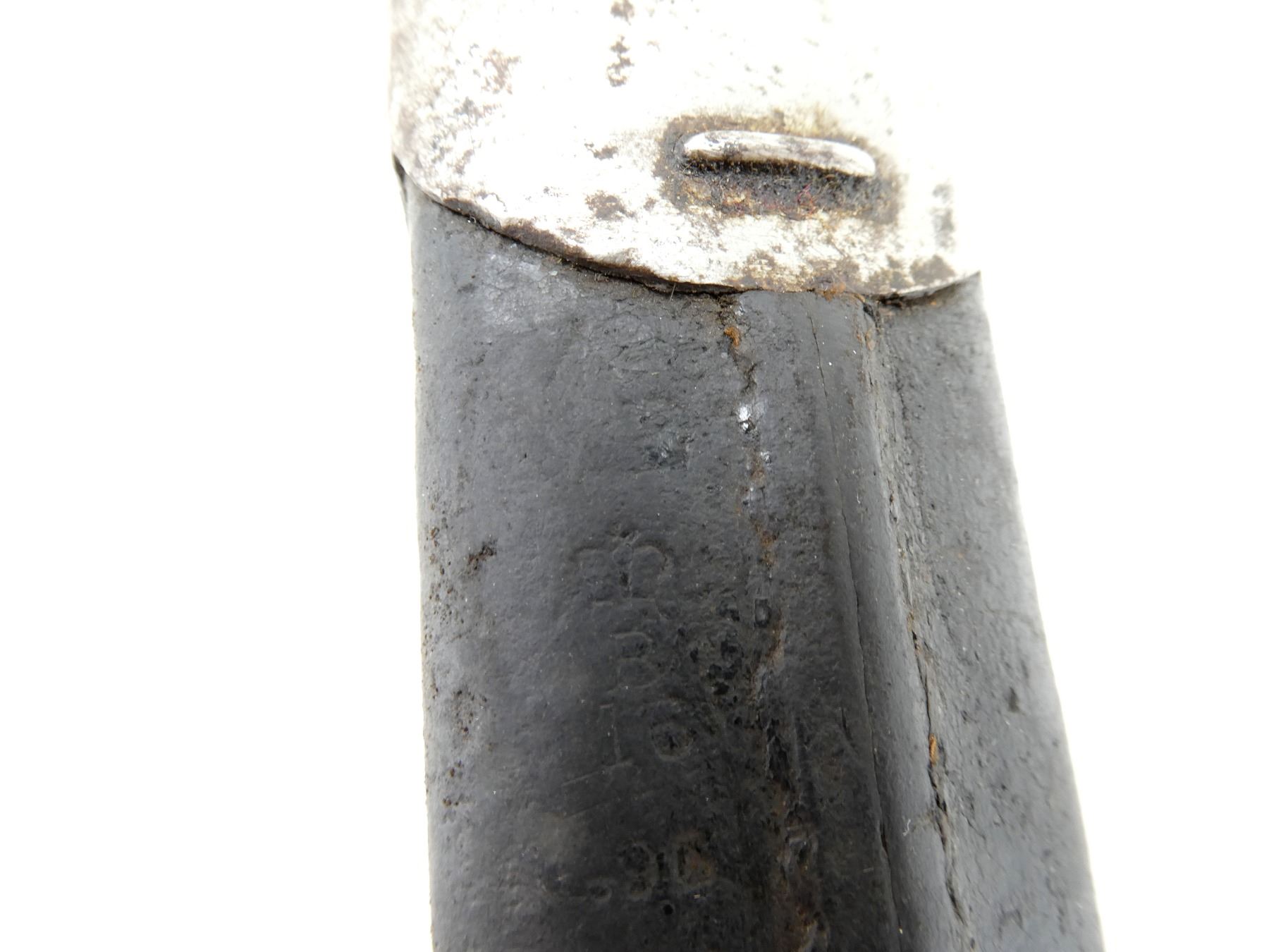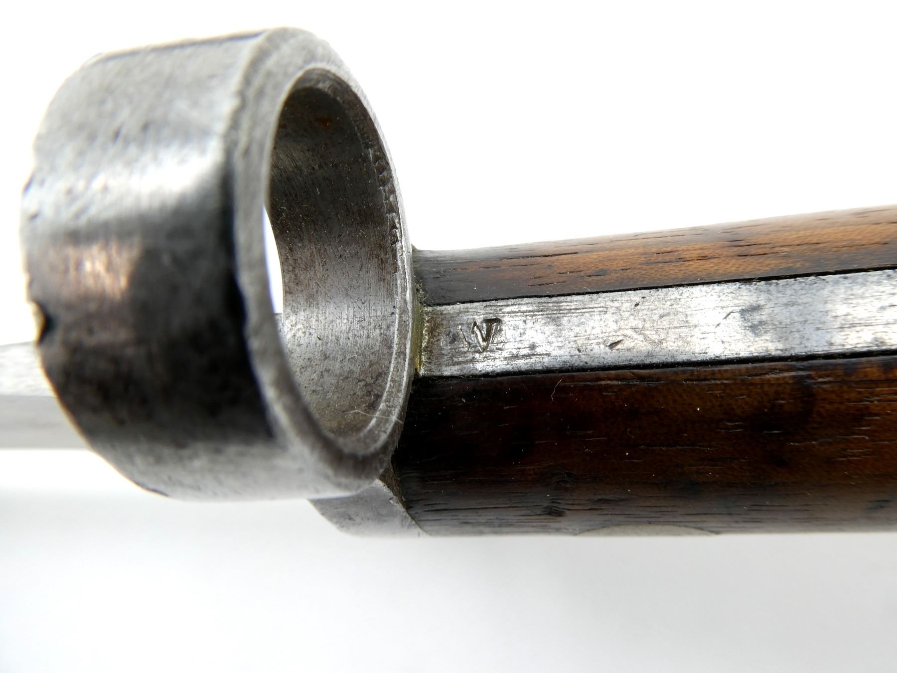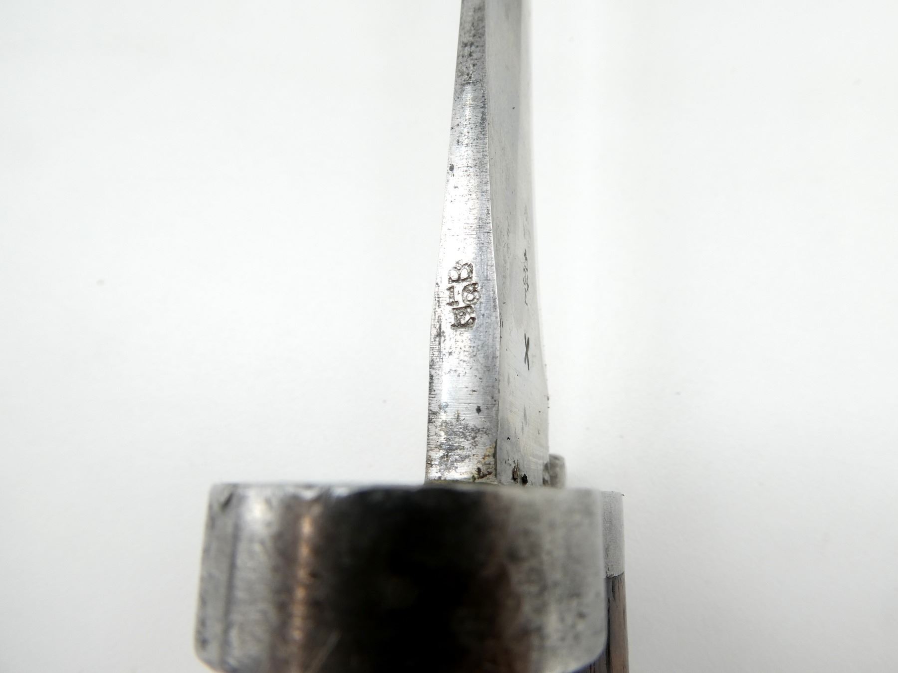 (1) FITS 1888 LEE METFORD & LONG LEE ENFIELD RIFLES, RICASSO MARKED: CROWN OVER "VR" OVER "8 '96", OTHER-SIDE MARKED: BROAD ARROW OVER "WD" OVER CROWN OVER "34" OVER "E" OVER "X (BEND TEST)", SPINE OF BLADE MARKED: CROWN OVER "16" OVER "E", 2-PIECE WOOD GRIP, METAL IN-BETWEEN GRIPS MARKED: CROWN OVER "10" OVER "M", OTHER-SIDE MARKED: "W", METAL POMMEL MARKED: "29" OVER "115", LEATHER & METAL SCABBARD, LEATHER MARKED: BROAD ARROW OVER "WD" OVER CROWN OVER "B" OVER "16" OVER " '96", STUD MARKED: "45" OVER "222", BLADE APPROX. 12 1/8" & OVERALL LENGTH APPROX. 16.75". SEE PHOTOS.