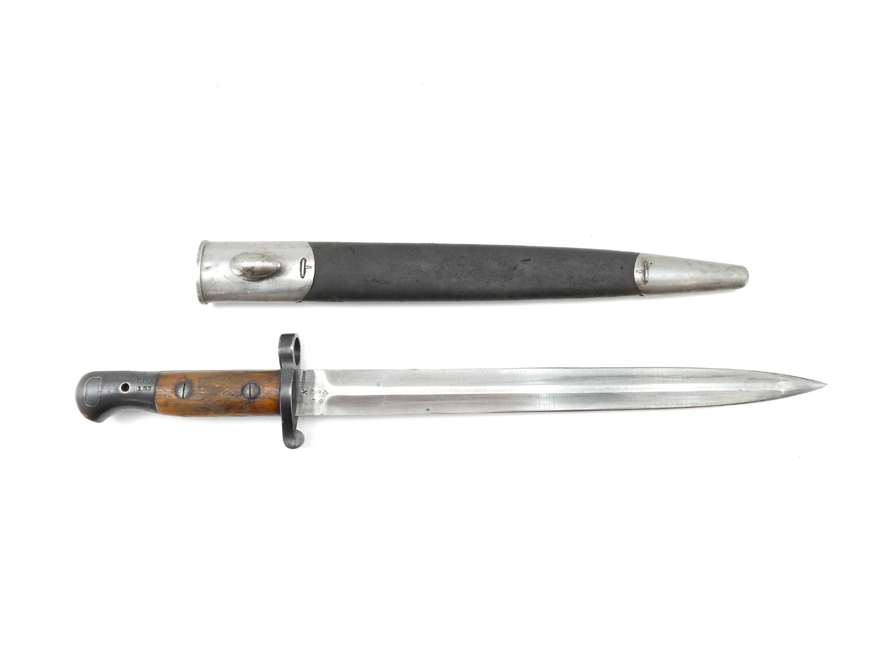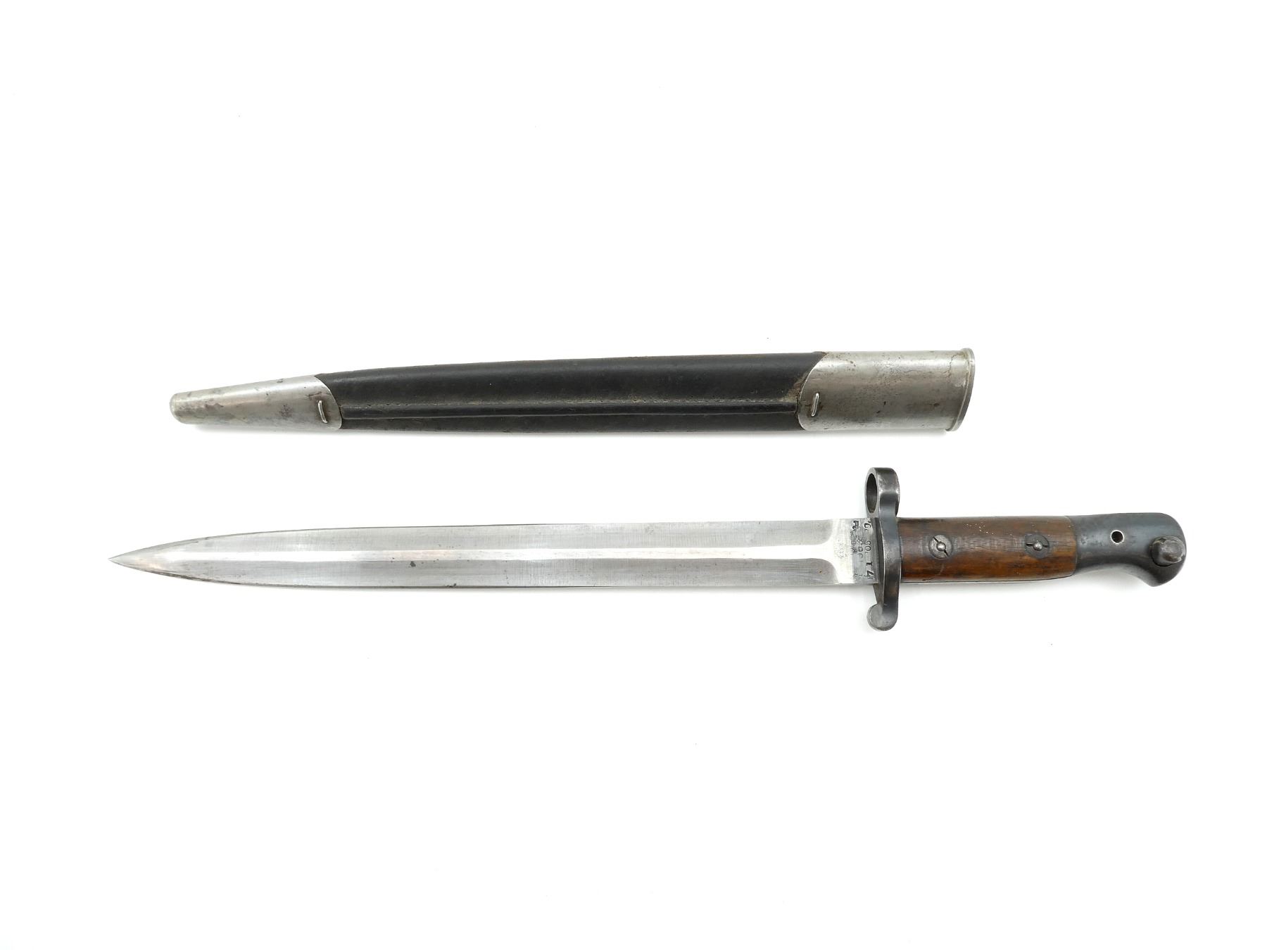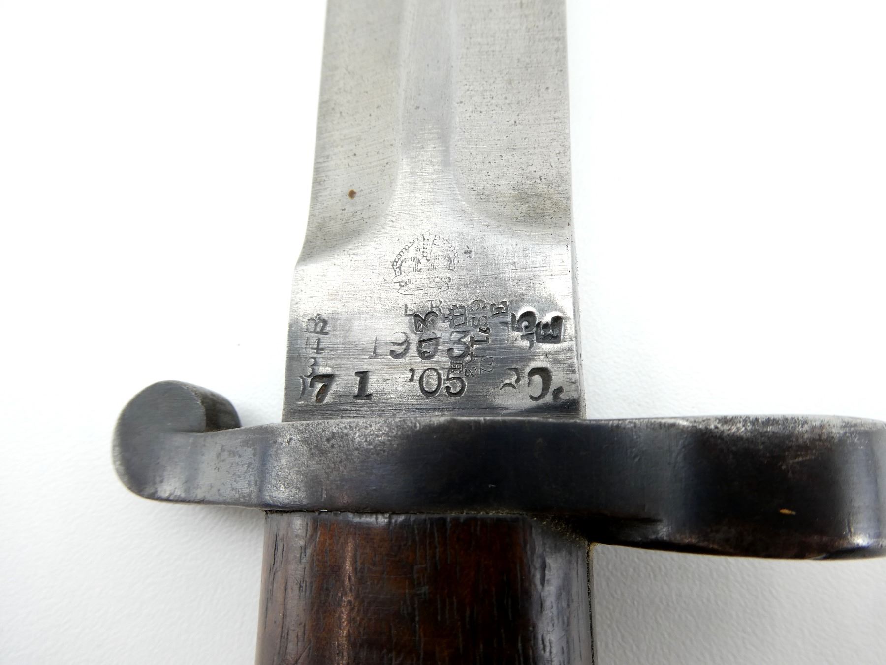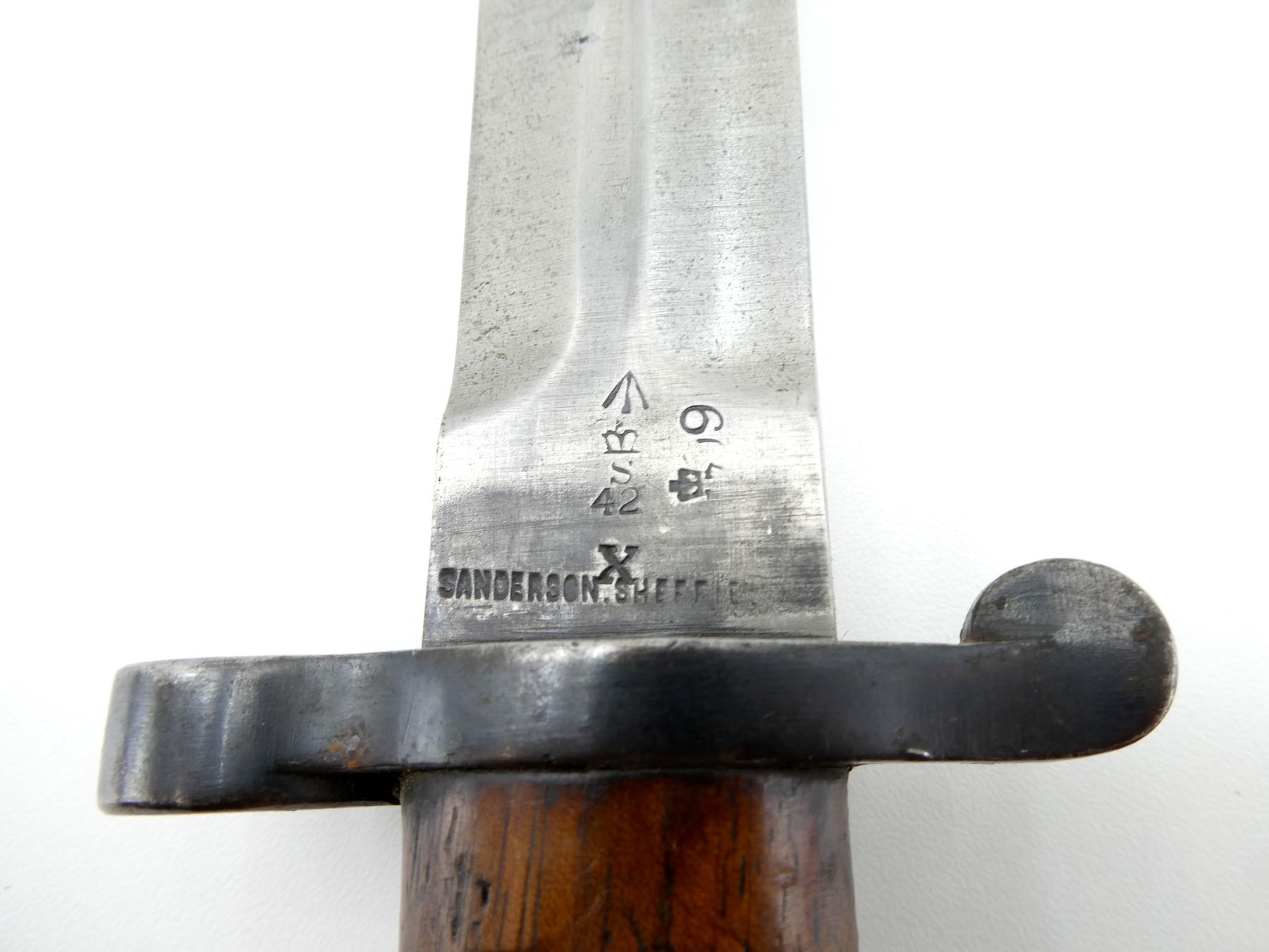 (1) FITS .303 CALIBER SHORT MAGAZINE LEE-ENFIELD NO.1 MKIII (SMLE) RIFLES, RICASSO MARKED: CROWN OVER "ER", OVER "1903" OVER "71, '05" WITH VARIOUS OTHER PROOF MARKS, OTHER-SIDE MARKED: BROAD ARROW OVER CROWN OVER "S" OVER "42" OVER "X (BEND TEST)" OVER "SANDERSON.SHEFFIE??", CROWN OVER "??", "?9", BLADE SPINE MARKED: "S" OVER "28" OVER CROWN OVER "S" OVER "42", 2-PIECE WOOD GRIPS, CHIPS IN WOOD GRIPS, METAL POMMEL MARKED: "RGA" OVER "132" (POSSIBLY ROYAL GARRISON ARTILLERY), BLACK LEATHER & METAL SCABBARD, LEATHER FAINTLY MARKED WITH CROWN PROOF MARK, " '96", THROAT MARKED: "7.69?" CROSSED OUT, "19", UNDER STUD MARKED: "14" OVER "H", OTHER-SIDE MARKED: "IL", METAL TIP END MARKED: CROWN OVER "14" OVER "H", BLADE APPROX. 12" & OVERALL LENGTH APPROX. 16.75". SEE PHOTOS.