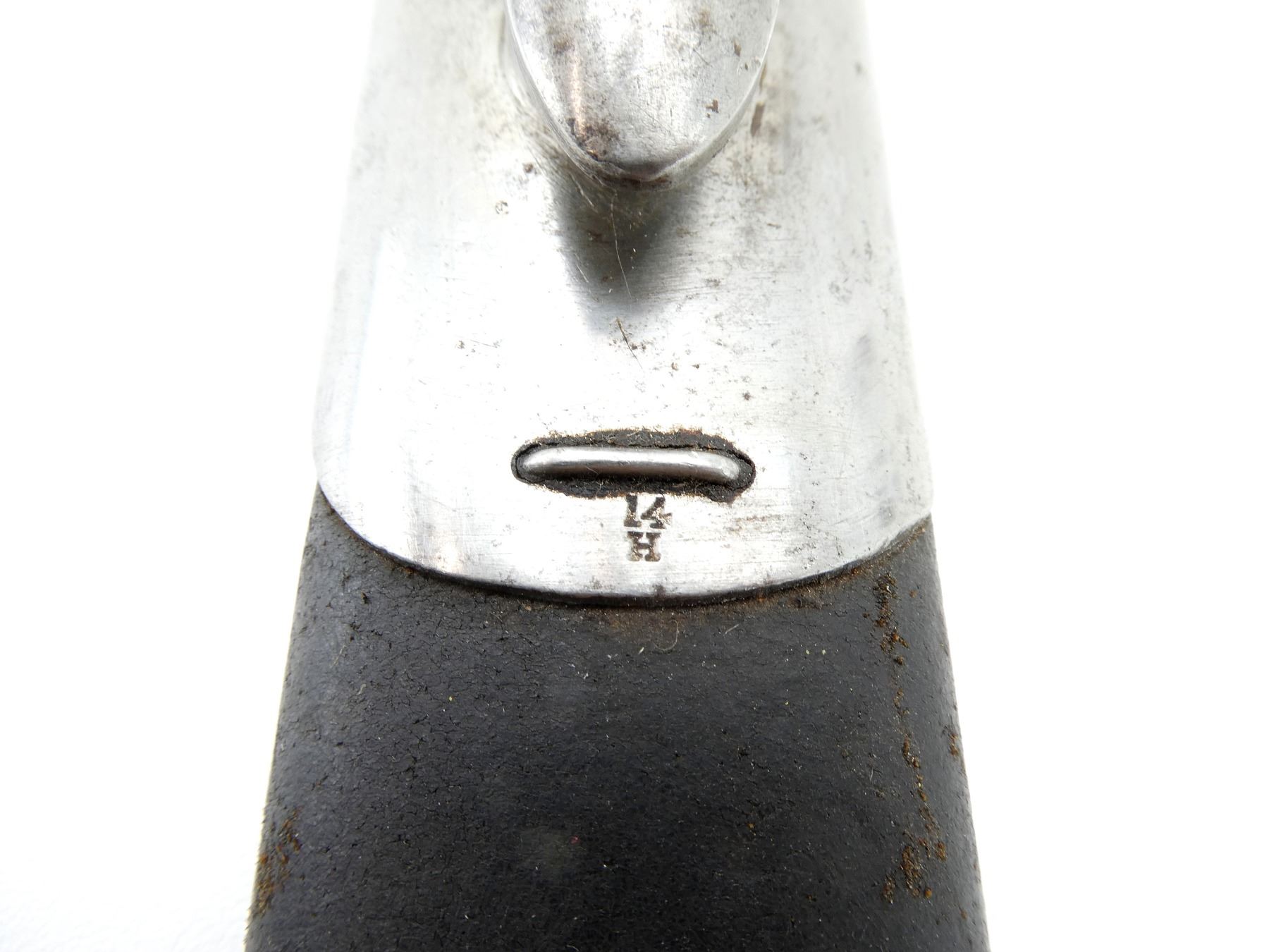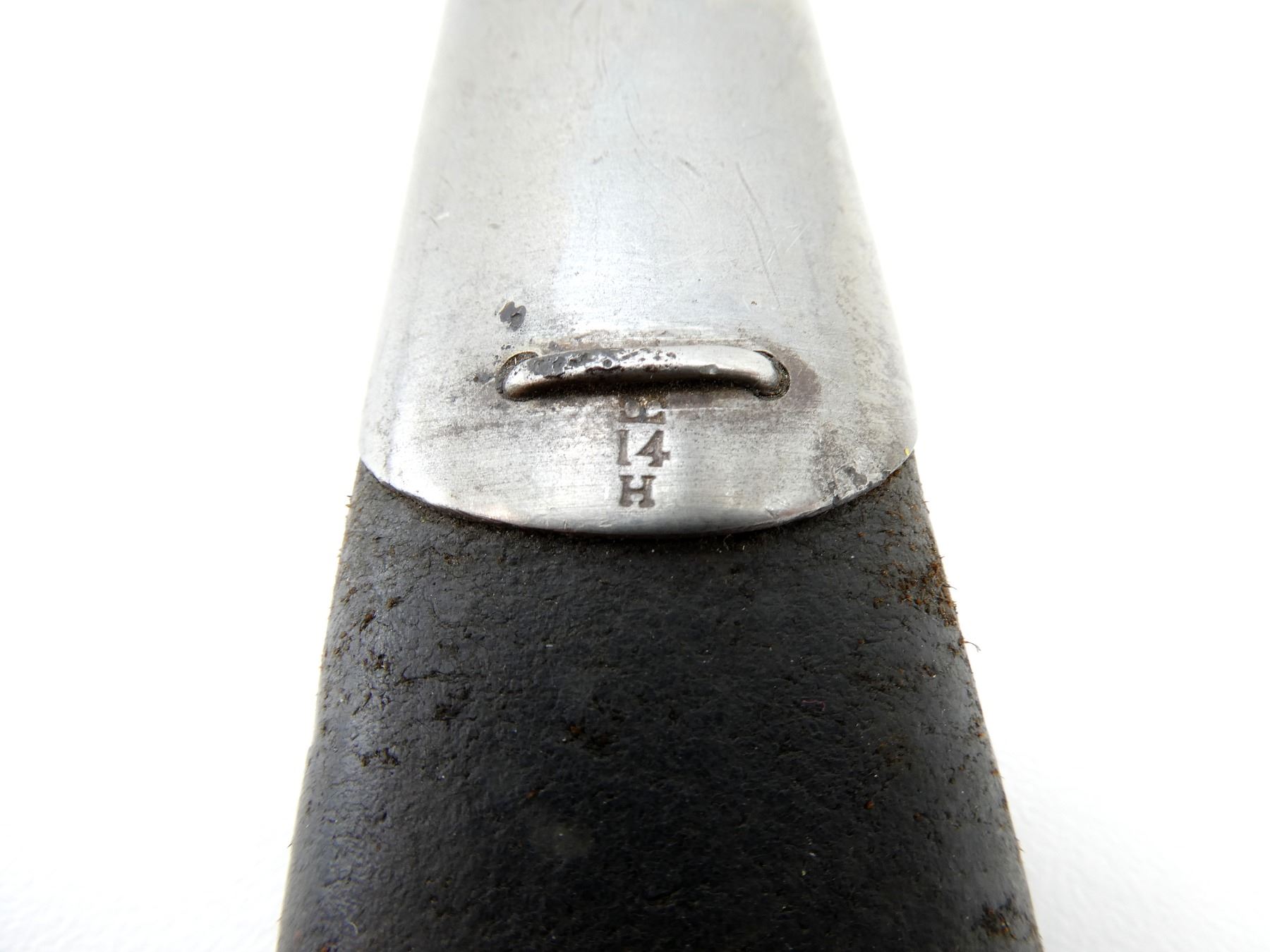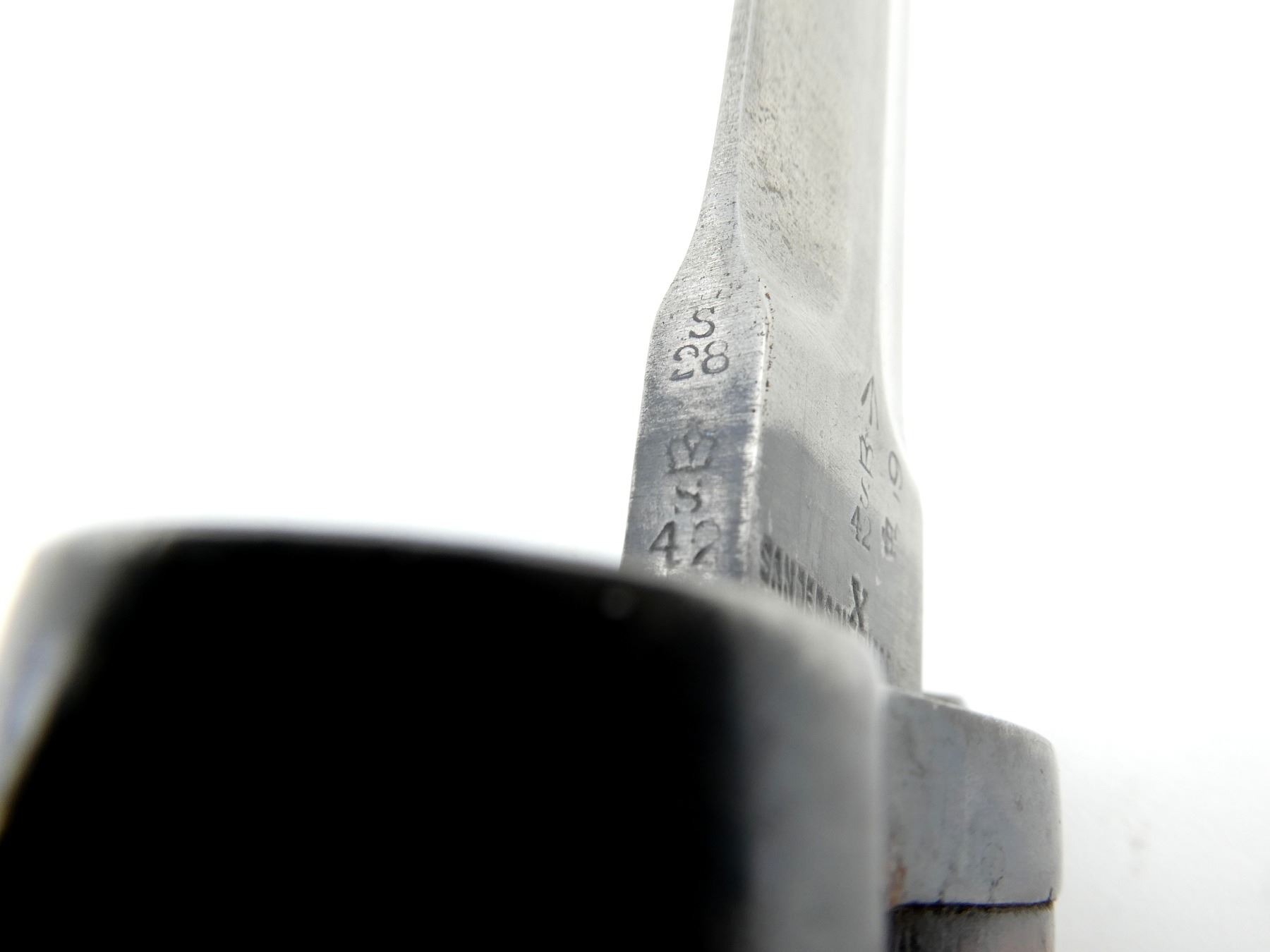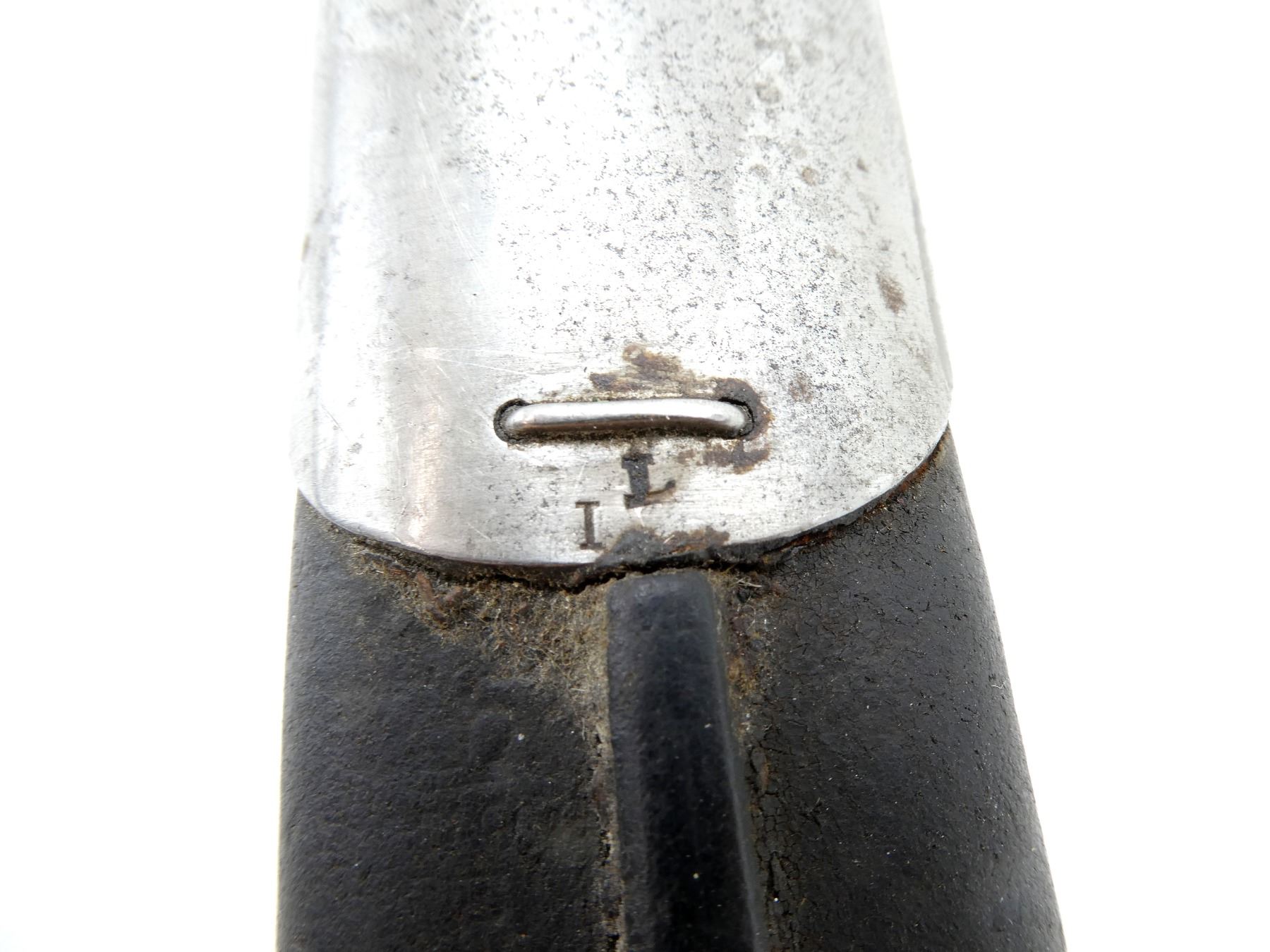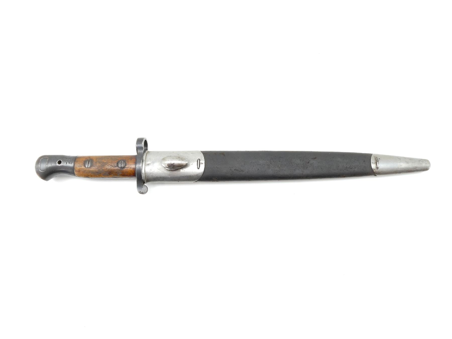 (1) FITS .303 CALIBER SHORT MAGAZINE LEE-ENFIELD NO.1 MKIII (SMLE) RIFLES, RICASSO MARKED: CROWN OVER "ER", OVER "1903" OVER "71, '05" WITH VARIOUS OTHER PROOF MARKS, OTHER-SIDE MARKED: BROAD ARROW OVER CROWN OVER "S" OVER "42" OVER "X (BEND TEST)" OVER "SANDERSON.SHEFFIE??", CROWN OVER "??", "?9", BLADE SPINE MARKED: "S" OVER "28" OVER CROWN OVER "S" OVER "42", 2-PIECE WOOD GRIPS, CHIPS IN WOOD GRIPS, METAL POMMEL MARKED: "RGA" OVER "132" (POSSIBLY ROYAL GARRISON ARTILLERY), BLACK LEATHER & METAL SCABBARD, LEATHER FAINTLY MARKED WITH CROWN PROOF MARK, " '96", THROAT MARKED: "7.69?" CROSSED OUT, "19", UNDER STUD MARKED: "14" OVER "H", OTHER-SIDE MARKED: "IL", METAL TIP END MARKED: CROWN OVER "14" OVER "H", BLADE APPROX. 12" & OVERALL LENGTH APPROX. 16.75". SEE PHOTOS.