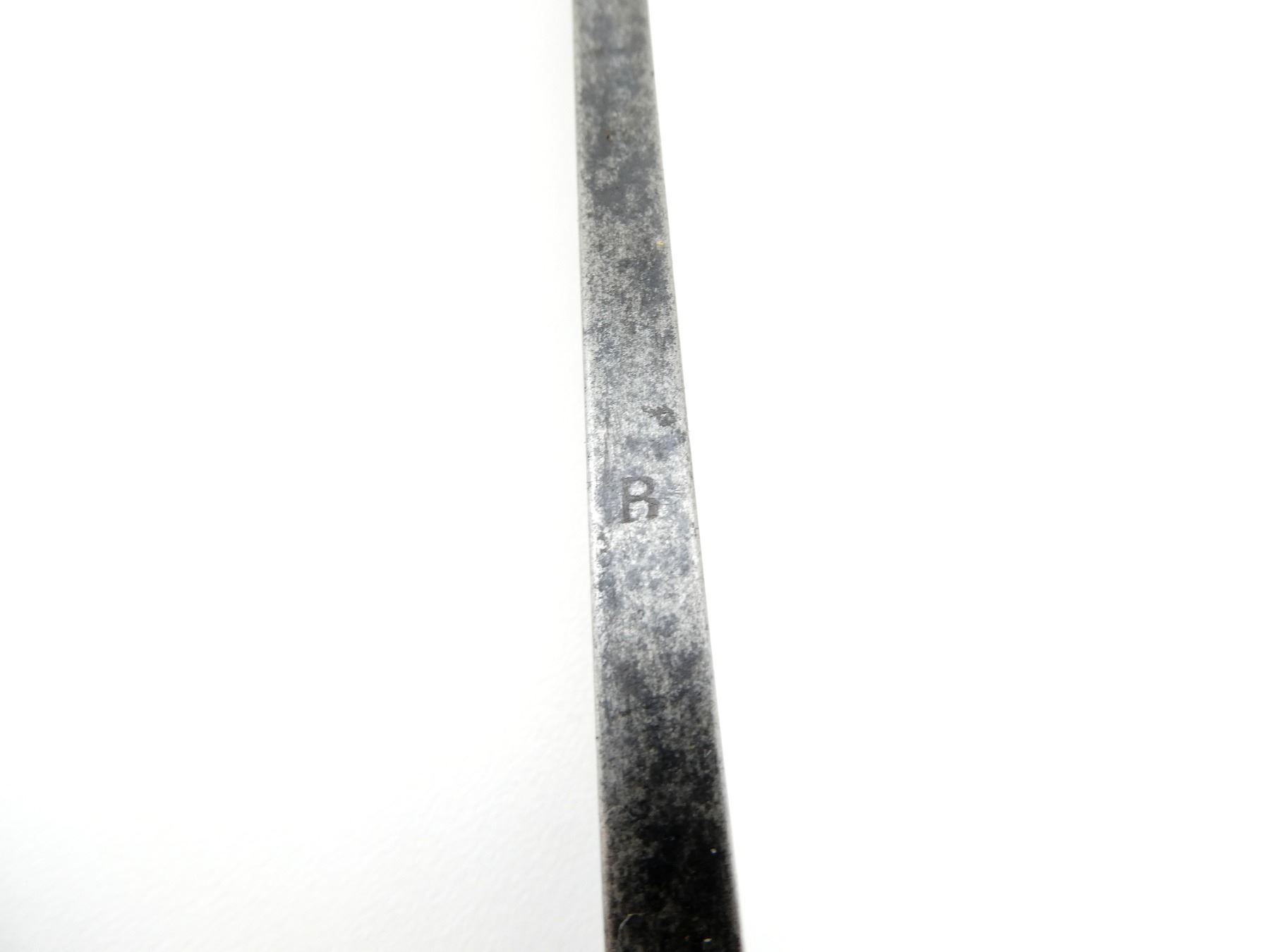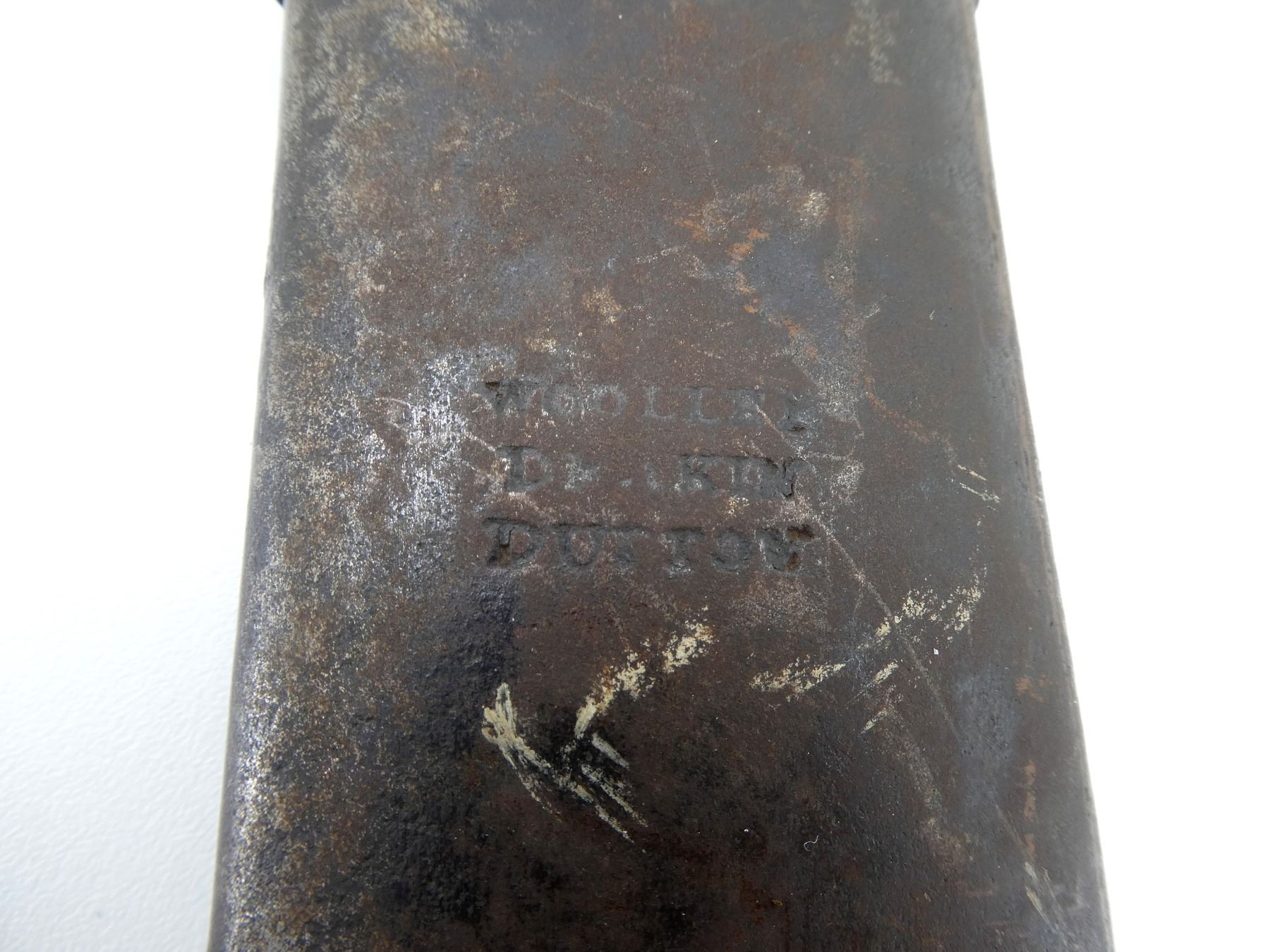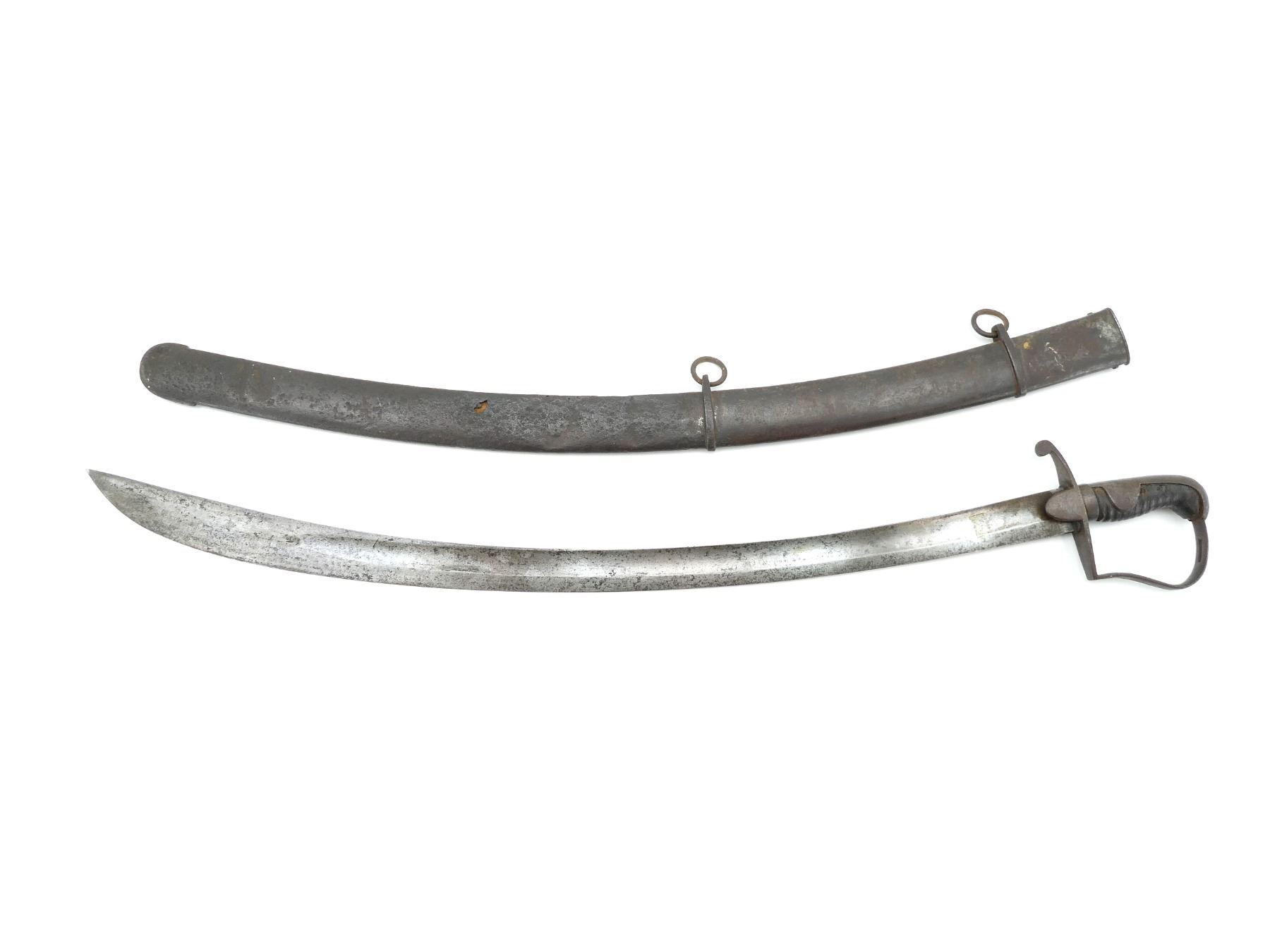 (1) CURVED PARTIALLY FULLERED SINGLE-EDGED BLADE, BLADE SPINE FAINTLY / PARTIALLY MARKED: "WOOLLE?, DEAK??", "IG", "R", "R", BLADE MARKED: CROWN OVER "4", NO VISIBLE MARKINGS ON CROSS-PIECE, BLACK LEATHER WRAPPED GRIP, GRIP SHOWS WEAR, METAL HILT, METAL GRIP BACKING, METAL POMMEL, NO VISIBLE MARKINGS, STEEL SCABBARD WITH TWO LOOP HANGERS, SCABBARD MARKED: "WOOLLEY, DEAKIN, DUTTON", SOME PITTING / DENTS / SMALL HOLES, BLADE APPROX. 33.25" & OVERALL LENGTH APPROX. 38.25". SEE PHOTOS.
