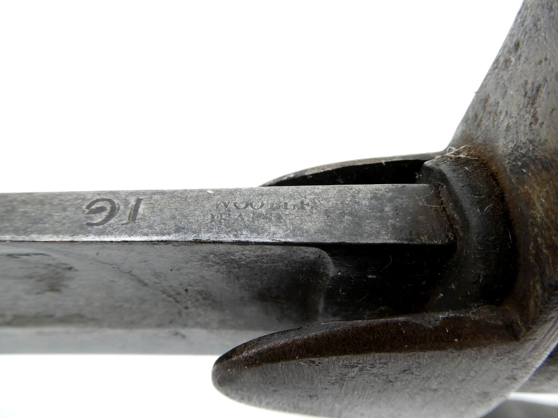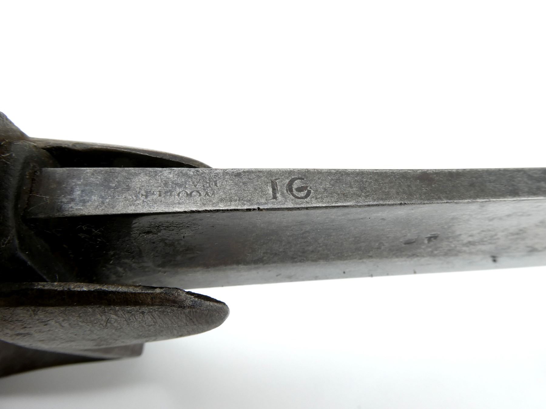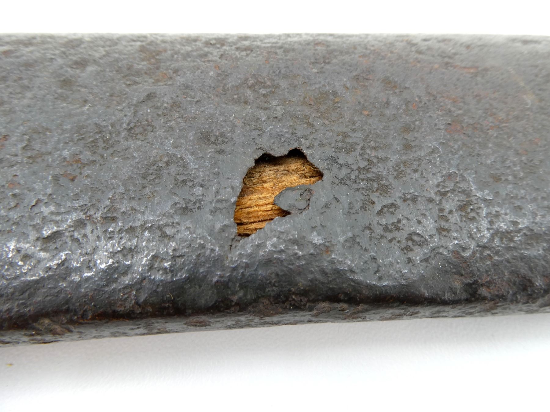 (1) CURVED PARTIALLY FULLERED SINGLE-EDGED BLADE, BLADE SPINE FAINTLY / PARTIALLY MARKED: "WOOLLE?, DEAK??", "IG", "R", "R", BLADE MARKED: CROWN OVER "4", NO VISIBLE MARKINGS ON CROSS-PIECE, BLACK LEATHER WRAPPED GRIP, GRIP SHOWS WEAR, METAL HILT, METAL GRIP BACKING, METAL POMMEL, NO VISIBLE MARKINGS, STEEL SCABBARD WITH TWO LOOP HANGERS, SCABBARD MARKED: "WOOLLEY, DEAKIN, DUTTON", SOME PITTING / DENTS / SMALL HOLES, BLADE APPROX. 33.25" & OVERALL LENGTH APPROX. 38.25". SEE PHOTOS.