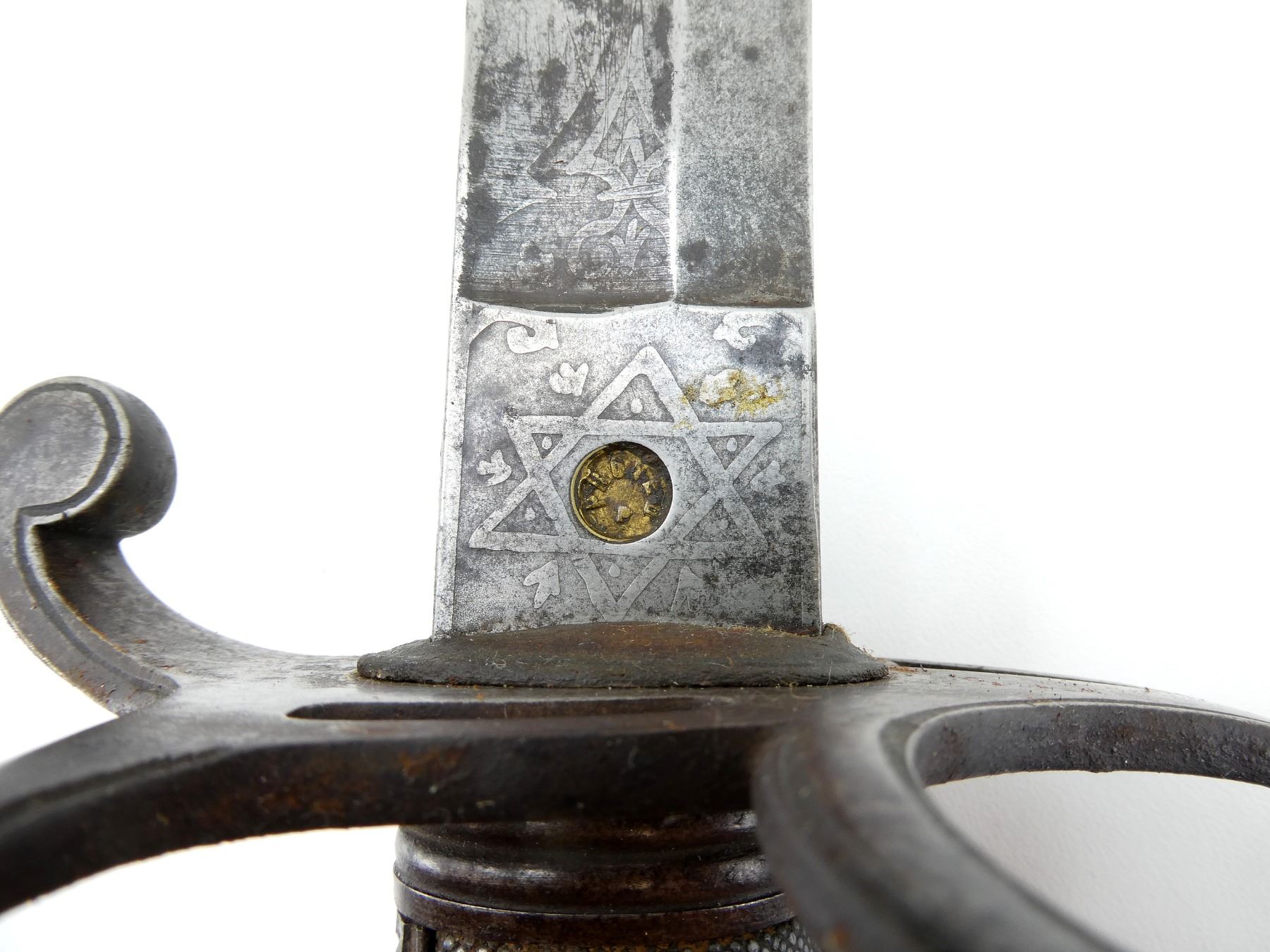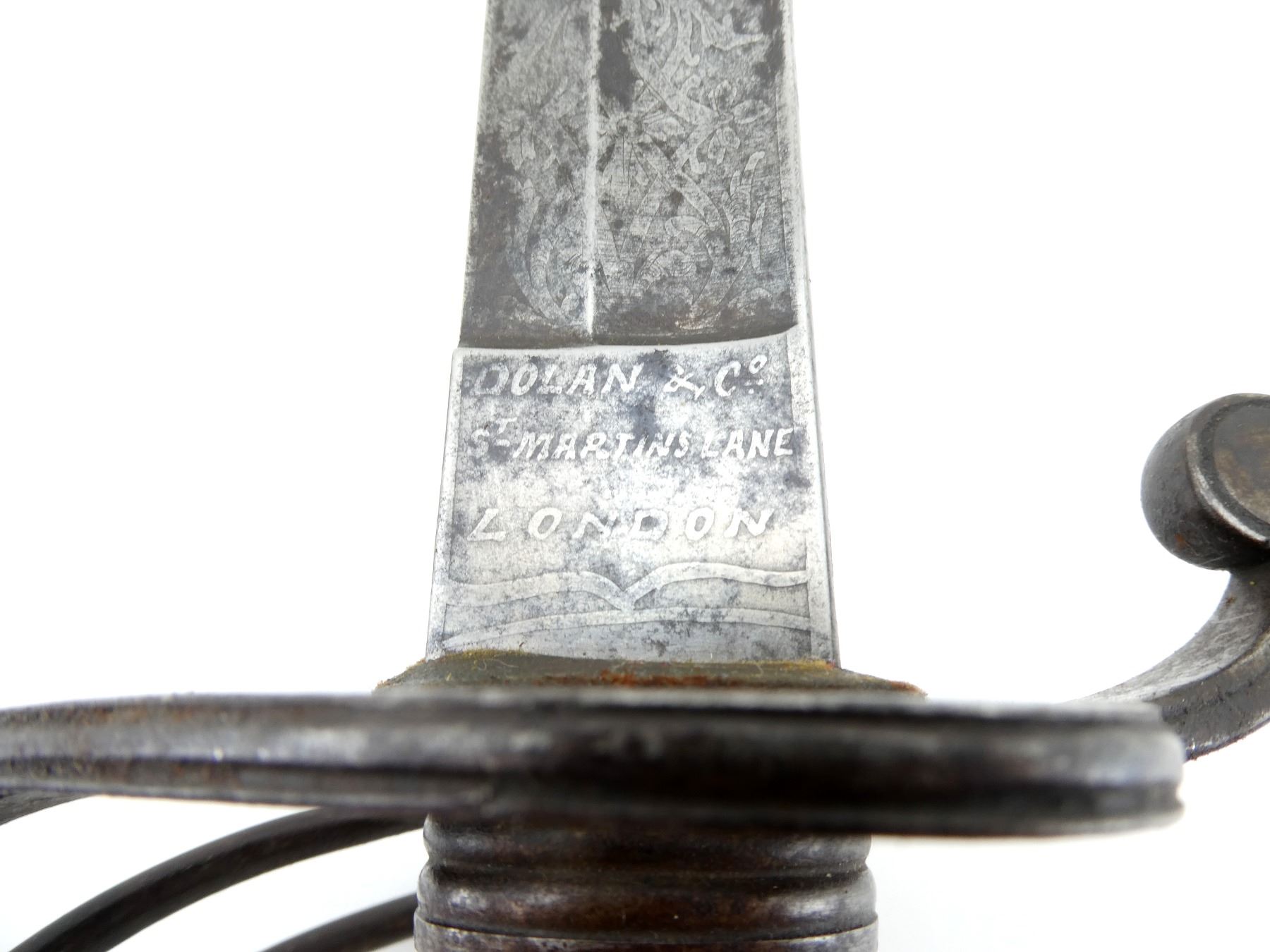 (1) SLIGHTLY CURVED PARTIALLY FULLERED SINGLE-EDGED BLADE, RICASSO ACID ETCHED: "DOLAN & CO, ST MARTINS LANE, LONDON", OTHER-SIDE ACID ETCHED: STAR SHAPE WITH BRASS EMBLEM MARKED: "PROVED" IN THE CENTER, BLADE ACID ETCHED: BEAVER OVER CANNON WITH VARIOUS DECORATIVE FLORAL DESIGNS, OTHER-SIDE BLADE ACID ETCHED: WINGS / LIGHTING BOLTS WITH VARIOUS DECORATIVE FLORAL DESIGNS, LEATHER BUFFER PAD / WASHER, DECORATIVE STEEL HILT, NO VISIBLE MARKINGS, BLACK WIRE WRAPPED GRIP, STEEL GRIP BACKING, STEEL POMMEL, NO VISIBLE MARKINGS, NO SCABBARD, BLADE APPROX. 33" & OVERALL LENGTH APPROX. 39". SEE PHOTOS.