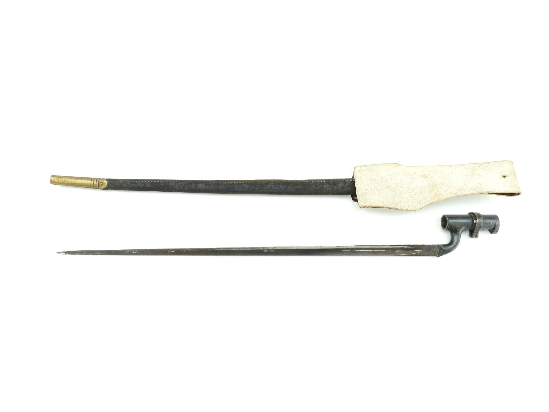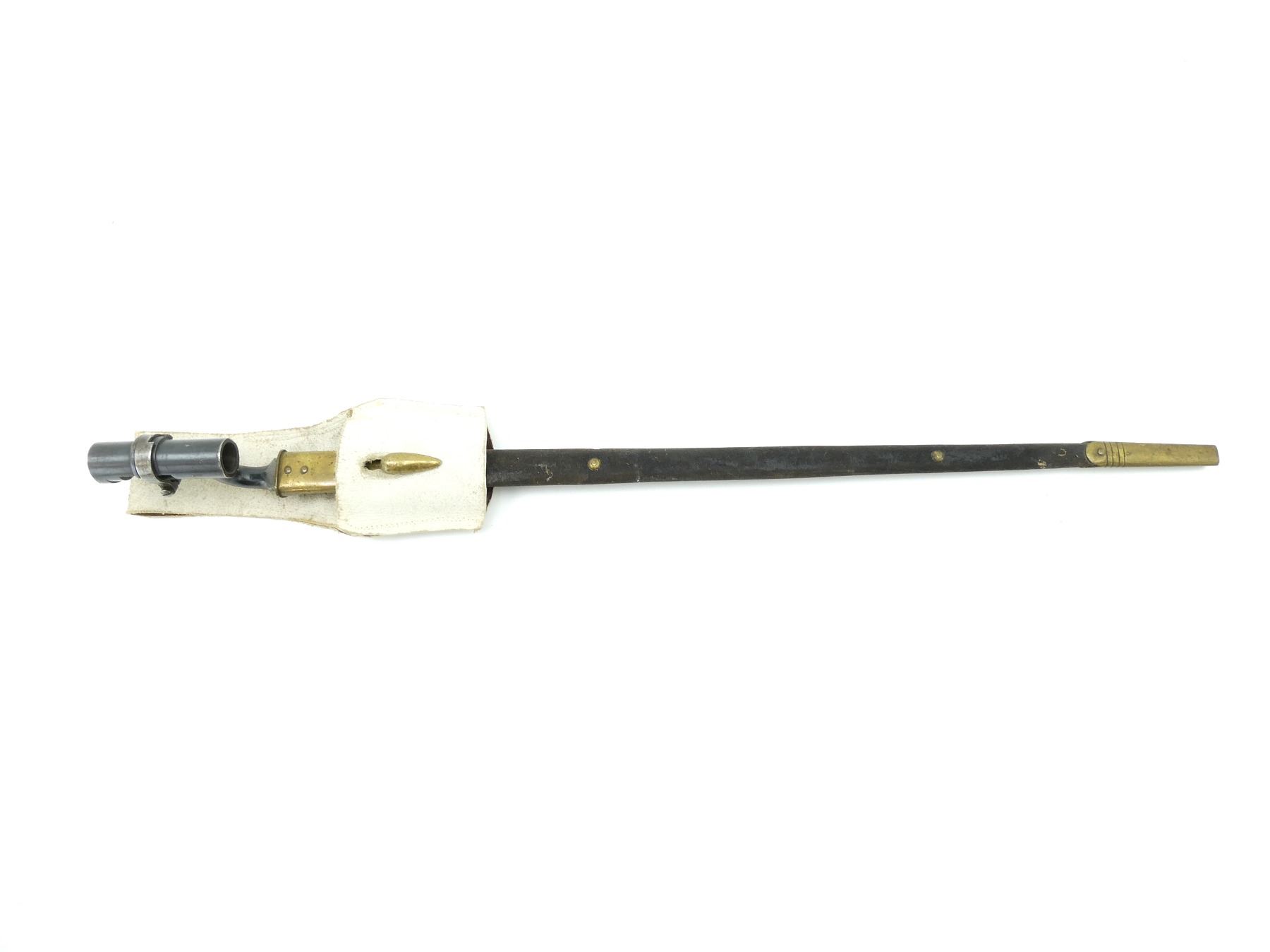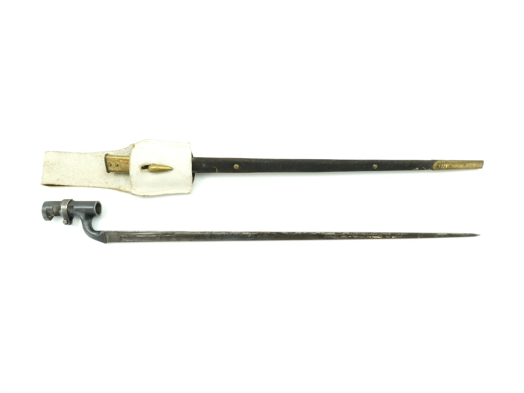 (1) FITS MARTINI HENRY RIFLES, BLADE MARKED: BROAD ARROW OVER "WD" OVER CROWN OVER "E" OVER "46", SOCKET MARKED: "12", "B", WITH LOCKING RING, LEATHER & BRASS SCABBARD WITH BUFF WHITE FROG, BRASS THROAT END MARKED: BROAD ARROW OVER "WD" OVER CROWN OVER "E" OVER "7", BRASS TIP END MARKED: BROAD ARROW OVER "WD", MUZZLE RING APPROX. 0.72" DIA., BLADE APPROX. 21 5/8" & OVERALL LENGTH APPROX. 25 1/8". SEE PHOTOS.