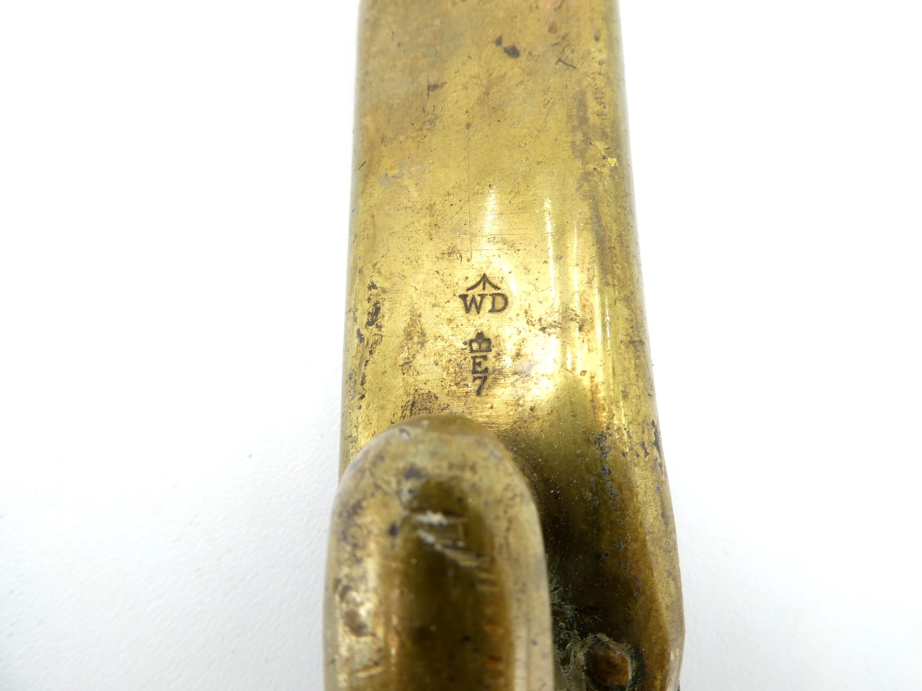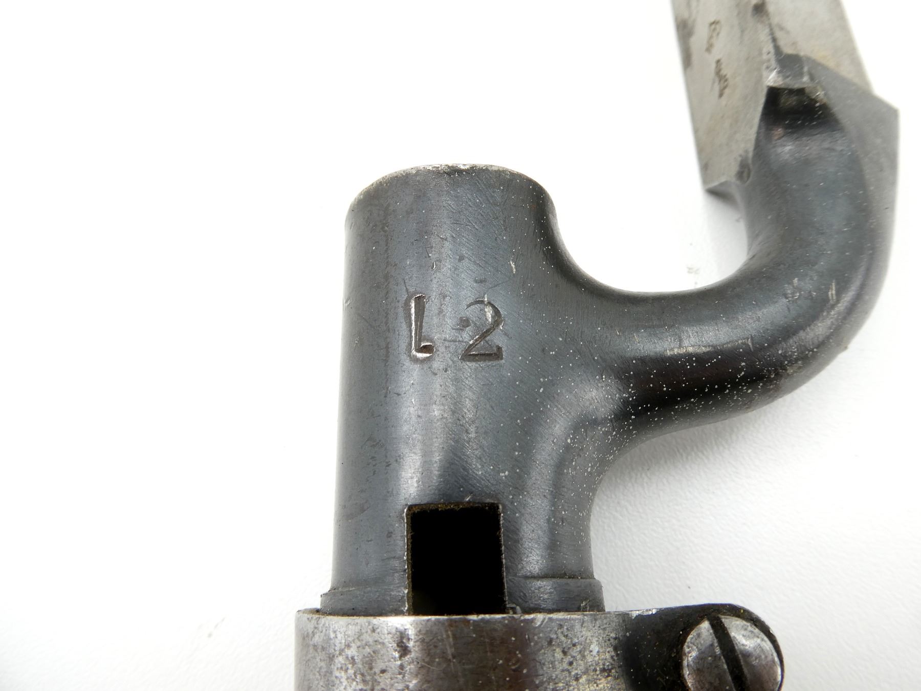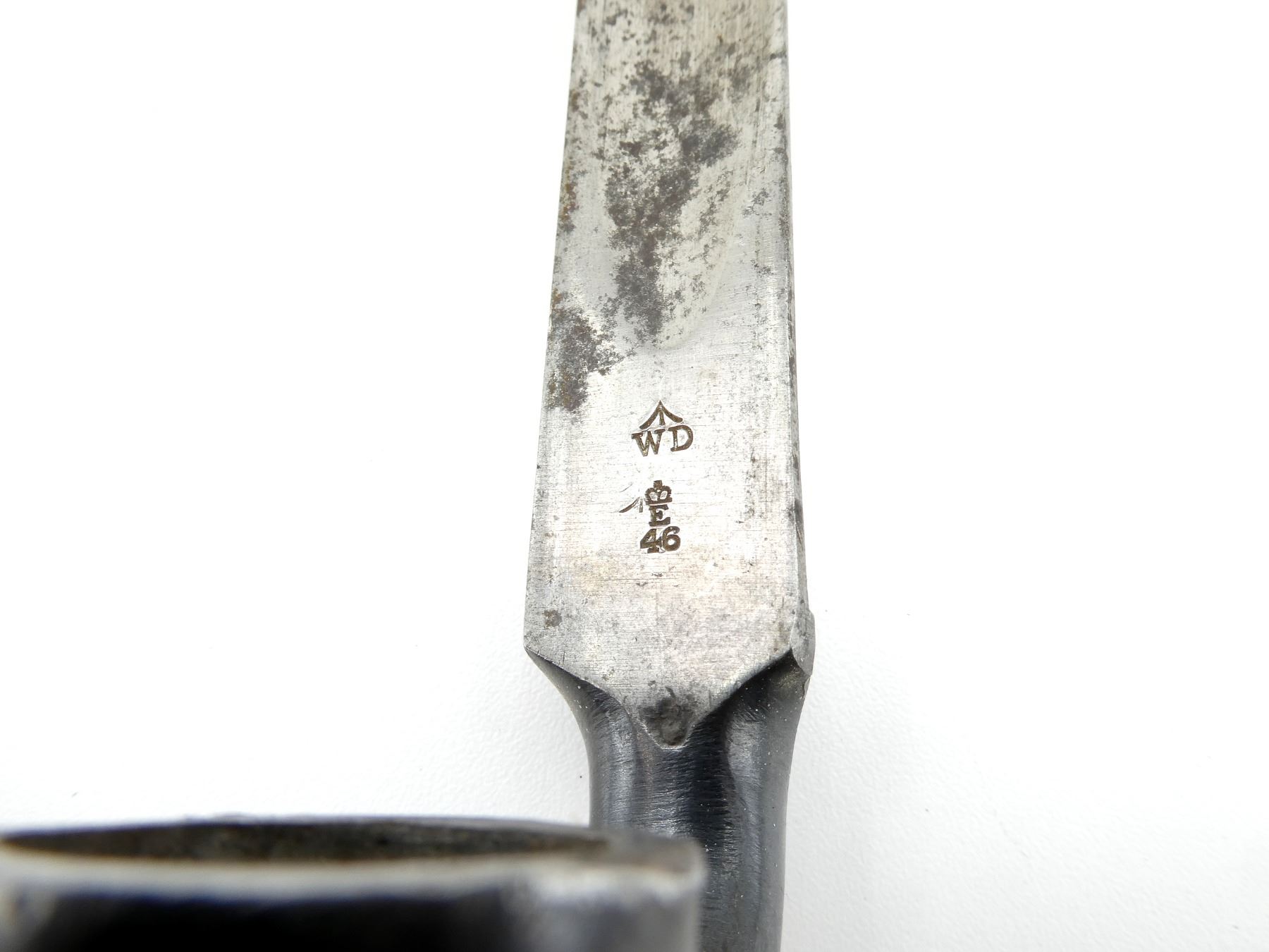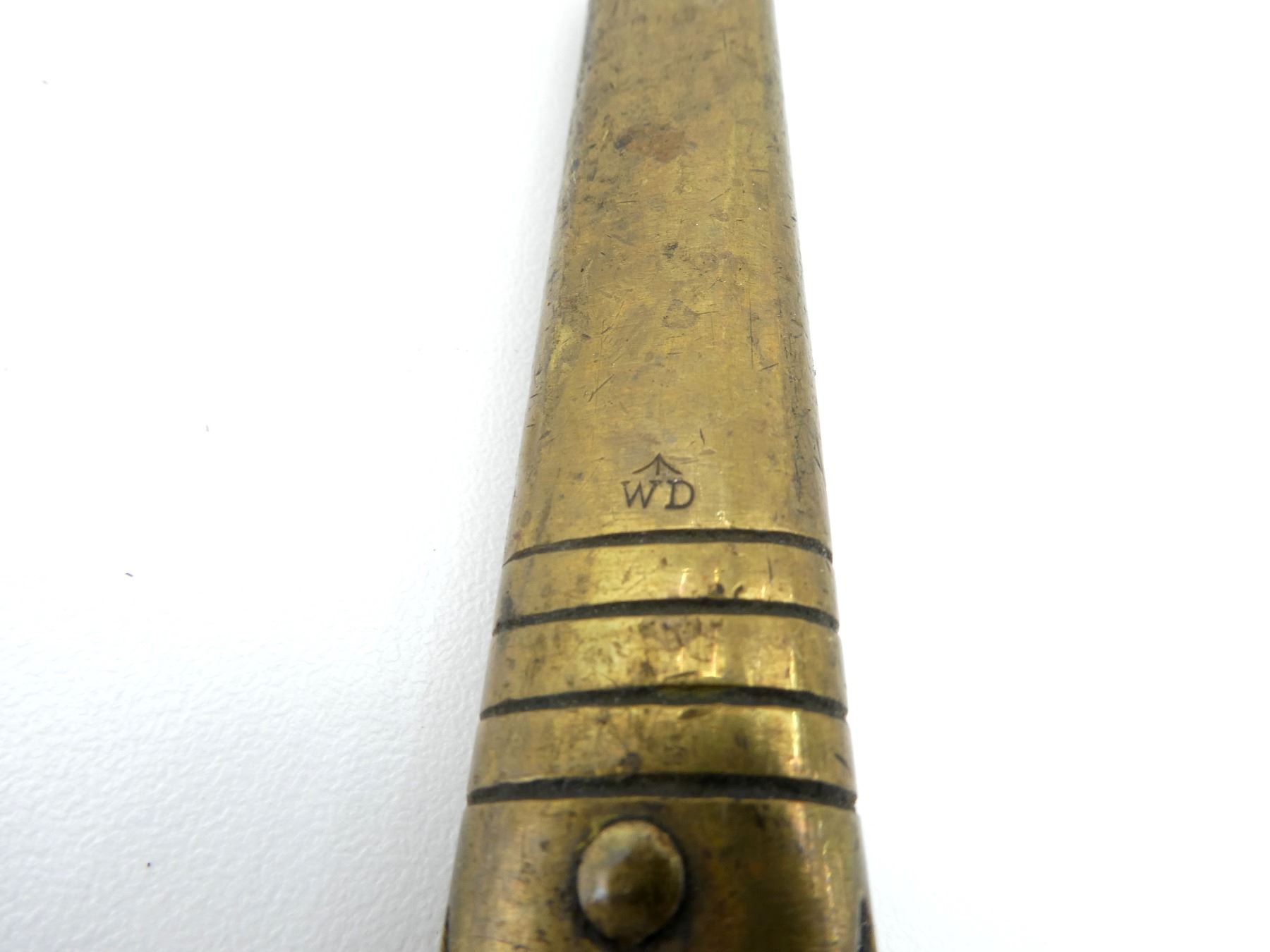 (1) FITS MARTINI HENRY RIFLES, BLADE MARKED: BROAD ARROW OVER "WD" OVER CROWN OVER "E" OVER "46", SOCKET MARKED: "12", "B", WITH LOCKING RING, LEATHER & BRASS SCABBARD WITH BUFF WHITE FROG, BRASS THROAT END MARKED: BROAD ARROW OVER "WD" OVER CROWN OVER "E" OVER "7", BRASS TIP END MARKED: BROAD ARROW OVER "WD", MUZZLE RING APPROX. 0.72" DIA., BLADE APPROX. 21 5/8" & OVERALL LENGTH APPROX. 25 1/8". SEE PHOTOS.