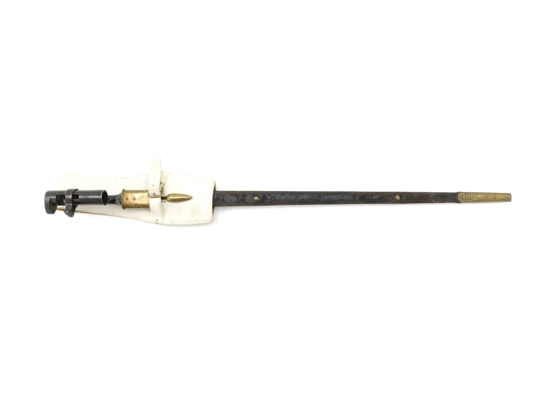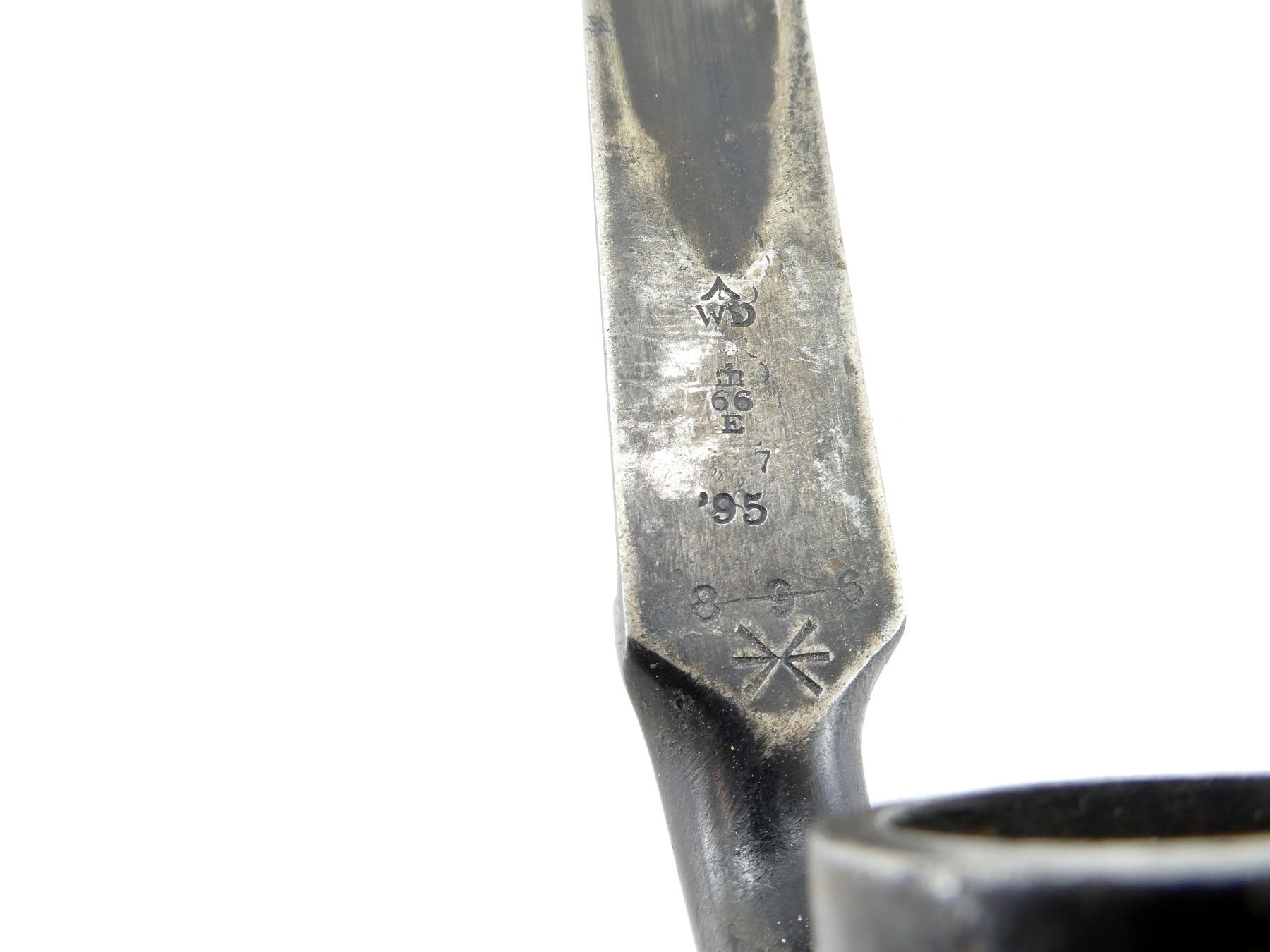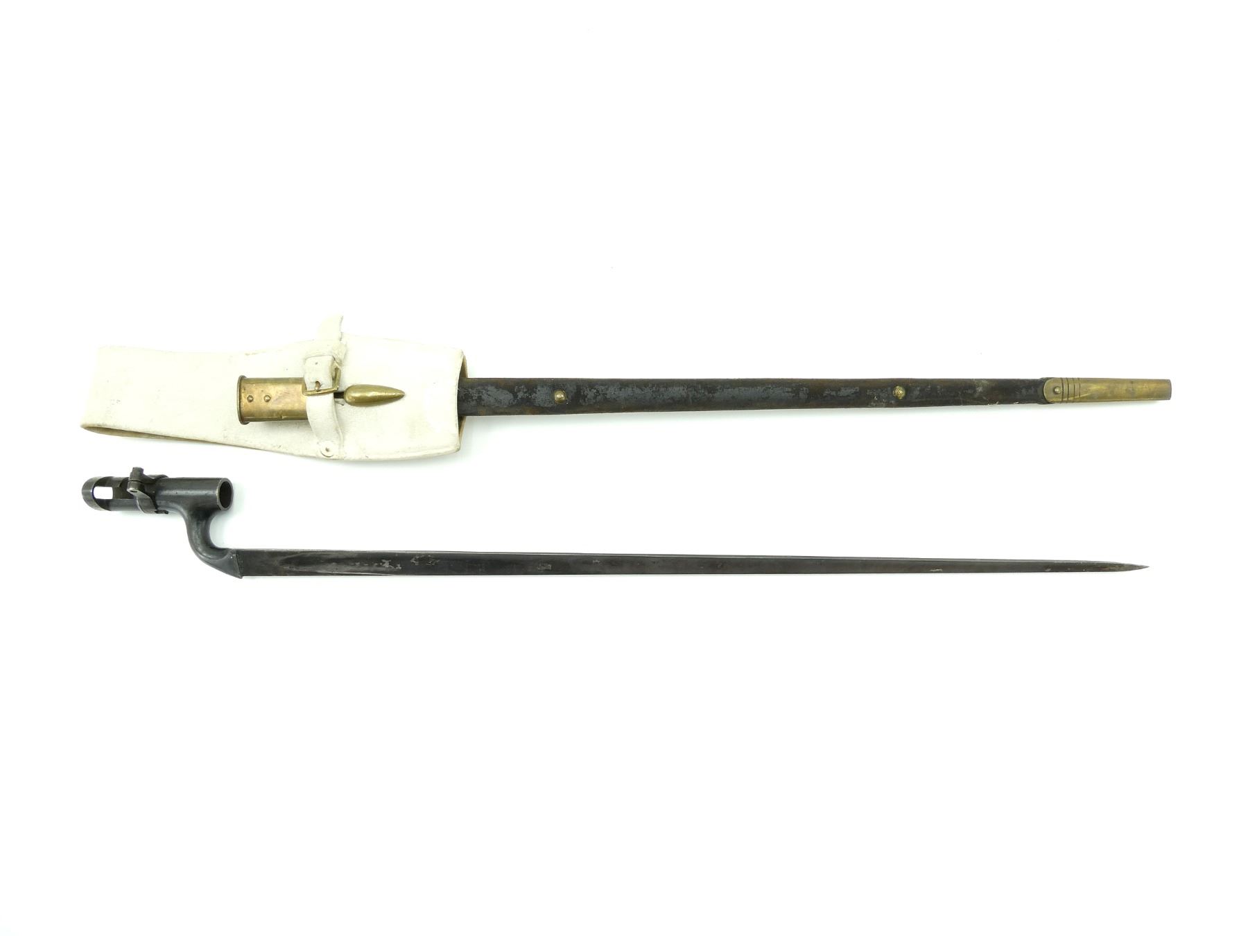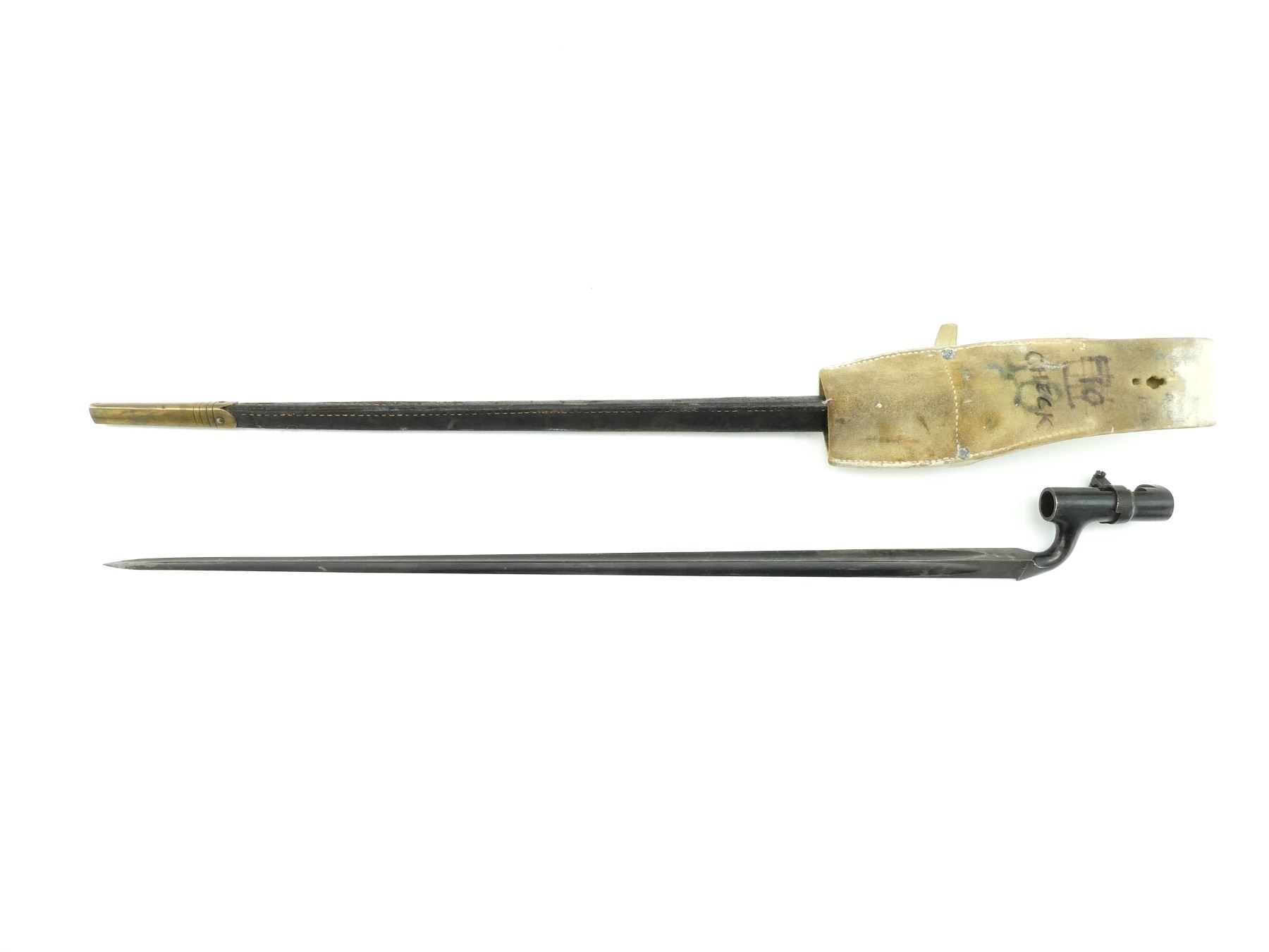 (1) FITS .303 CAL. M1895 MARTINI-ENFIELD RIFLES, RICASSO MARKED: BROAD ARROW OVER "WD" OVER CROWN OVER "66" OVER "E" OVER "7" OVER " '95" OVER "896 (CROSSED OUT) OVER TWO BROAD ARROWS FACING EACH OTHER, NO VISIBLE MARKINGS ON SOCKET, WITH LOCKING RING, LEATHER & BRASS SCABBARD WITH WHITE BUFF LEATHER FROG, LEATHER MARKED: "5", BRASS THROAT END MARKED: BROAD ARROW OVER "WD" OVER CROWN OVER "E" OVER "7", BRASS TIP END MARKED: BROAD ARROW OVER "WD", VARIOUS HAND-WRITTEN MARKINGS ON FROG, MUZZLE RING APPROX. 0.664" DIA., BLADE APPROX. 21 7/8" & OVERALL LENGTH APPROX. 25.25". SEE PHOTOS.