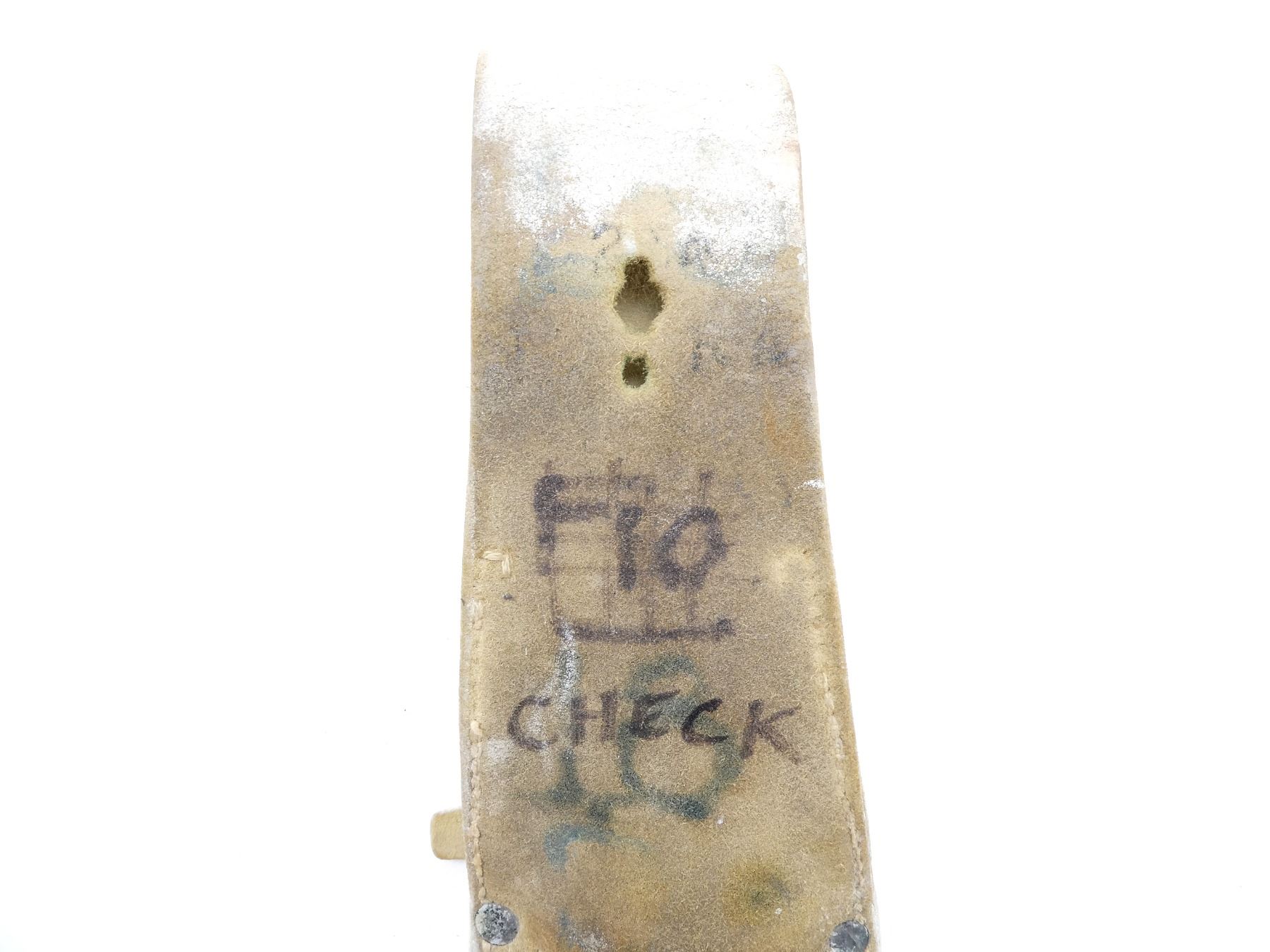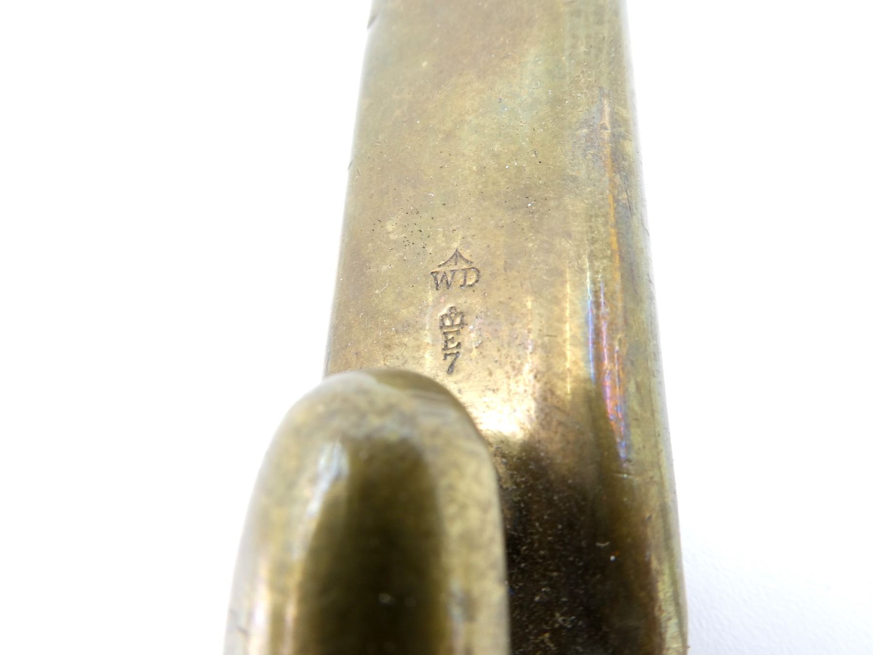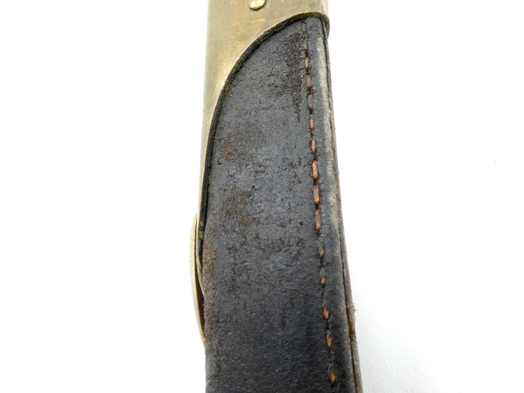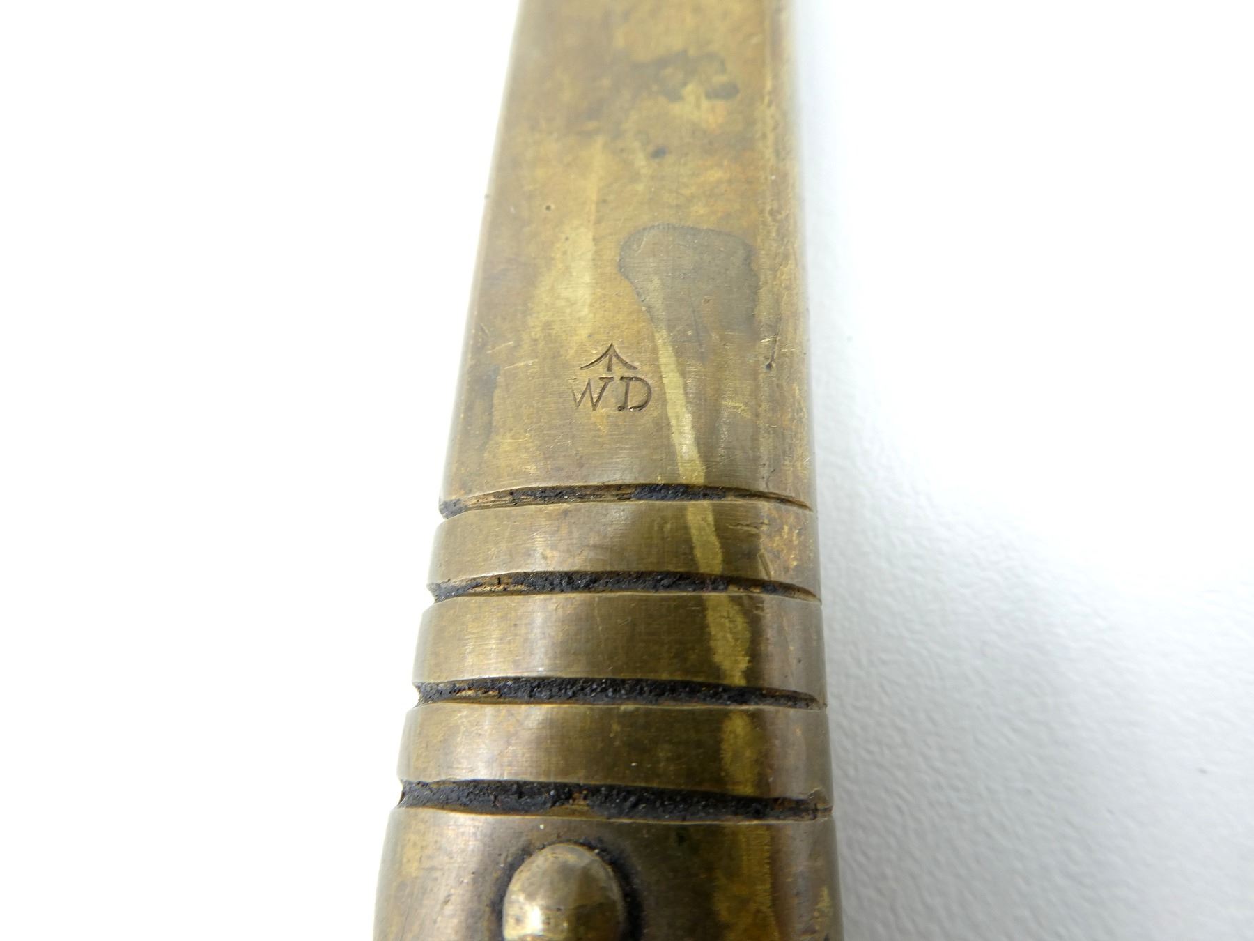 (1) FITS .303 CAL. M1895 MARTINI-ENFIELD RIFLES, RICASSO MARKED: BROAD ARROW OVER "WD" OVER CROWN OVER "66" OVER "E" OVER "7" OVER " '95" OVER "896 (CROSSED OUT) OVER TWO BROAD ARROWS FACING EACH OTHER, NO VISIBLE MARKINGS ON SOCKET, WITH LOCKING RING, LEATHER & BRASS SCABBARD WITH WHITE BUFF LEATHER FROG, LEATHER MARKED: "5", BRASS THROAT END MARKED: BROAD ARROW OVER "WD" OVER CROWN OVER "E" OVER "7", BRASS TIP END MARKED: BROAD ARROW OVER "WD", VARIOUS HAND-WRITTEN MARKINGS ON FROG, MUZZLE RING APPROX. 0.664" DIA., BLADE APPROX. 21 7/8" & OVERALL LENGTH APPROX. 25.25". SEE PHOTOS.