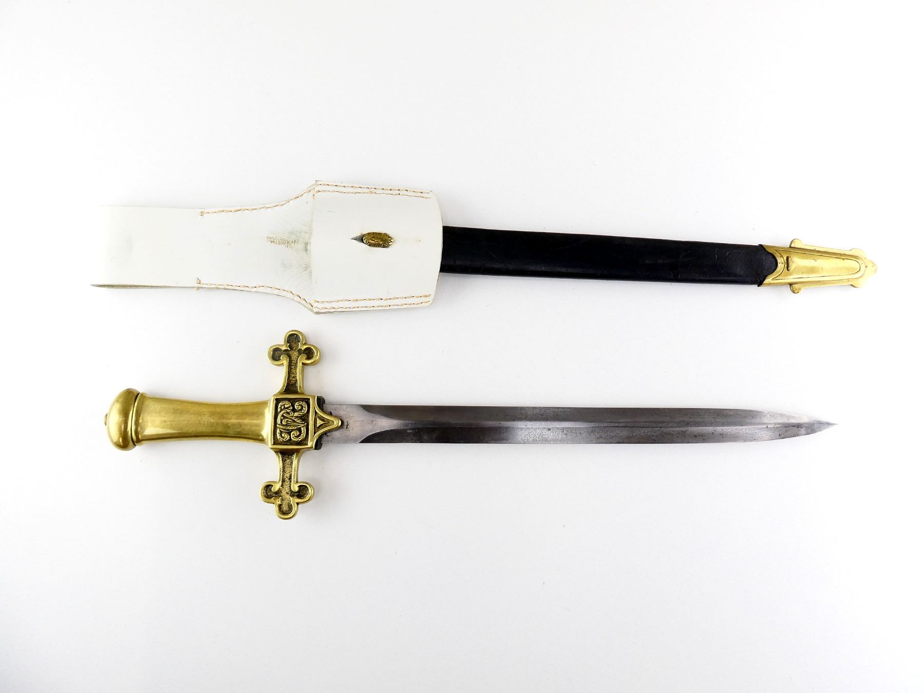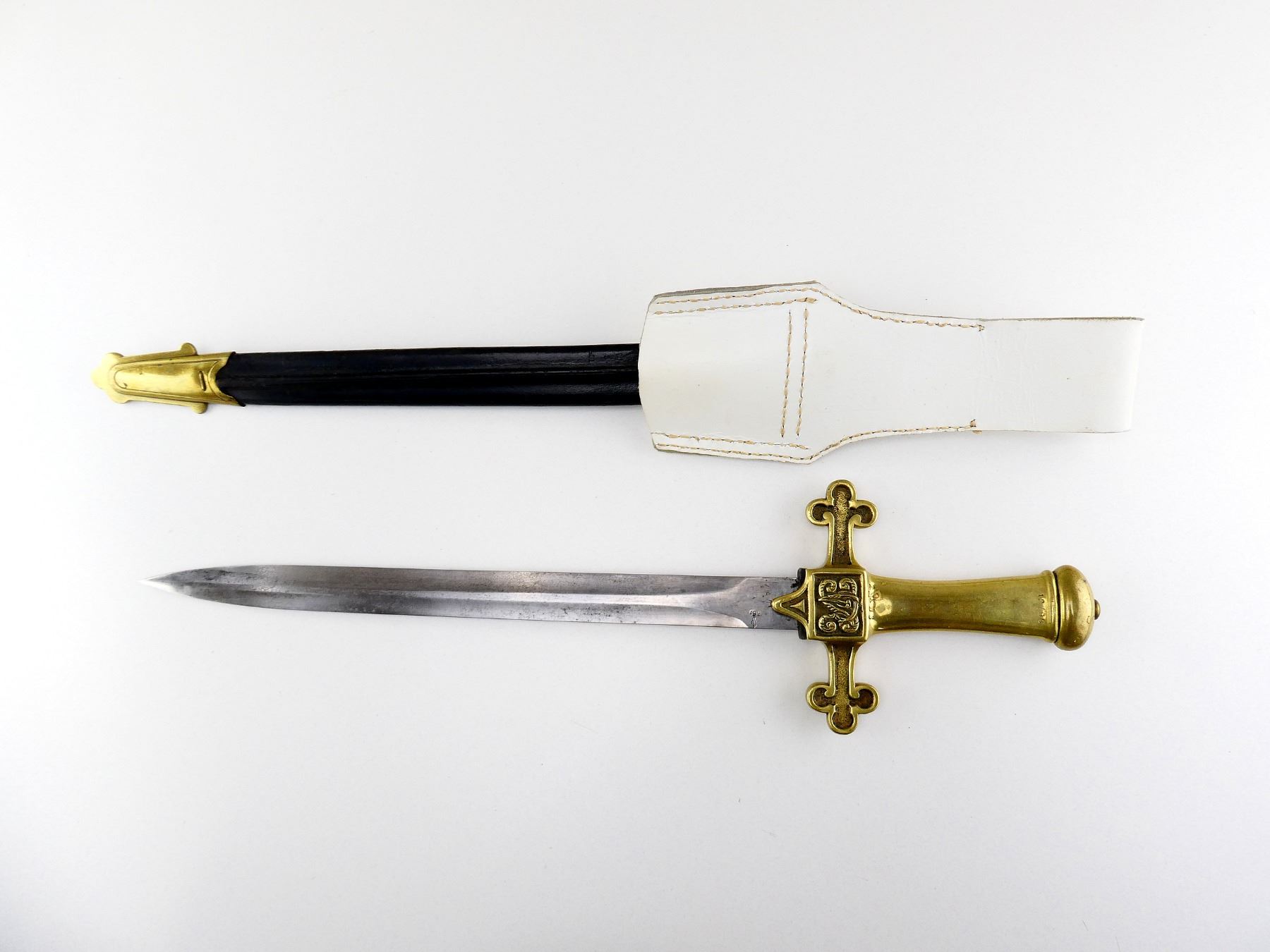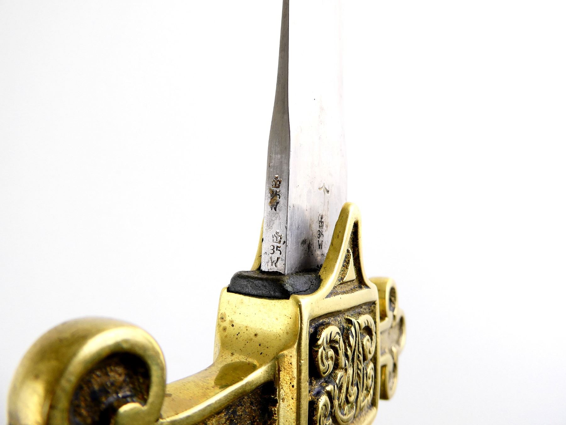 (1) STRAIGHT DOUBLE-EDGED BLADE, RICASSO MARKED: " '99" OVER CROWN OVER "82" OVER "E", "7 '98", OTHER-SIDE MARKED: BROAD ARROW OVER CROWN OVER "35" OVER "W", BLADE SPINE MARKED: CROWN OVER "35" OVER "W" (TWICE), RECTANGULAR LEATHER BUFFER PAD / WASHER, BRASS DECORATIVE CROSS SHAPED CROSSGUARD, CROSSGUARD WITH "VR" CYPHER ON EITHER-SIDE, BRASS 1-PIECE GRIP, GRIP MARKED: "12/98", "2 MX B3", BRASS POMMEL MARKED: "MSM", POMMEL SLIGHTLY LOOSE, LEATHER & BRASS SCABBARD WITH WHITE LEATHER FROG, LEATHER MARKED: BROAD ARROW OVER CROWN OVER "?" OVER "3" OVER ".01", BRASS THROAT END UNDER STUD MARKED: CROWN OVER "B" OVER "94", BRASS TIP END MARKED: CROWN OVER "B" OVER "94", NO VISIBLE MARKINGS ON FROG, BLADE APPROX. 13 1/8" & OVERALL LENGTH APPROX. 18.5". SEE PHOTOS.