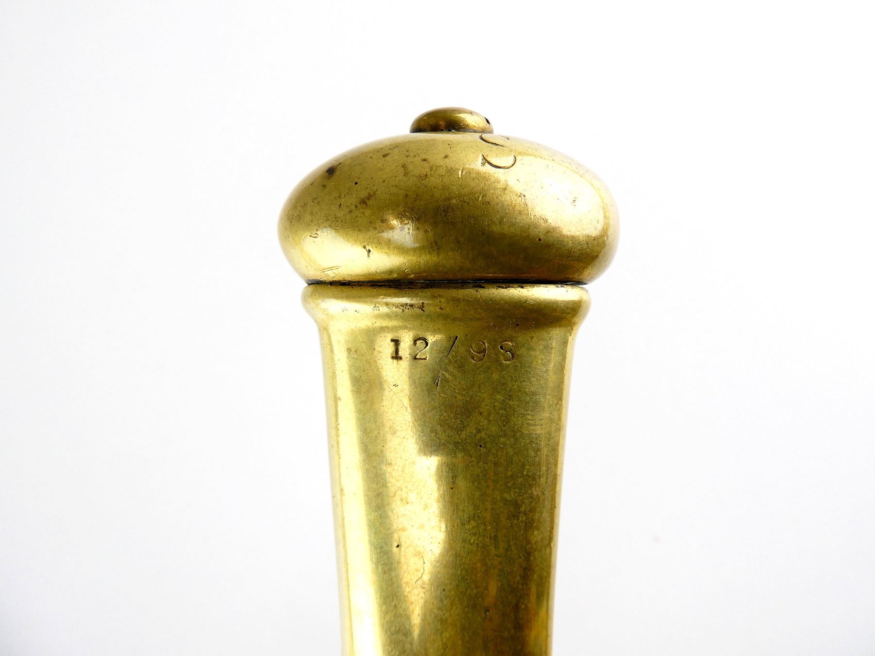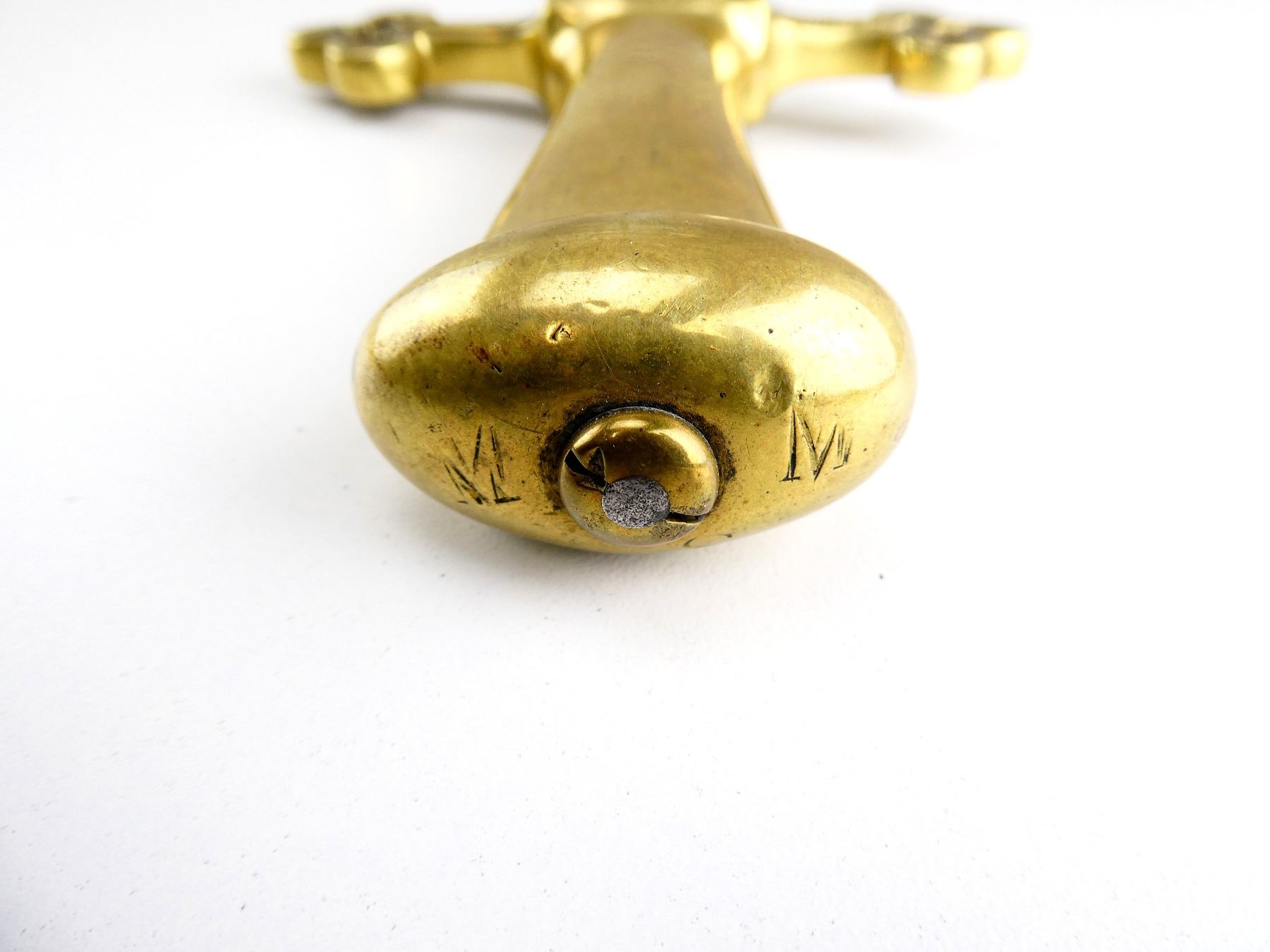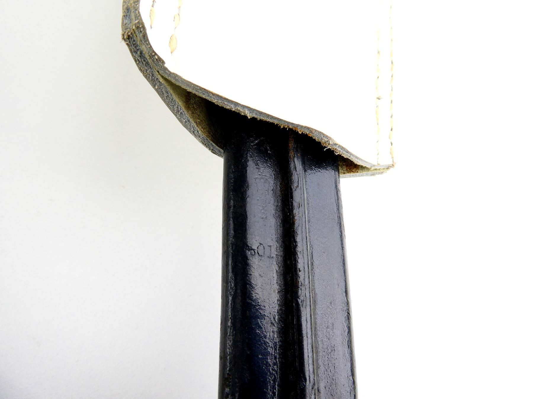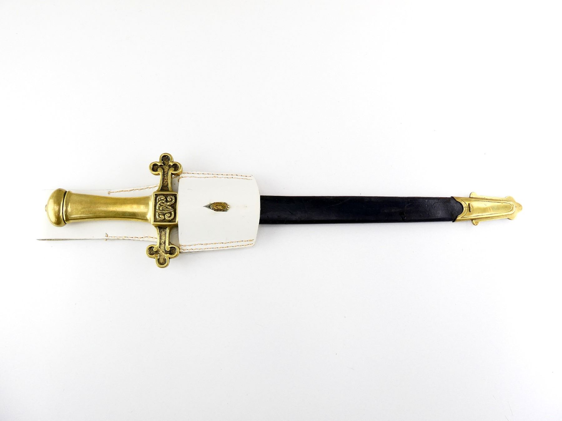 (1) STRAIGHT DOUBLE-EDGED BLADE, RICASSO MARKED: " '99" OVER CROWN OVER "82" OVER "E", "7 '98", OTHER-SIDE MARKED: BROAD ARROW OVER CROWN OVER "35" OVER "W", BLADE SPINE MARKED: CROWN OVER "35" OVER "W" (TWICE), RECTANGULAR LEATHER BUFFER PAD / WASHER, BRASS DECORATIVE CROSS SHAPED CROSSGUARD, CROSSGUARD WITH "VR" CYPHER ON EITHER-SIDE, BRASS 1-PIECE GRIP, GRIP MARKED: "12/98", "2 MX B3", BRASS POMMEL MARKED: "MSM", POMMEL SLIGHTLY LOOSE, LEATHER & BRASS SCABBARD WITH WHITE LEATHER FROG, LEATHER MARKED: BROAD ARROW OVER CROWN OVER "?" OVER "3" OVER ".01", BRASS THROAT END UNDER STUD MARKED: CROWN OVER "B" OVER "94", BRASS TIP END MARKED: CROWN OVER "B" OVER "94", NO VISIBLE MARKINGS ON FROG, BLADE APPROX. 13 1/8" & OVERALL LENGTH APPROX. 18.5". SEE PHOTOS.