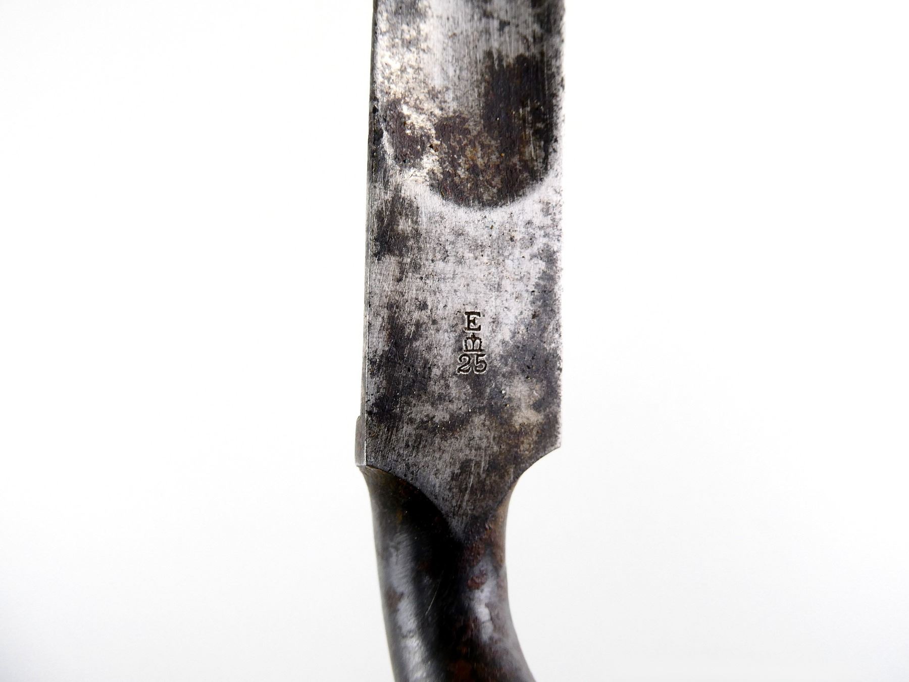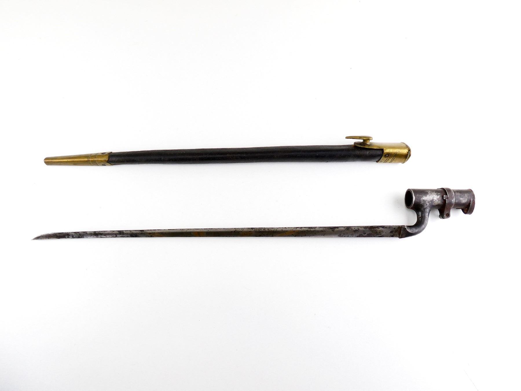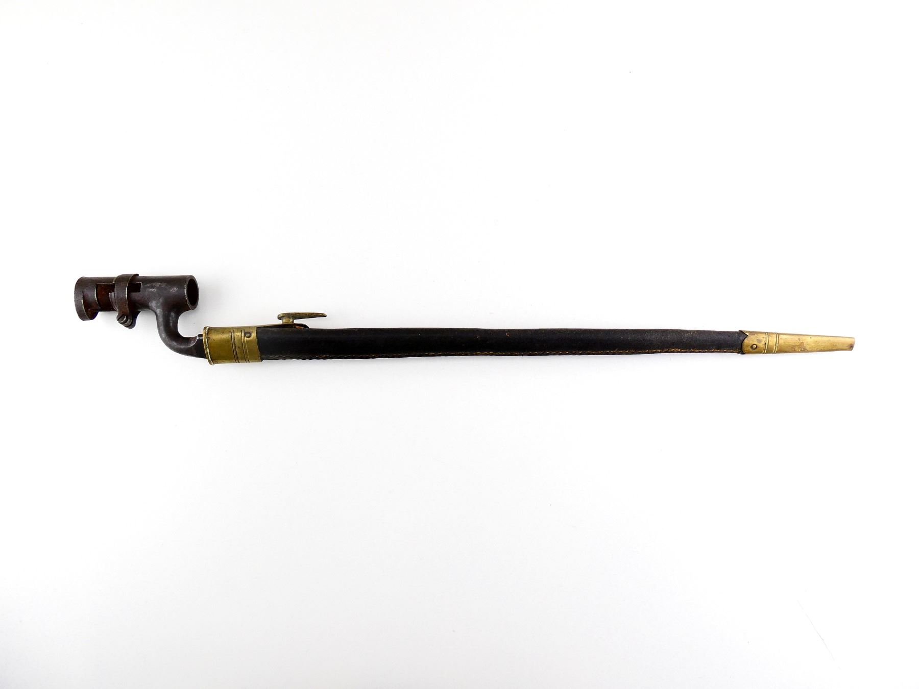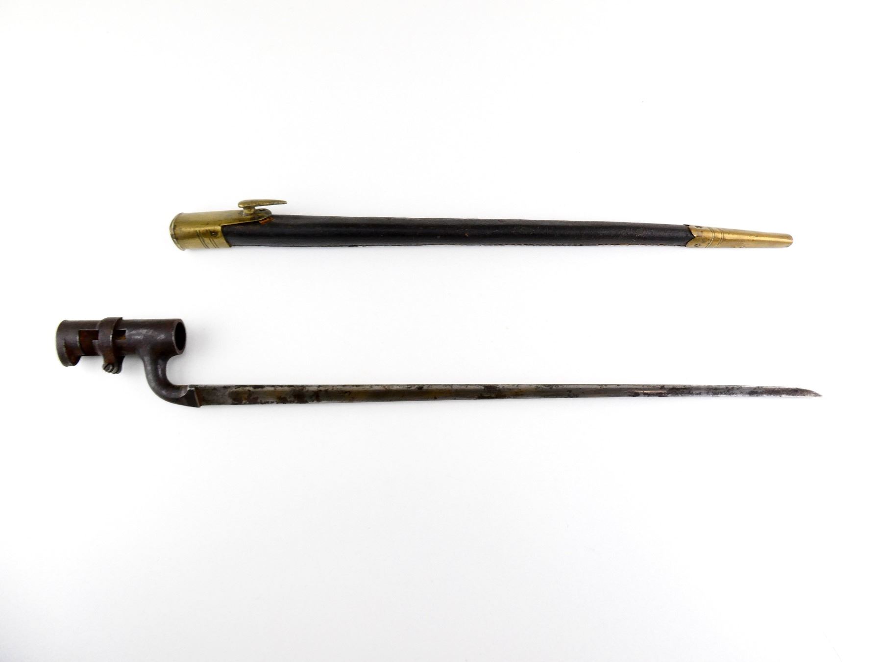 (1) FITS BRITISH 1853 ENFIELD & SNIDER-ENFIELD MUSKETS, BLADE MARKED: "E" OVER CROWN OVER "25", NO VISIBLE MARKINGS ON SOCKET, WITH LOCKING RING, BLACK LEATHER & BRASS SCABBARD, NO VISIBLE MARKINGS ON SCABBARD, MUZZLE RING APPROX. 0.74" DIA., BLADE APPROX. 17 3/8" & OVERALL LENGTH APPROX. 20.75". SEE PHOTOS.