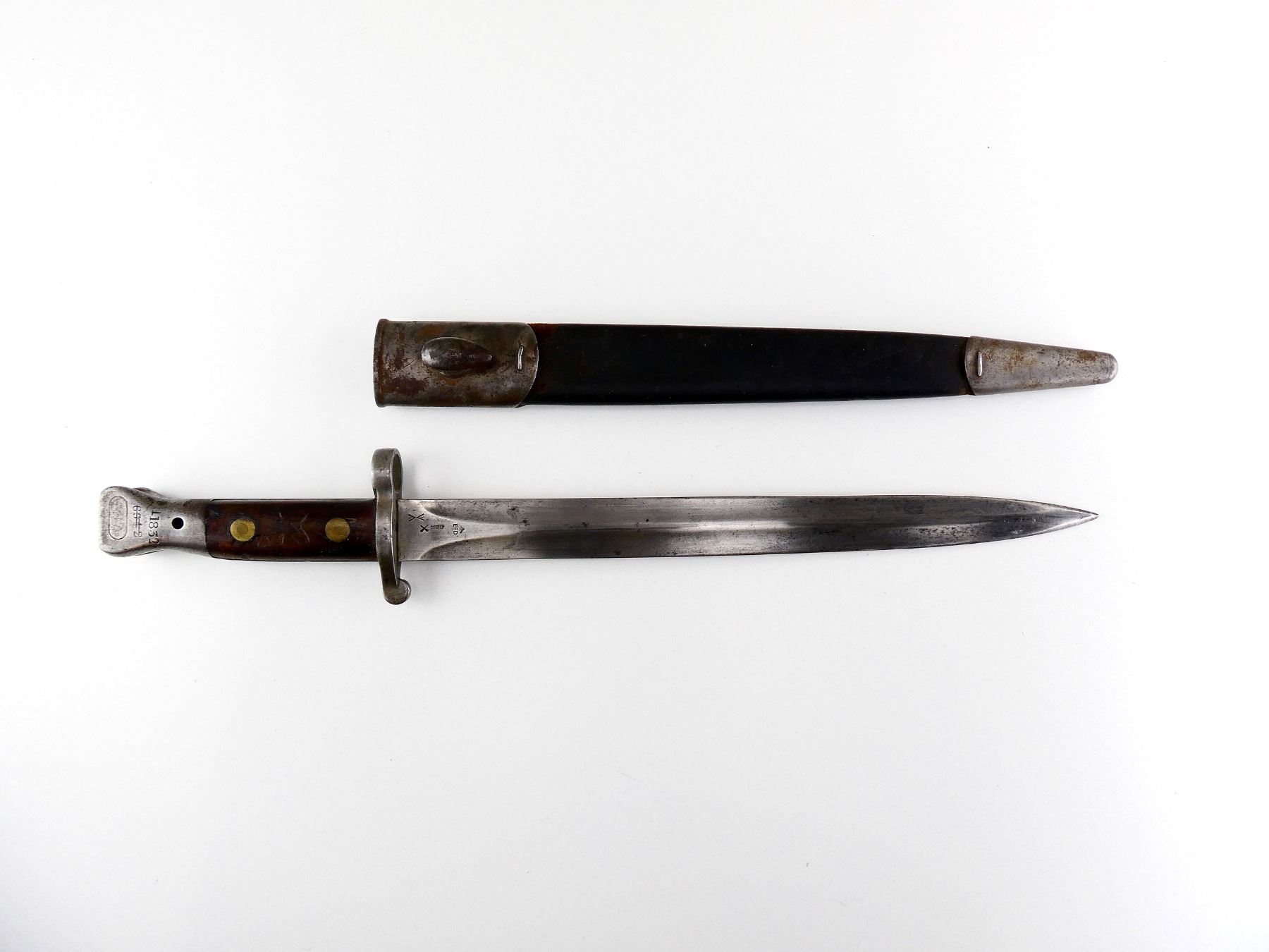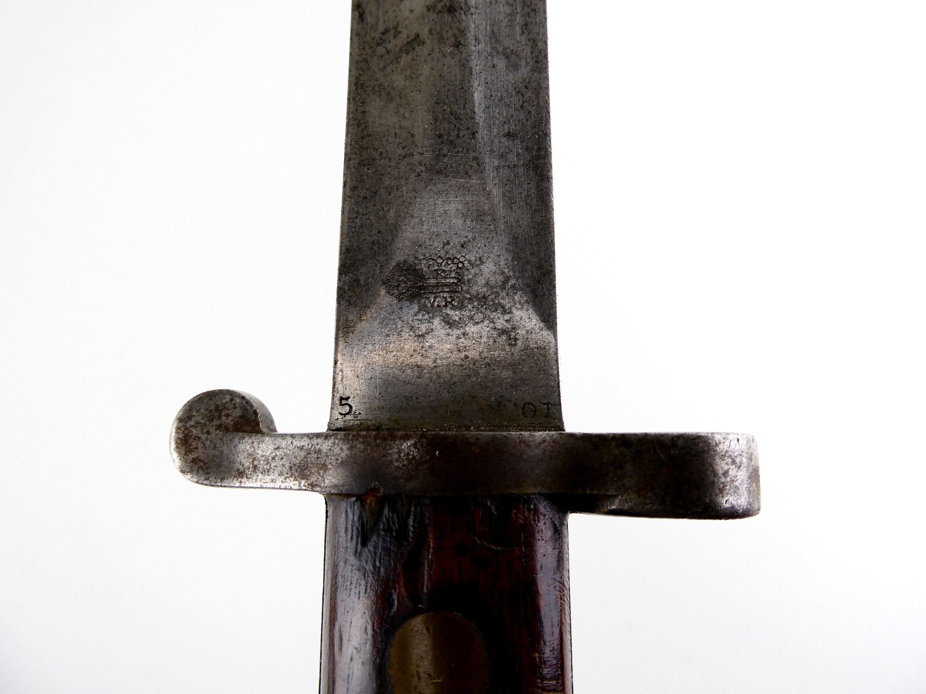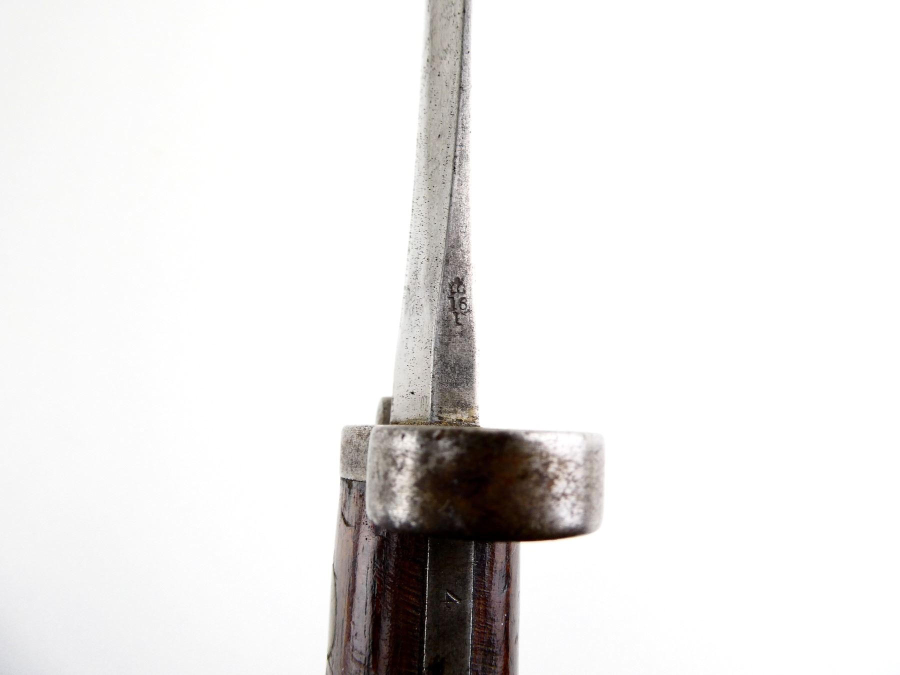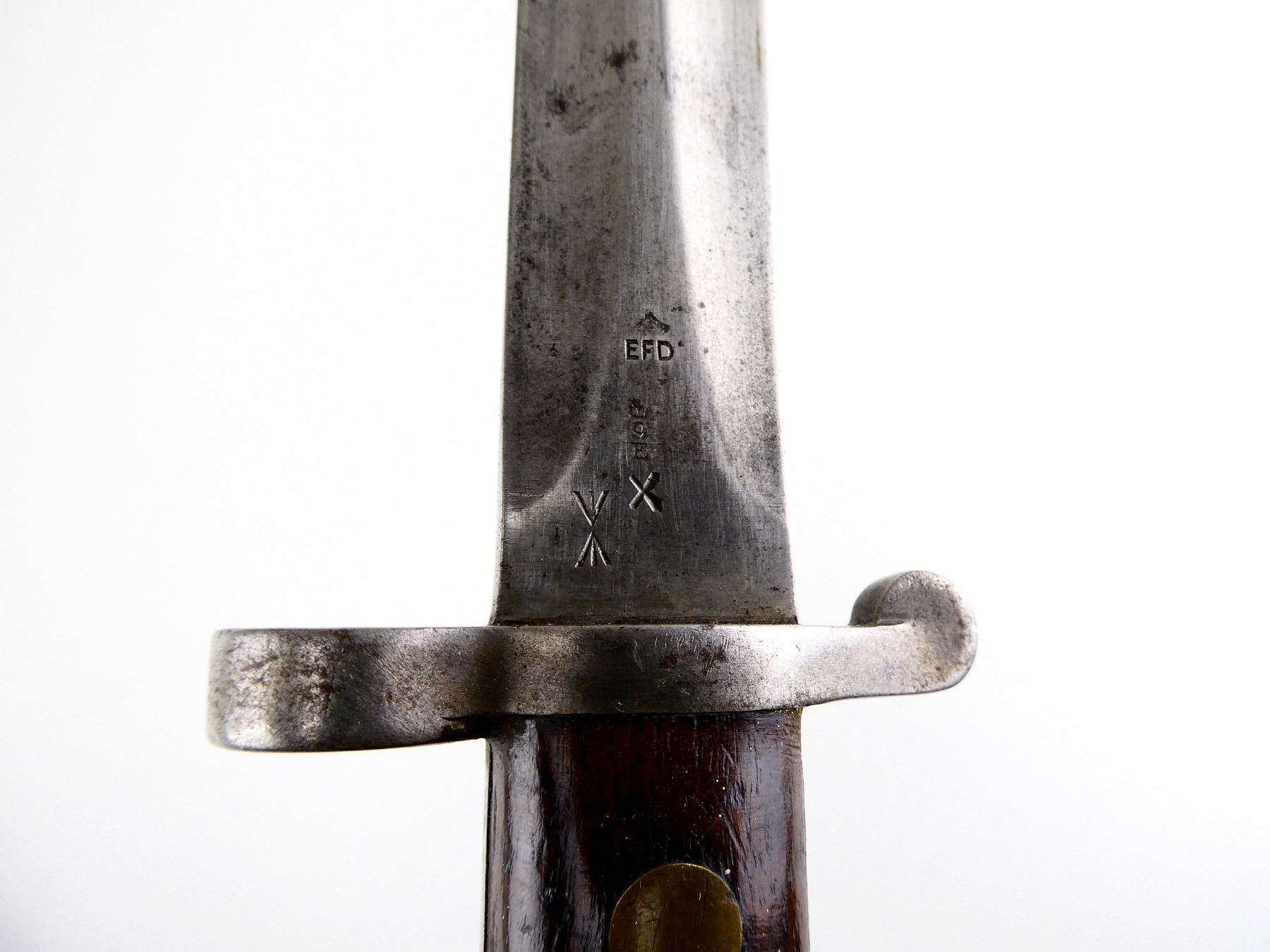 (1) FITS 1888 LEE METFORD & LONG LEE ENFIELD RIFLES, CLEAN-OUT HOLE IN POMMEL, RICASSO MARKED: CROWN OVER "VR" OVER "5 '01", OTHER-SIDE MARKED: BROAD ARROW OVER "EFD" OVER CROWN OVER "9" OVER "E" OVER "X (BEND TEST)" WITH TWO BROAD ARROWS FACING EACH OTHER, 2-PIECE WOOD GRIPS, FAINT PROOF MARK ON ONE SIDE OF GRIP, METAL IN-BETWEEN GRIPS MARKED: "4", METAL POMMEL MARKED: "11832" OVER "6342 (CROSSED OUT), LEATHER & STEEL SCABBARD, METAL ENDS BOTH MARKED: CROWN OVER "B" OVER "63", STUD FAINTLY MARKED: "9" OVER "23", BLADE APPROX. 12" & OVERALL LENGTH APPROX. 16 5/8". SEE PHOTOS.