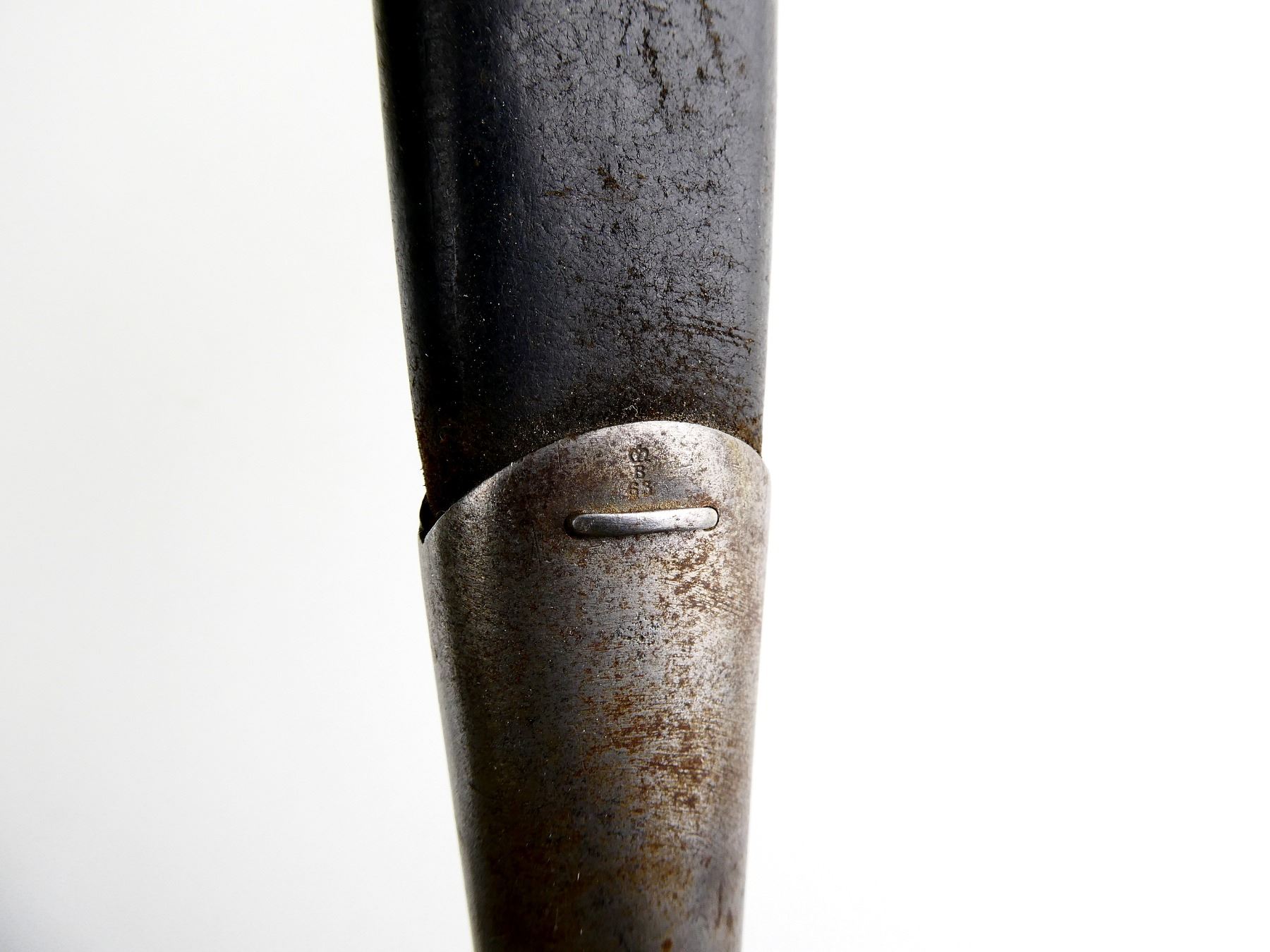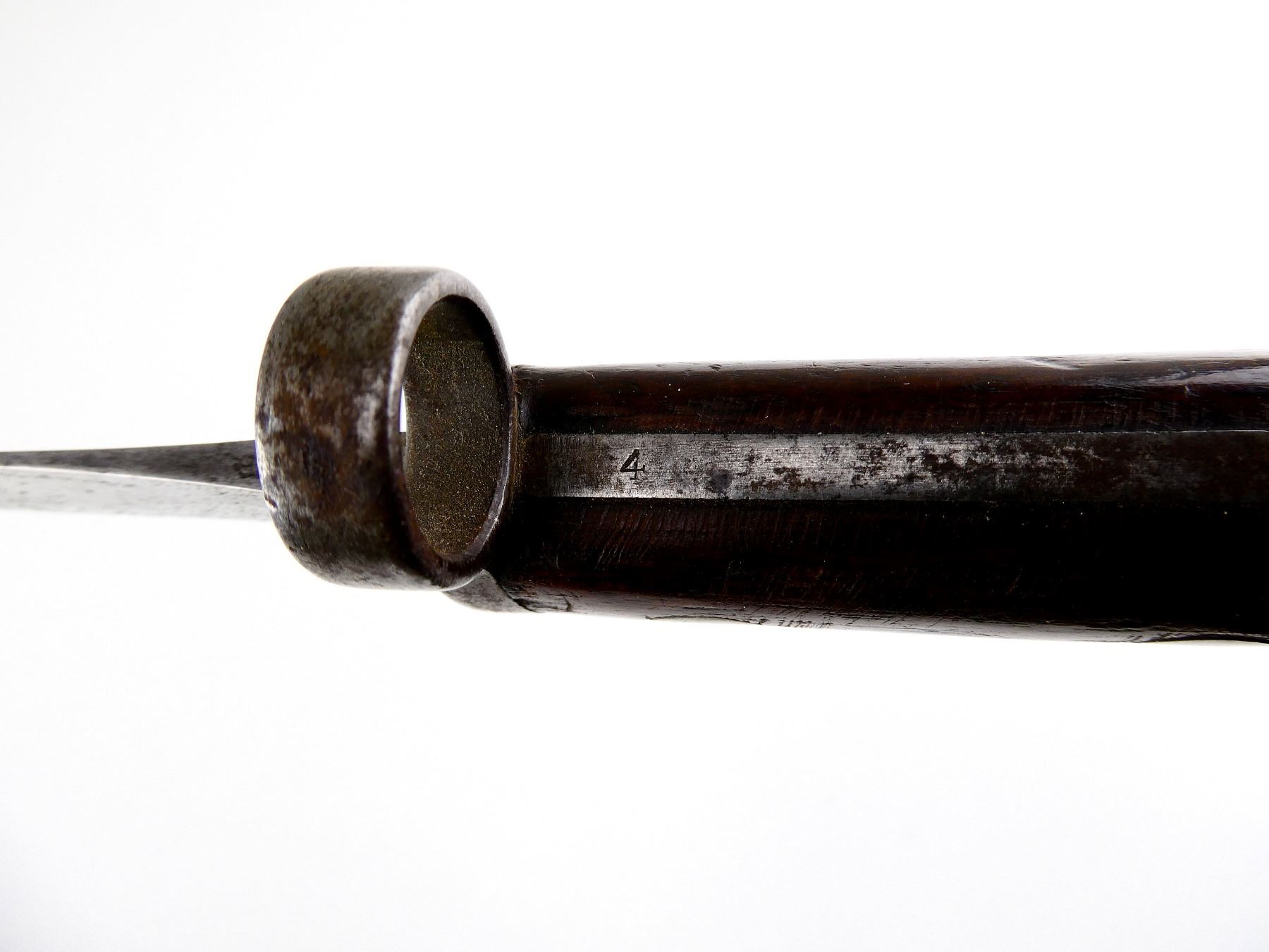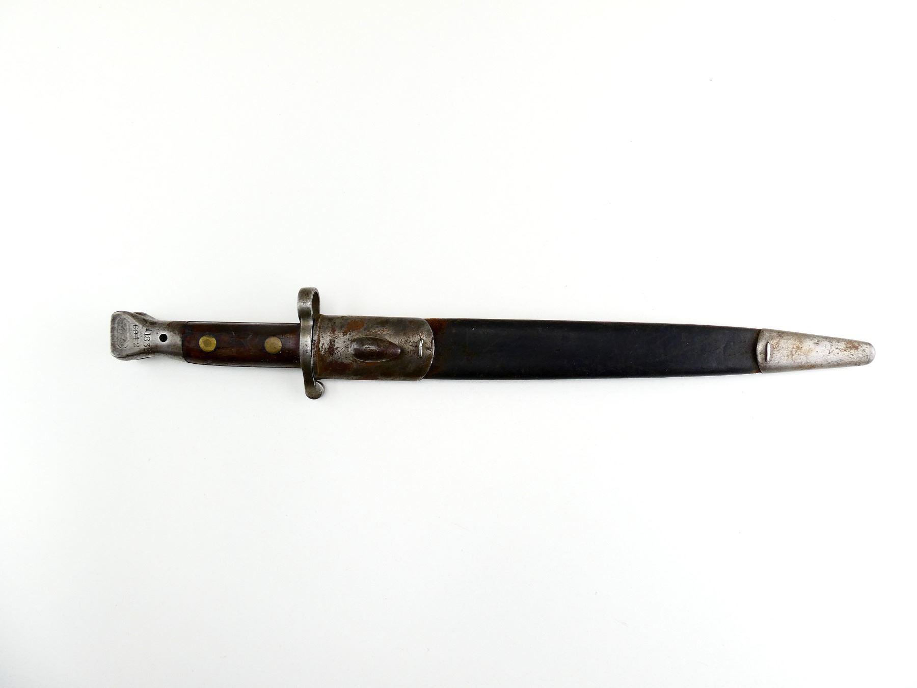(1) FITS 1888 LEE METFORD & LONG LEE ENFIELD RIFLES, CLEAN-OUT HOLE IN POMMEL, RICASSO MARKED: CROWN OVER "VR" OVER "5 '01", OTHER-SIDE MARKED: BROAD ARROW OVER "EFD" OVER CROWN OVER "9" OVER "E" OVER "X (BEND TEST)" WITH TWO BROAD ARROWS FACING EACH OTHER, 2-PIECE WOOD GRIPS, FAINT PROOF MARK ON ONE SIDE OF GRIP, METAL IN-BETWEEN GRIPS MARKED: "4", METAL POMMEL MARKED: "11832" OVER "6342 (CROSSED OUT), LEATHER & STEEL SCABBARD, METAL ENDS BOTH MARKED: CROWN OVER "B" OVER "63", STUD FAINTLY MARKED: "9" OVER "23", BLADE APPROX. 12" & OVERALL LENGTH APPROX. 16 5/8". SEE PHOTOS.