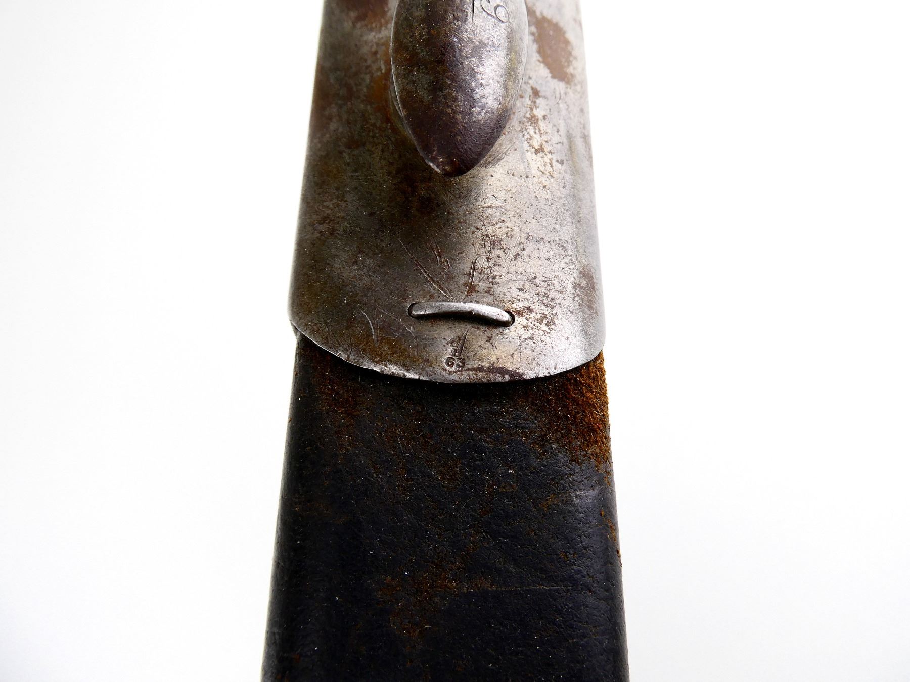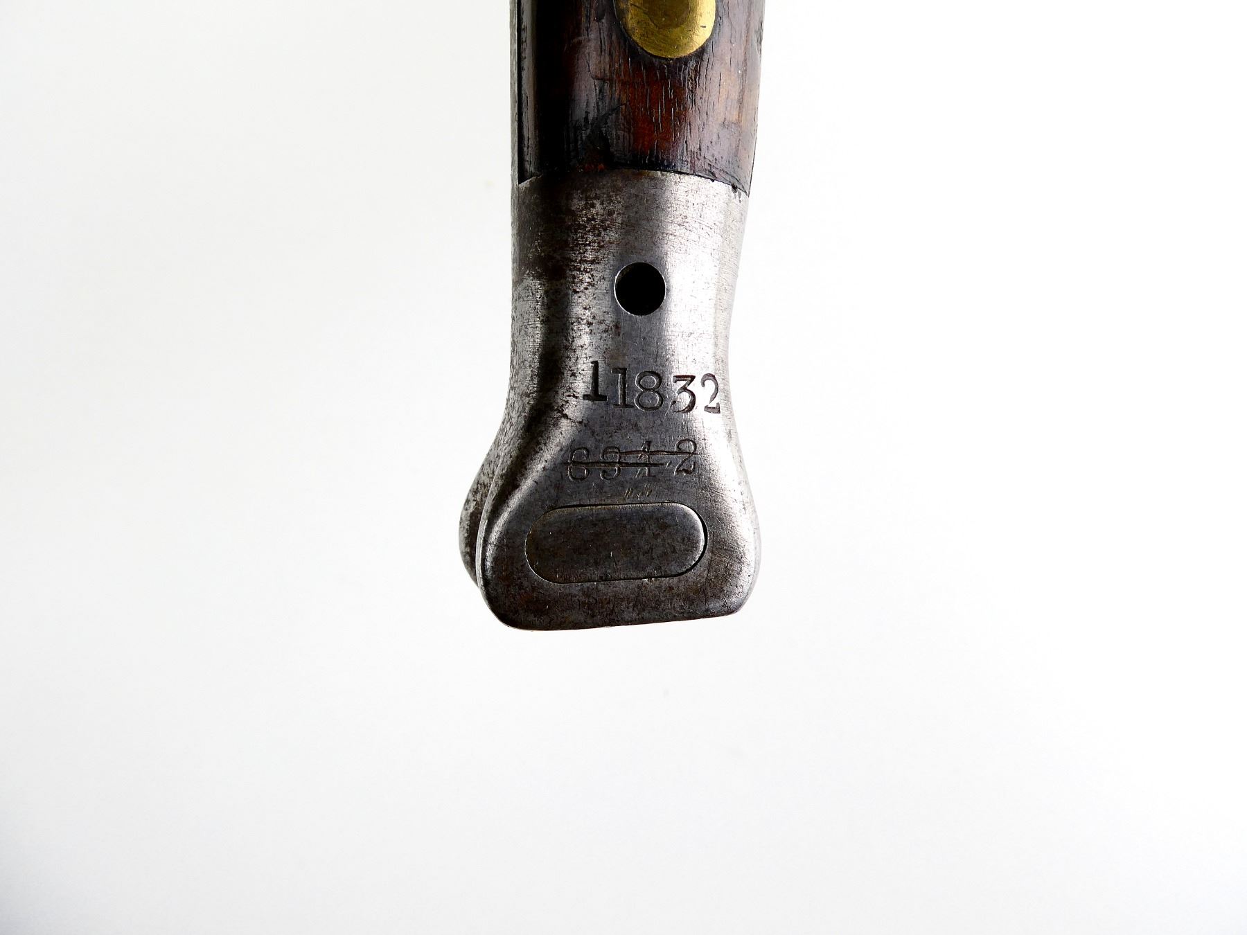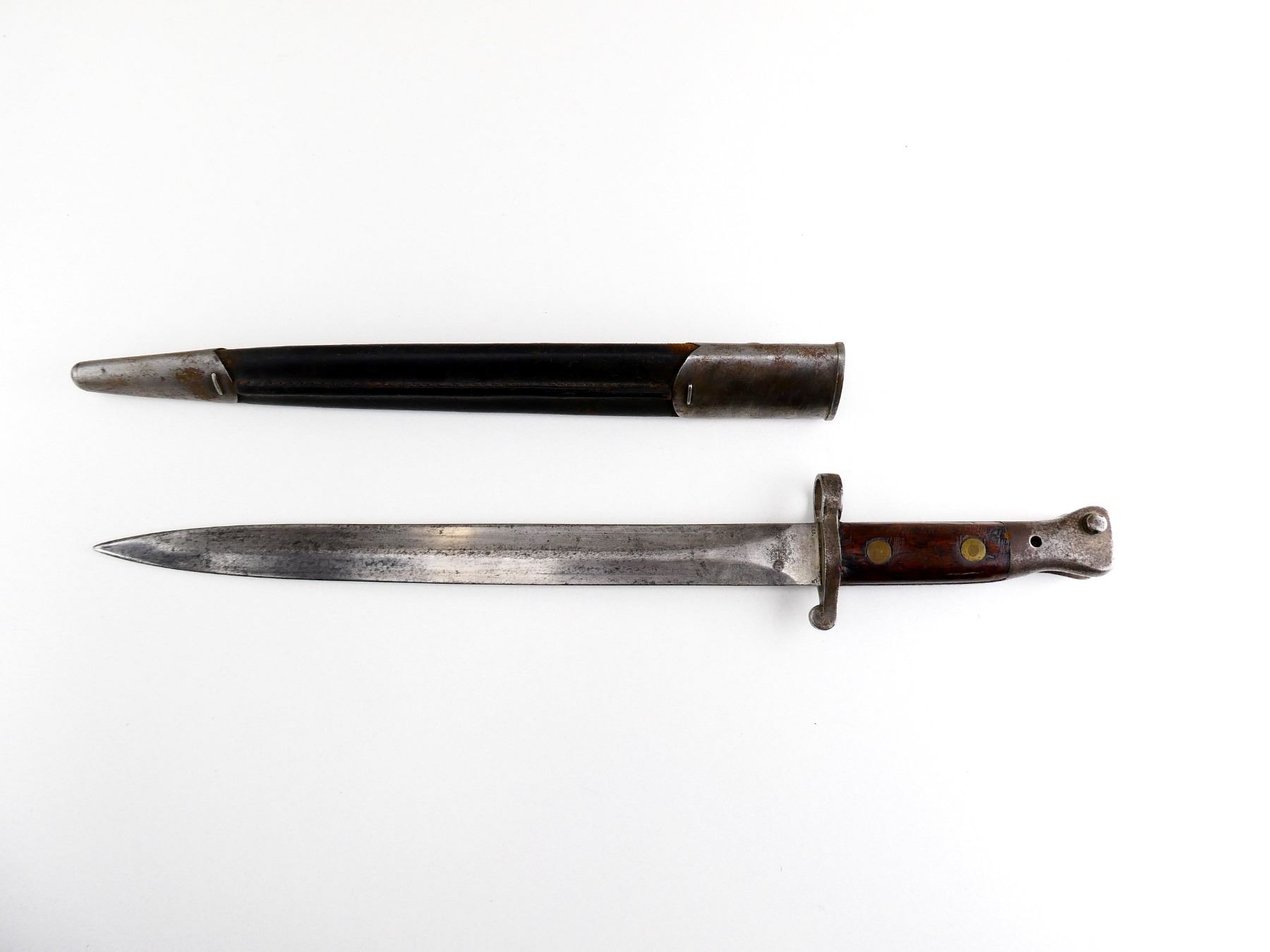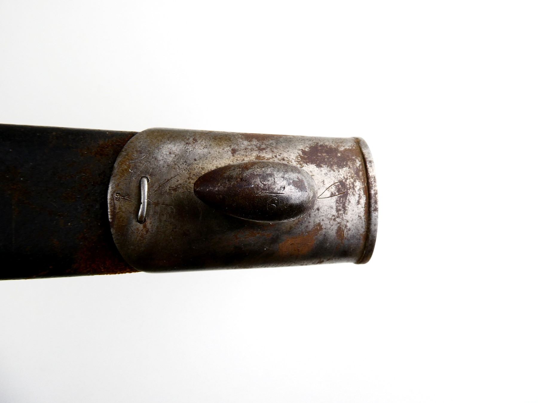 (1) FITS 1888 LEE METFORD & LONG LEE ENFIELD RIFLES, CLEAN-OUT HOLE IN POMMEL, RICASSO MARKED: CROWN OVER "VR" OVER "5 '01", OTHER-SIDE MARKED: BROAD ARROW OVER "EFD" OVER CROWN OVER "9" OVER "E" OVER "X (BEND TEST)" WITH TWO BROAD ARROWS FACING EACH OTHER, 2-PIECE WOOD GRIPS, FAINT PROOF MARK ON ONE SIDE OF GRIP, METAL IN-BETWEEN GRIPS MARKED: "4", METAL POMMEL MARKED: "11832" OVER "6342 (CROSSED OUT), LEATHER & STEEL SCABBARD, METAL ENDS BOTH MARKED: CROWN OVER "B" OVER "63", STUD FAINTLY MARKED: "9" OVER "23", BLADE APPROX. 12" & OVERALL LENGTH APPROX. 16 5/8". SEE PHOTOS.