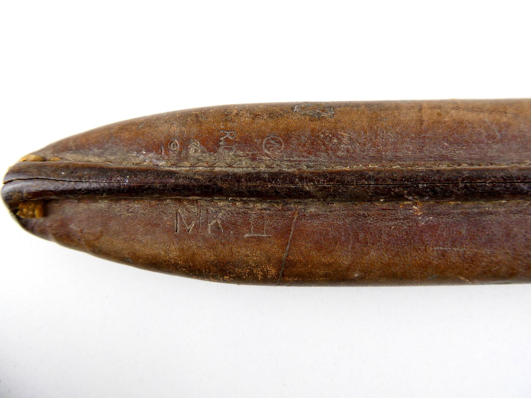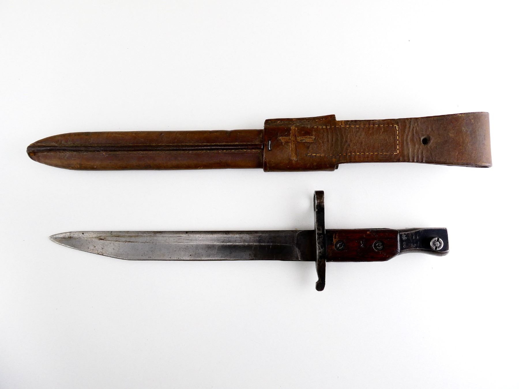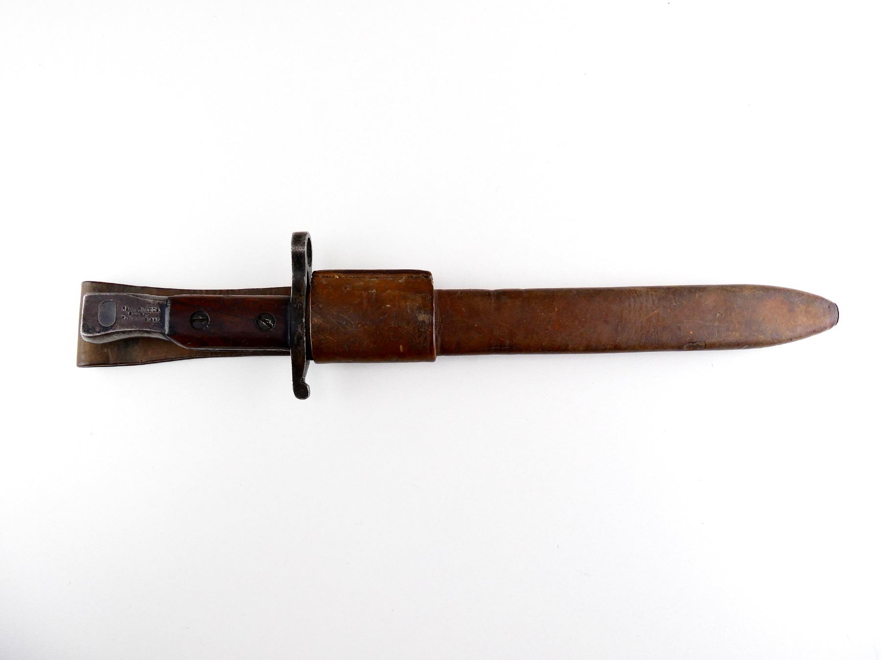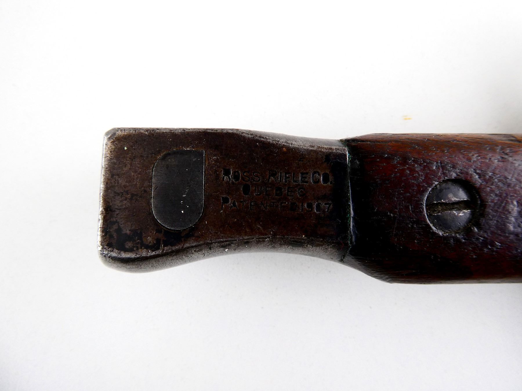 (1) FITS 1910 MKIII RIFLES, WWI MODIFIED BLADE TIP, 2-PIECE WOOD GRIP MARKED: CROWN OVER "4", OTHER-SIDE MARKED: CROWN OVER "4", METAL BETWEEN GRIPS MARKED: CROWN OVER "4" (TWICE), METAL POMMEL MARKED: "11", CROWN OVER "4", "12/15" & C-BROAD ARROW (EARLY VERSION), OTHER-SIDE MARKED: "ROSS RIFLE CO., QUEBEC, PATENTED 1907", BROWN LEATHER SCABBARD MARKED: "MK. II", "R.R.C., 1916" WITH C-BROAD ARROW, METAL TIP MARKED WITH CROWN, THROAT MARKED: CROWN OVER "4", BLADE APPROX. 10" & OVERALL LENGTH APPROX. 14.5". SEE PHOTOS.