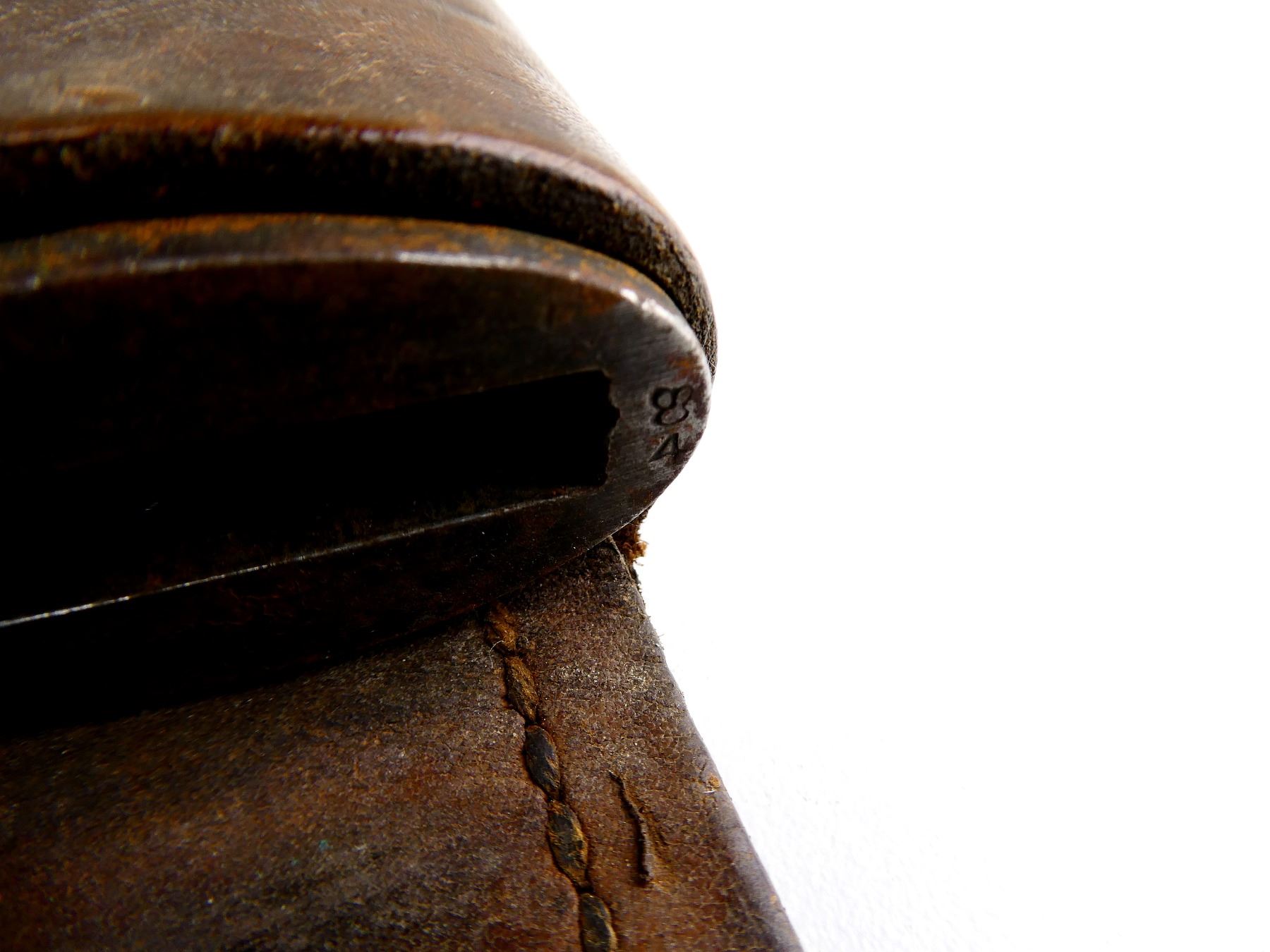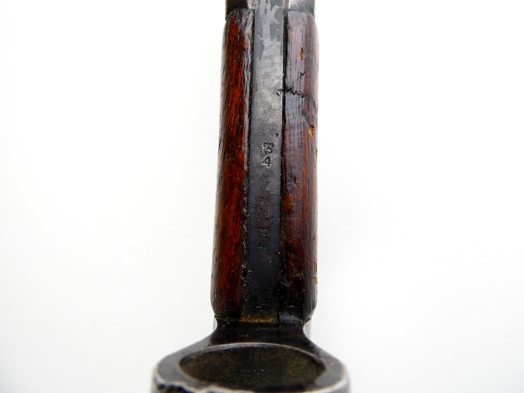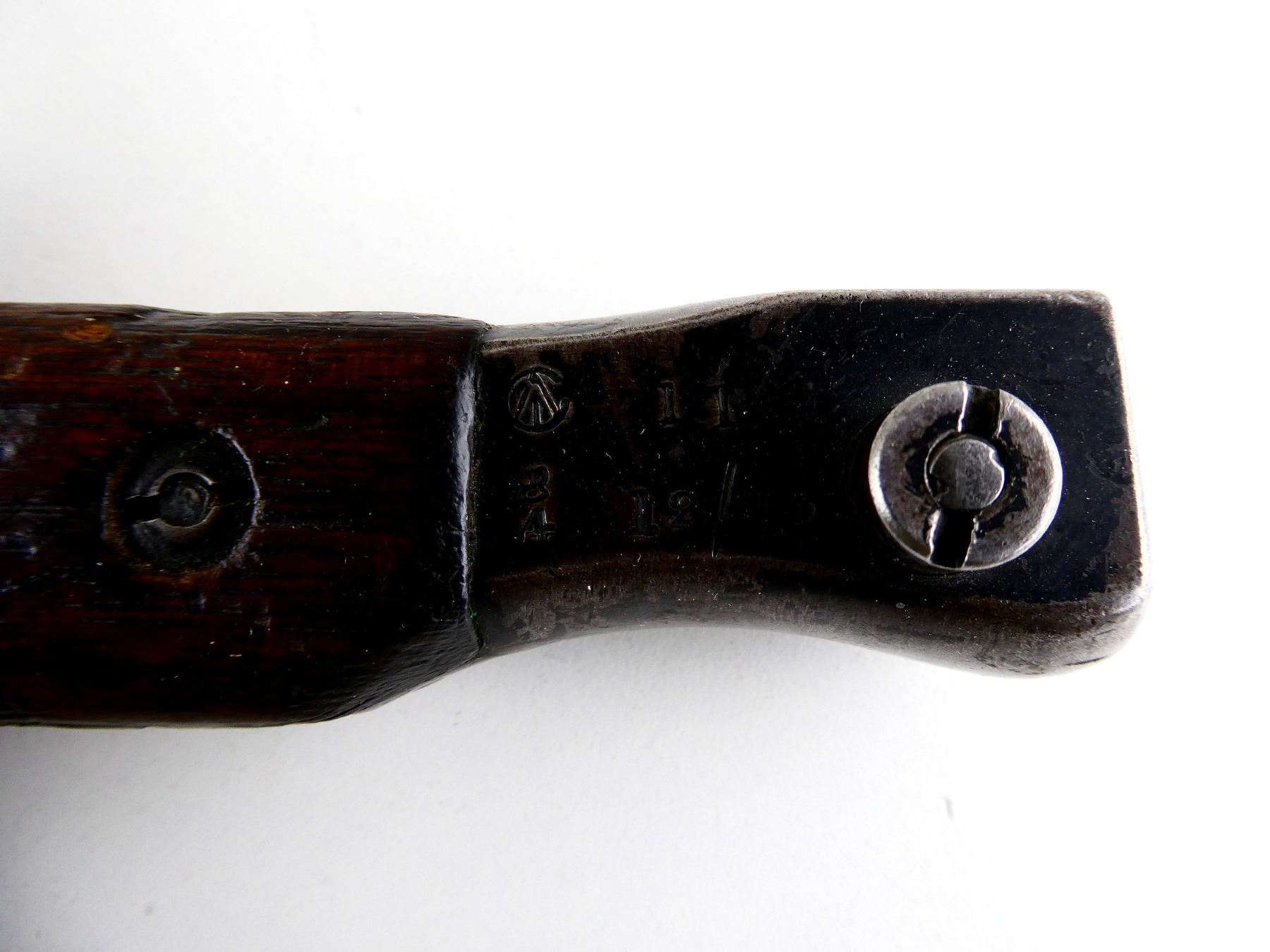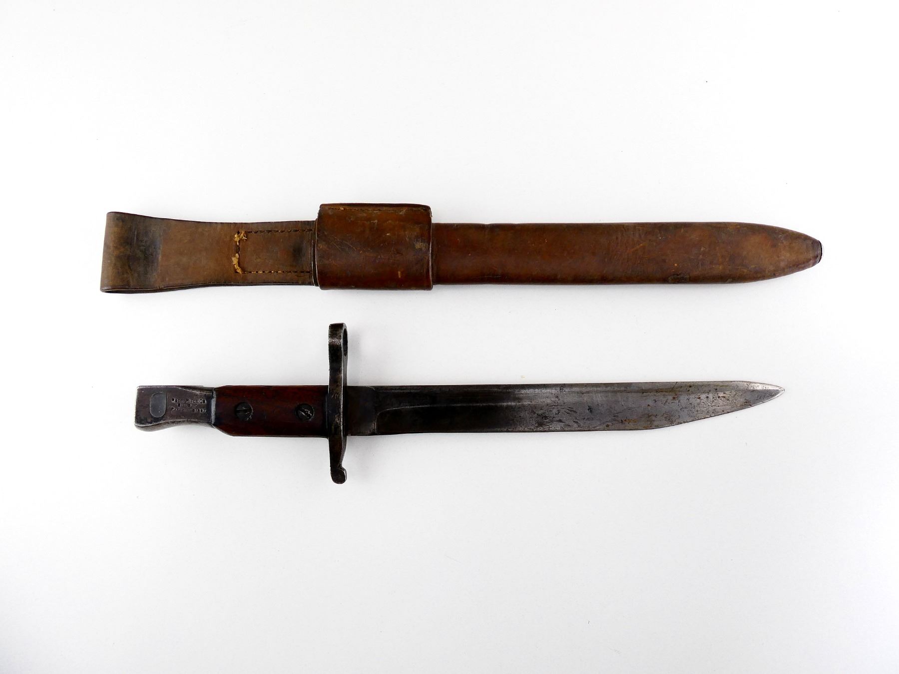 (1) FITS 1910 MKIII RIFLES, WWI MODIFIED BLADE TIP, 2-PIECE WOOD GRIP MARKED: CROWN OVER "4", OTHER-SIDE MARKED: CROWN OVER "4", METAL BETWEEN GRIPS MARKED: CROWN OVER "4" (TWICE), METAL POMMEL MARKED: "11", CROWN OVER "4", "12/15" & C-BROAD ARROW (EARLY VERSION), OTHER-SIDE MARKED: "ROSS RIFLE CO., QUEBEC, PATENTED 1907", BROWN LEATHER SCABBARD MARKED: "MK. II", "R.R.C., 1916" WITH C-BROAD ARROW, METAL TIP MARKED WITH CROWN, THROAT MARKED: CROWN OVER "4", BLADE APPROX. 10" & OVERALL LENGTH APPROX. 14.5". SEE PHOTOS.