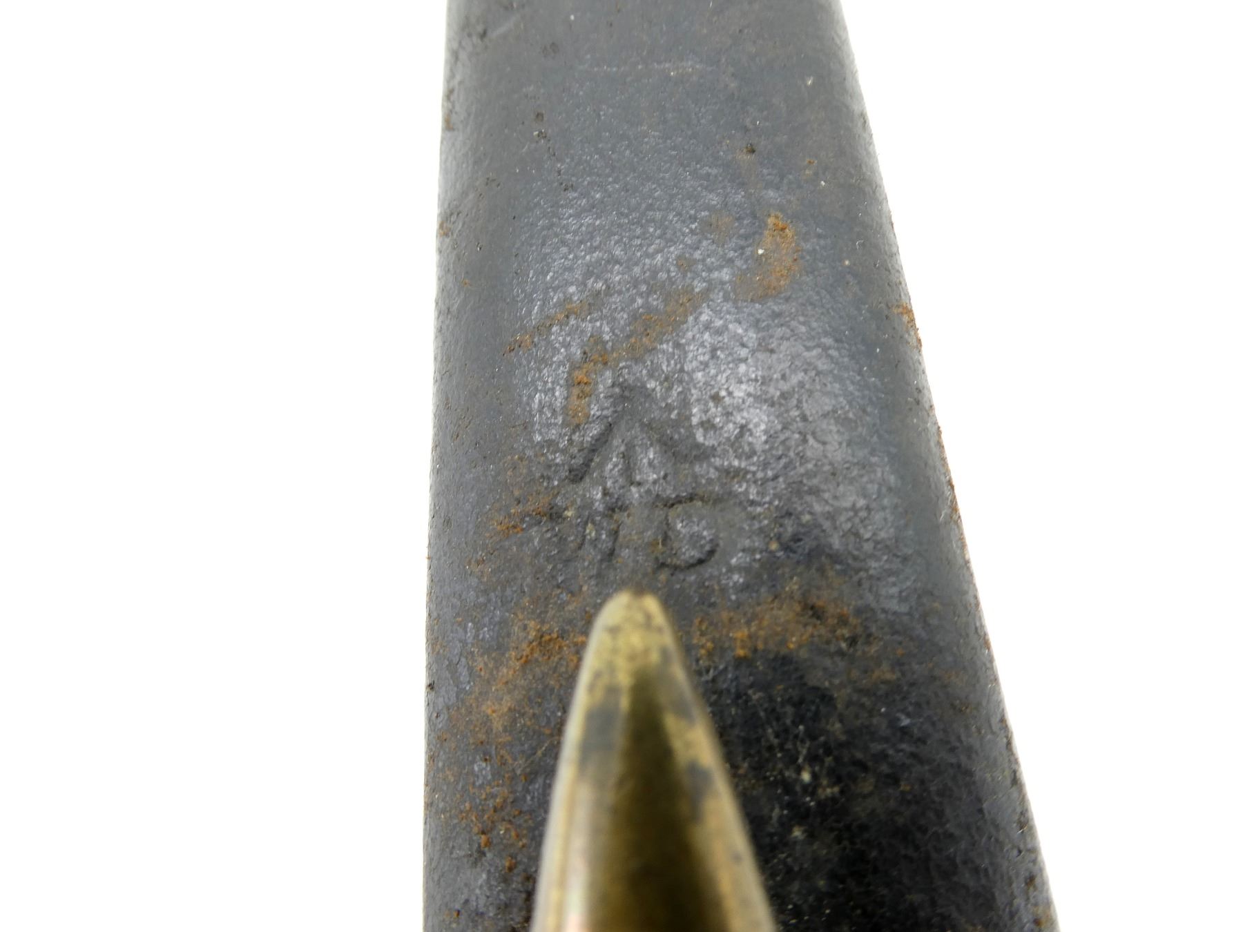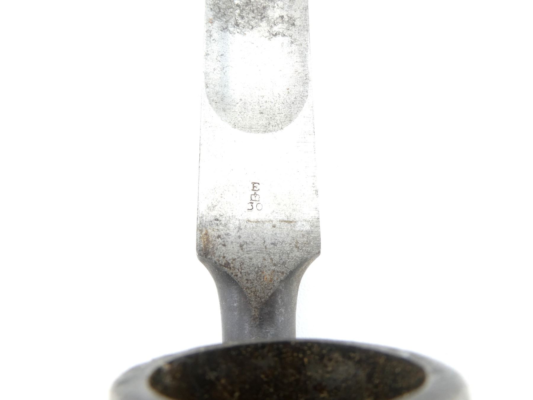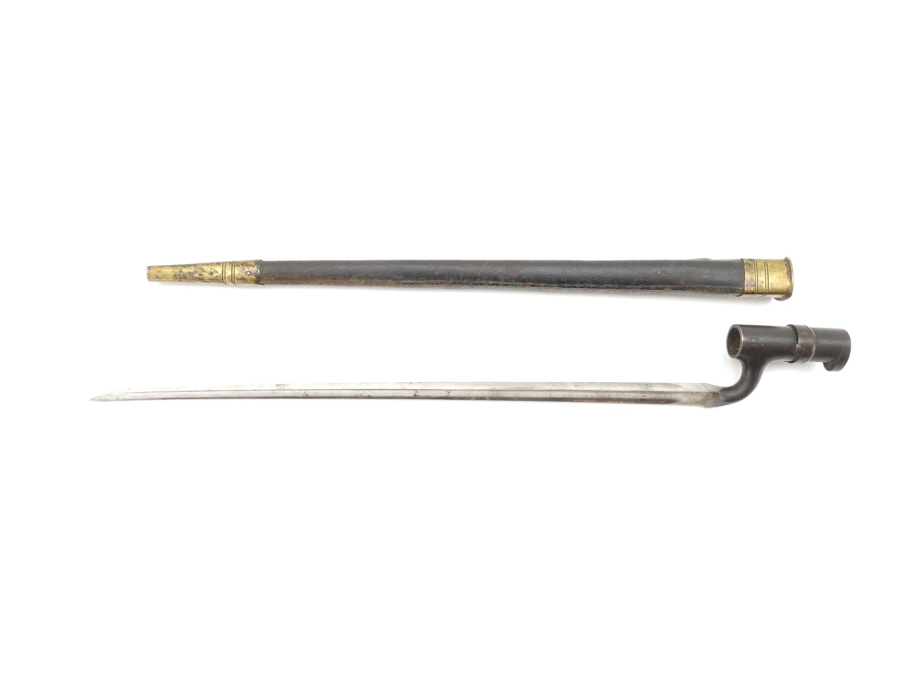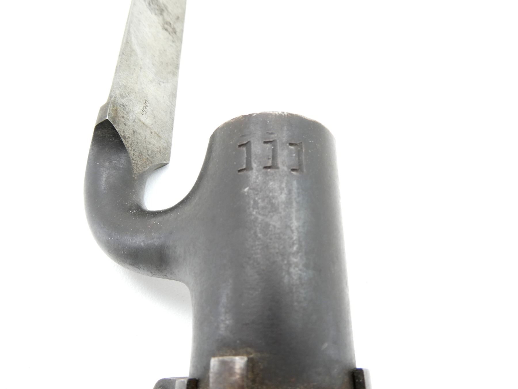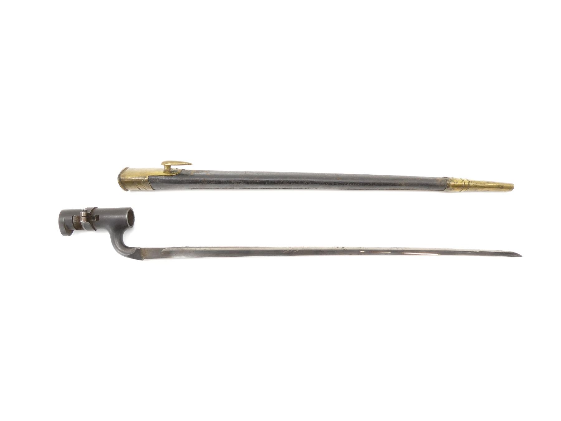 (1) FITS BRITISH 1853 ENFIELD & SNIDER-ENFIELD MUSKETS, BLADE MARKED: "E" OVER CROWN OVER "30", SOCKET MARKED: "111", WITH LOCKING RING, BLACK LEATHER & BRASS SCABBARD, LEATHER MARKED: BROAD ARROW OVER "WD", MUZZLE RING APPROX. 0.79" DIA., BLADE APPROX. 17.25" & OVERALL LENGTH APPROX. 20.75". SEE PHOTOS.