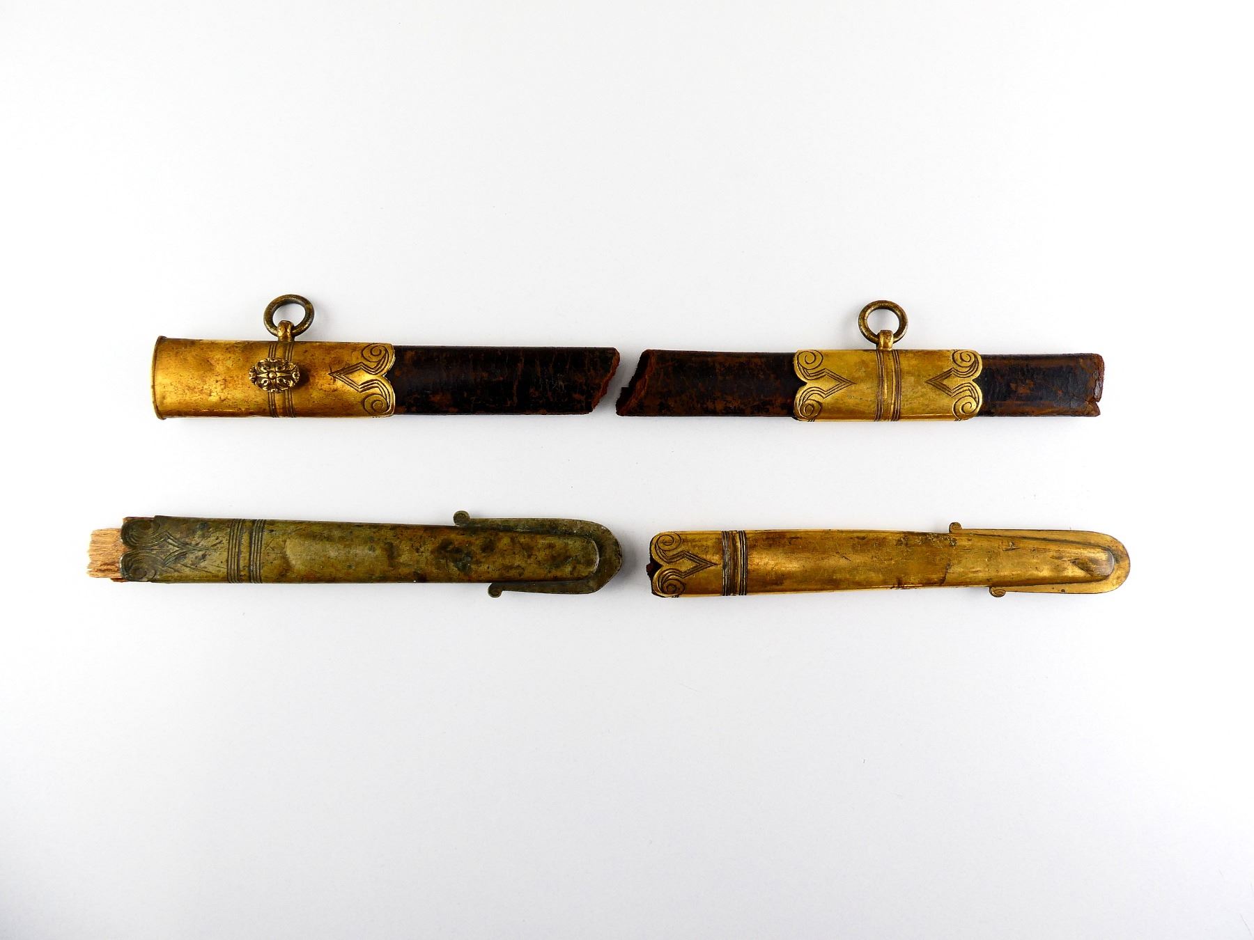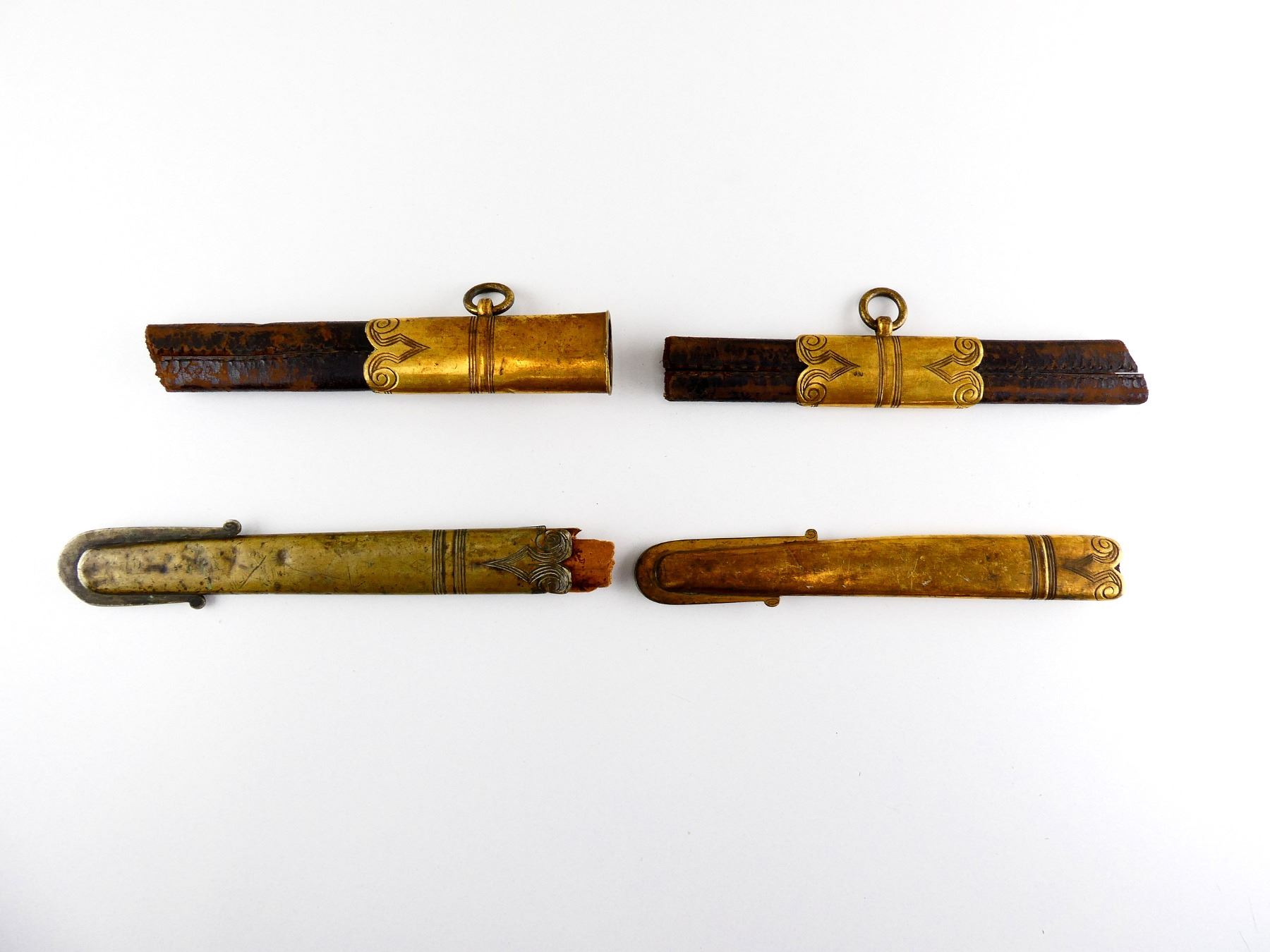 LOT INCLUDES; (3) PIECES OF SWORD SCABBARD, APPEAR TO FIT TOGETHER, PARTS OF LEATHER MISSING, BRASS ENDS / FITTINGS, DECORATIVE ETCHINGS ON BRASS, DECORATIVE STUD, NO VISIBLE MARKINGS, SHOWS AGE / WEAR / TEAR, OALS APPROX. 7.5" TO 8.25" & (1) SWORD SCABBARD TIP END, SIMILAR STYLE TO THE OTHER SCABBARD PIECES IN THIS LOT, BRASS DISCOLOURED, DECORATIVE ETCHINGS ON BRASS, NO VISIBLE MARKINGS, SHOWS AGE / WEAR / TEAR, OVERALL LENGTH APPROX. 8.75". SEE PHOTOS.