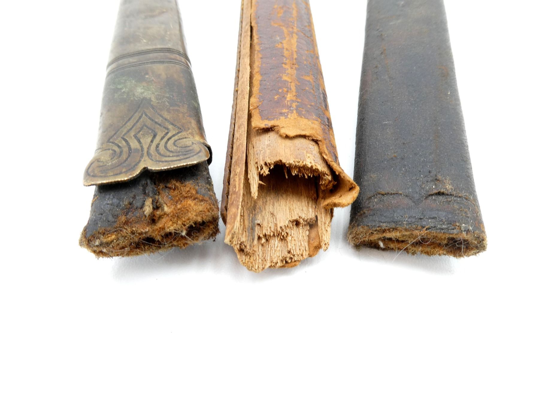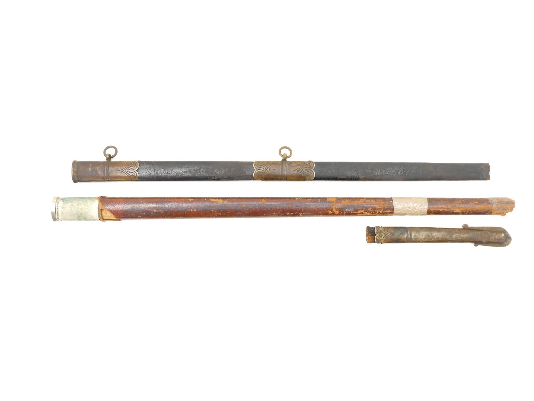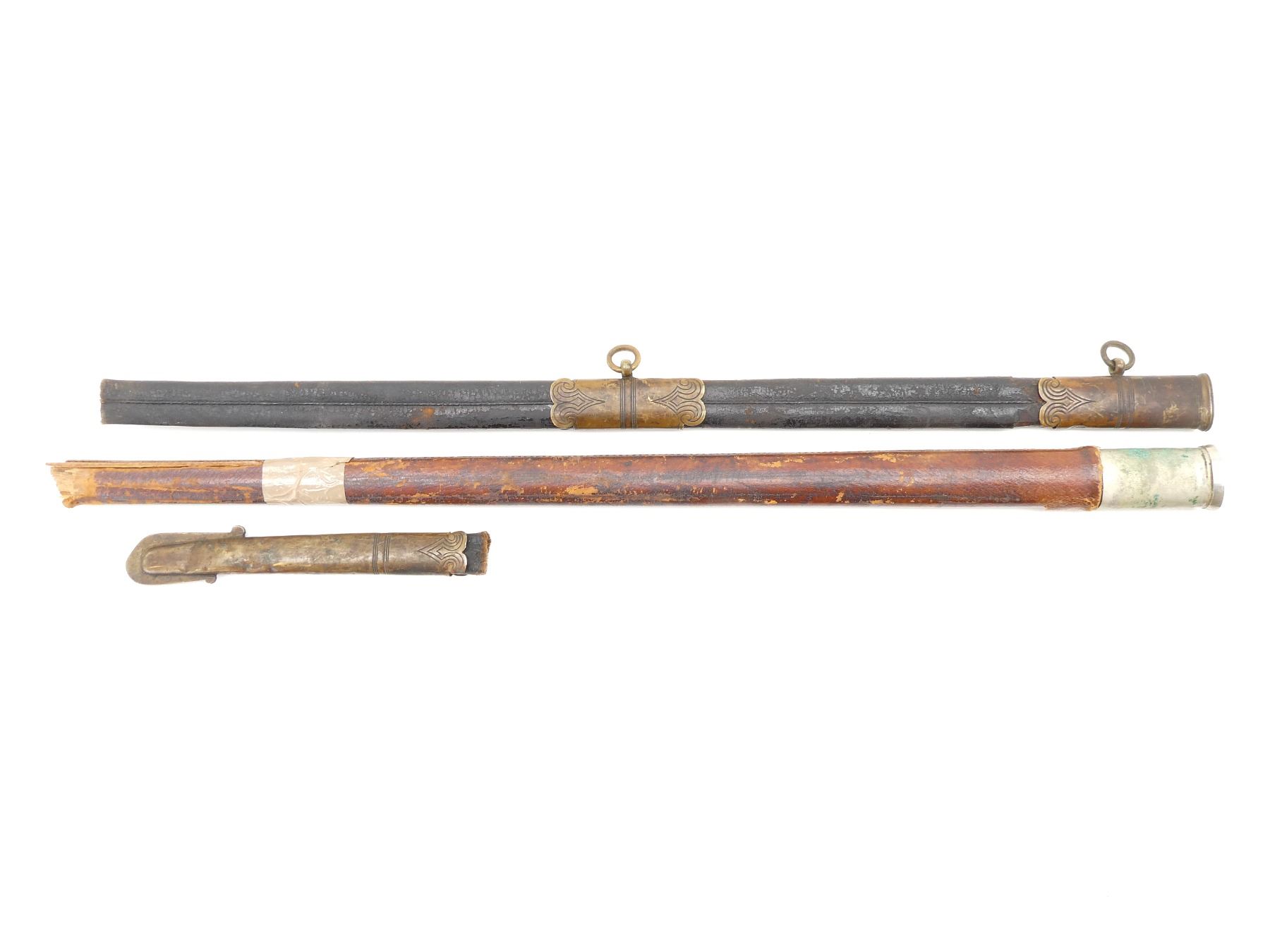 LOT INCLUDES; (1) BRASS / LEATHER SCABBARD, TIP END BROKEN OFF BUT PRESENT, DECORATIVE ETCHINGS ON BRASS, TWO HANGER LOOPS, NO VISIBLE MARKINGS, SHOWS AGE / WEAR / TEAR, OALS APPROX. 8 5/8" / 25.25" & (1) BROWN LEATHER WRAPPED WOOD SCABBARD WITH METAL THROAT END, NO VISIBLE MARKINGS, TIP END BROKEN OFF, TAPE NEAR TIP END, SHOWS AGE / WEAR / TEAR, OVERALL LENGTH APPROX. 27.5". SEE PHOTOS.