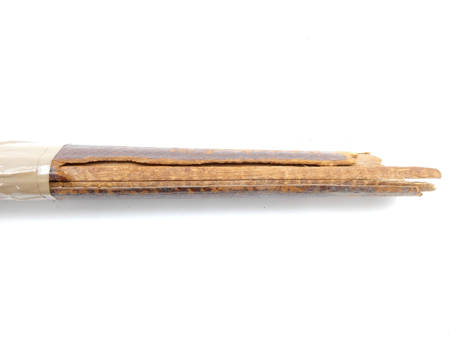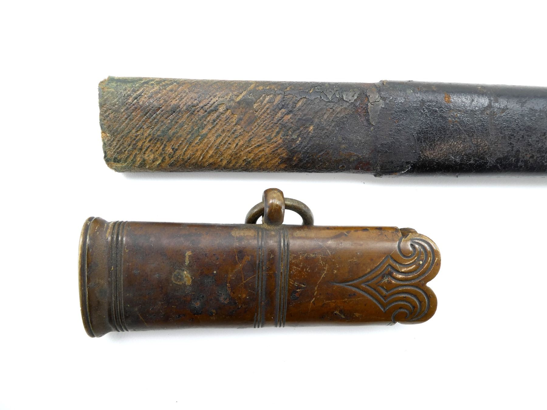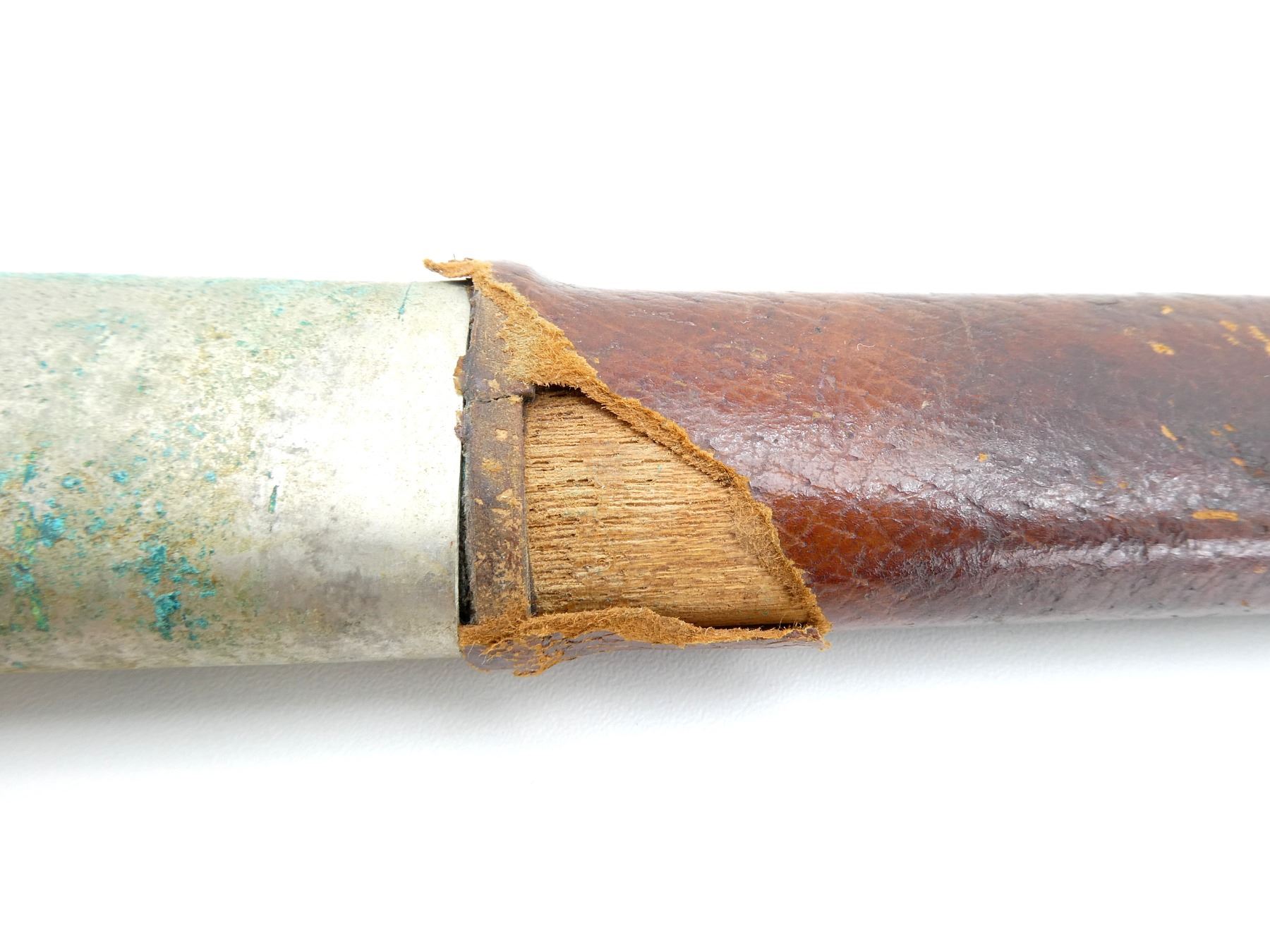 LOT INCLUDES; (1) BRASS / LEATHER SCABBARD, TIP END BROKEN OFF BUT PRESENT, DECORATIVE ETCHINGS ON BRASS, TWO HANGER LOOPS, NO VISIBLE MARKINGS, SHOWS AGE / WEAR / TEAR, OALS APPROX. 8 5/8" / 25.25" & (1) BROWN LEATHER WRAPPED WOOD SCABBARD WITH METAL THROAT END, NO VISIBLE MARKINGS, TIP END BROKEN OFF, TAPE NEAR TIP END, SHOWS AGE / WEAR / TEAR, OVERALL LENGTH APPROX. 27.5". SEE PHOTOS.