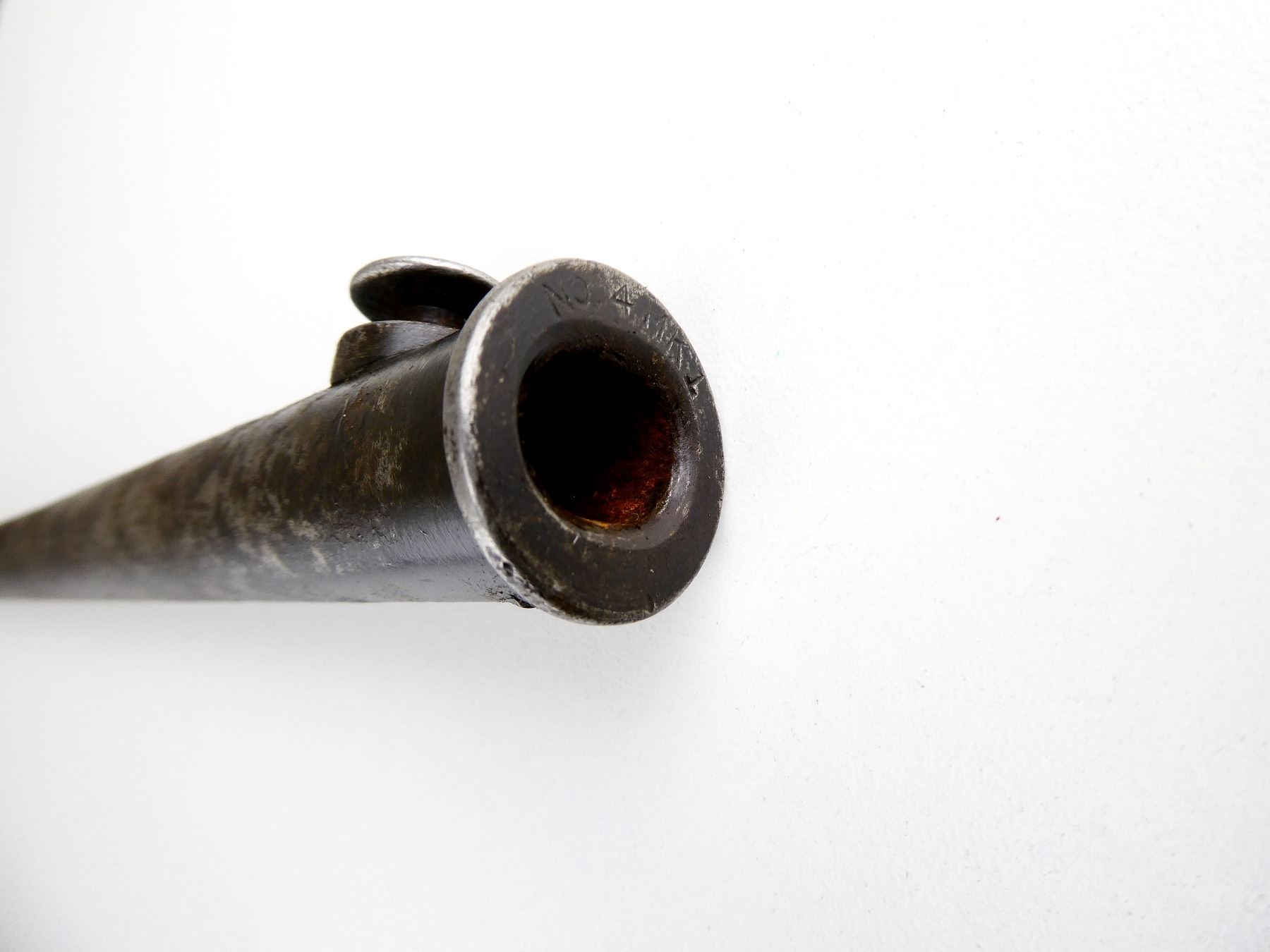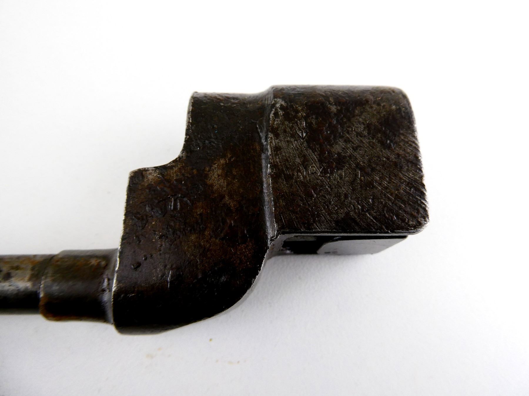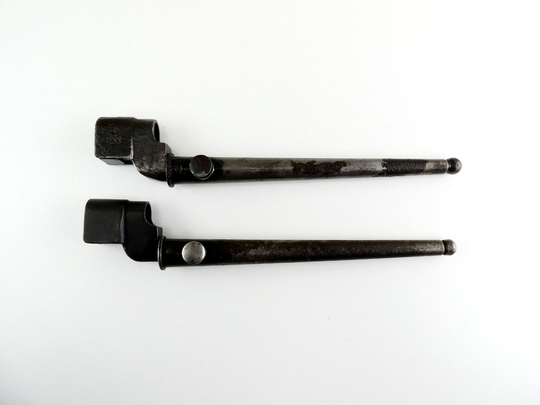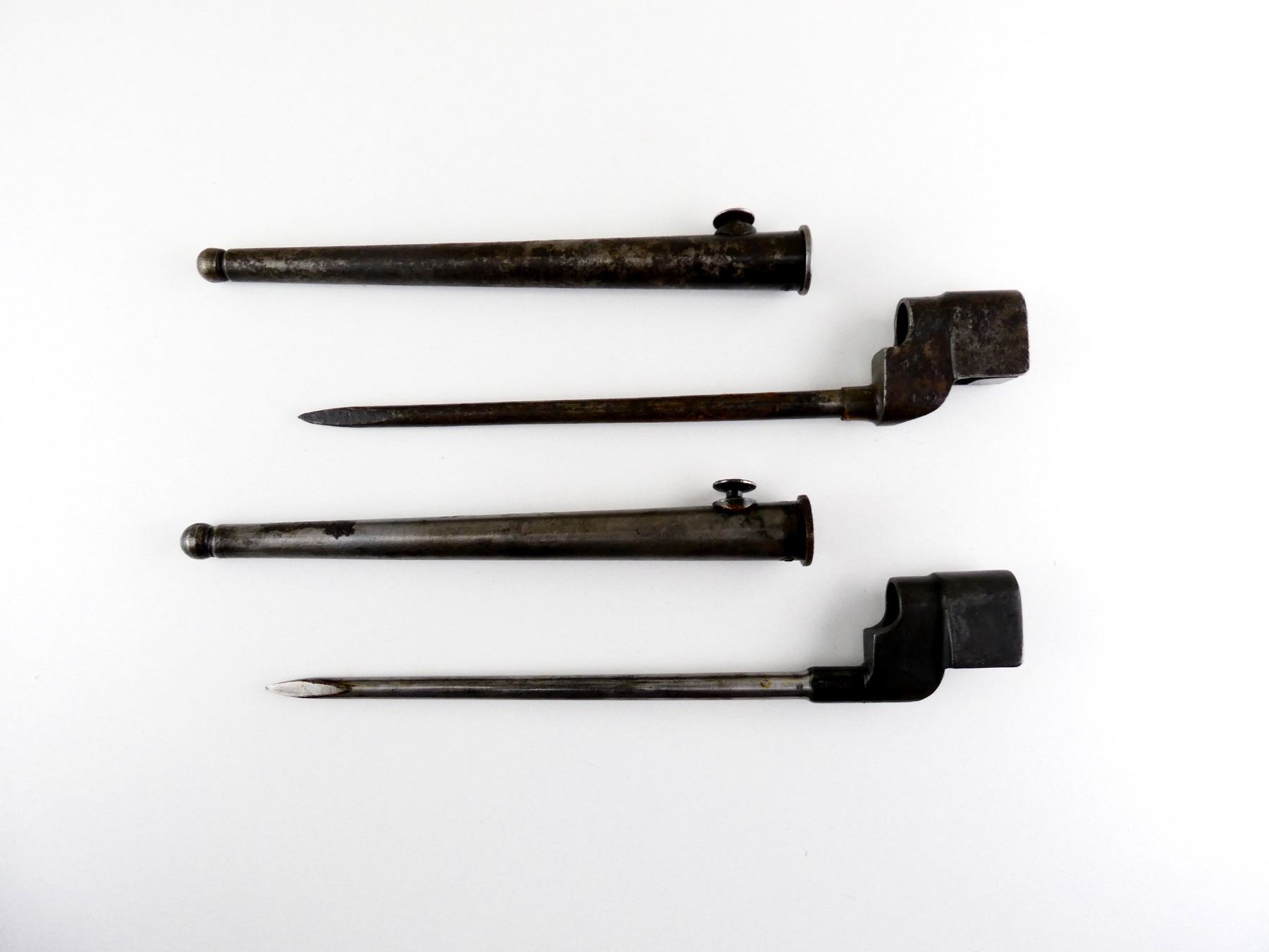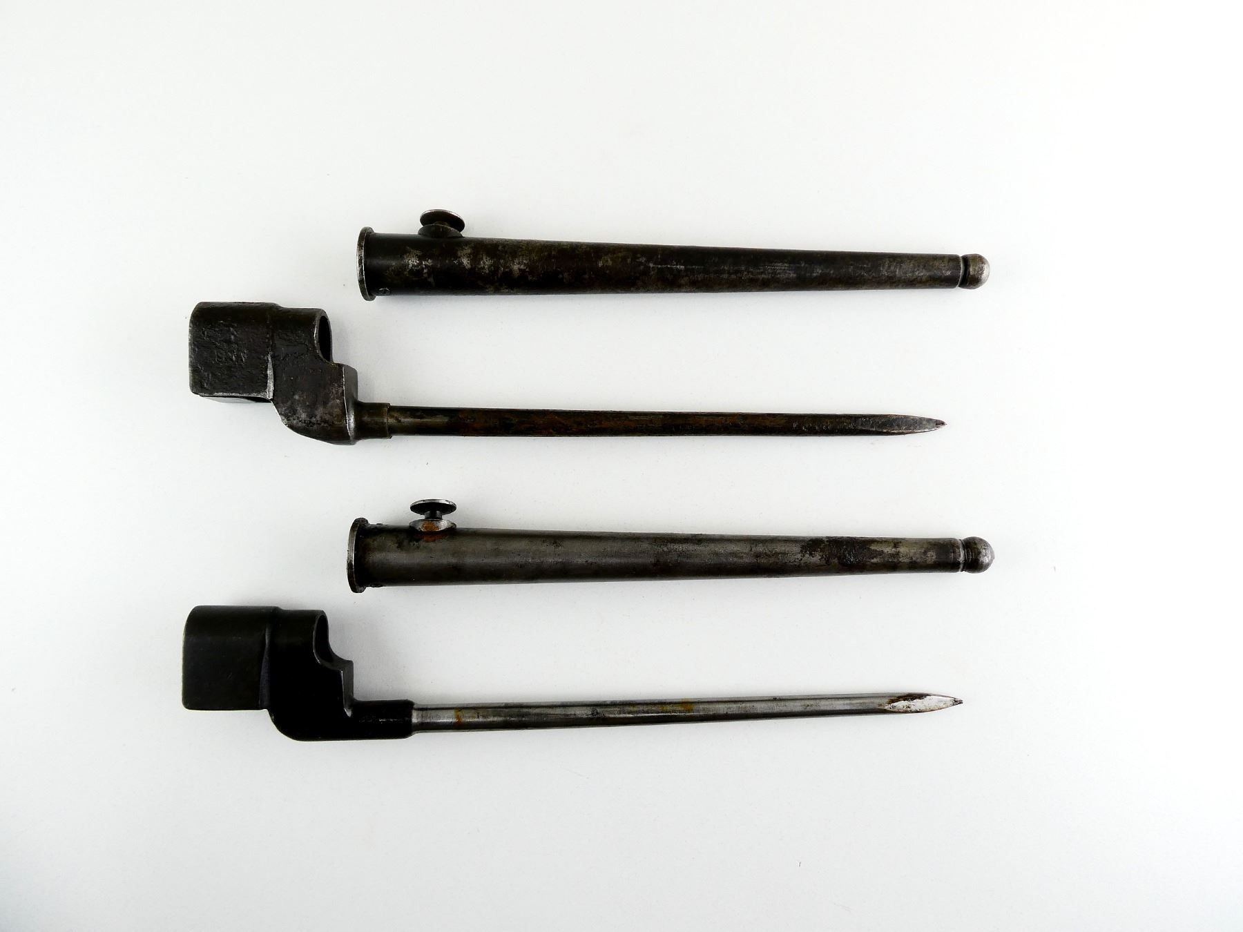 LOT INCLUDES; (1) NO.4 MKII SPIKE BAYONET, FITS LEE ENFIELD NO.4 MKI & MKII SERIES RIFLES, CATCH RELEASE IS STUCK, SOCKET MARKED: "G" CROWN "R" OVER "NO4 MK II", "S?", "Z", METAL MKI SCABBARD, THROAT MARKED: "??? MKI.", BROAD ARROW, "SSP 1940", BLADE APPROX. 8 1/8", OVERALL LENGTH APPROX. 10" & (1) NO.4 MKII* SPIKE BAYONET, FITS LEE ENFIELD NO.4 MKI & MKII SERIES RIFLES, CATCH RELEASE IS STUCK, SOCKET MARKED: "NO4 MKI??" OVER "?S & S LTD", BROAD ARROWS, "VNS", "N, 67", METAL MKI SCABBARD, THROAT MARKED: "NO. 4 MK1", BLADE APPROX. 8" & OVERALL LENGTH APPROX. 9 7/8". SEE PHOTOS.