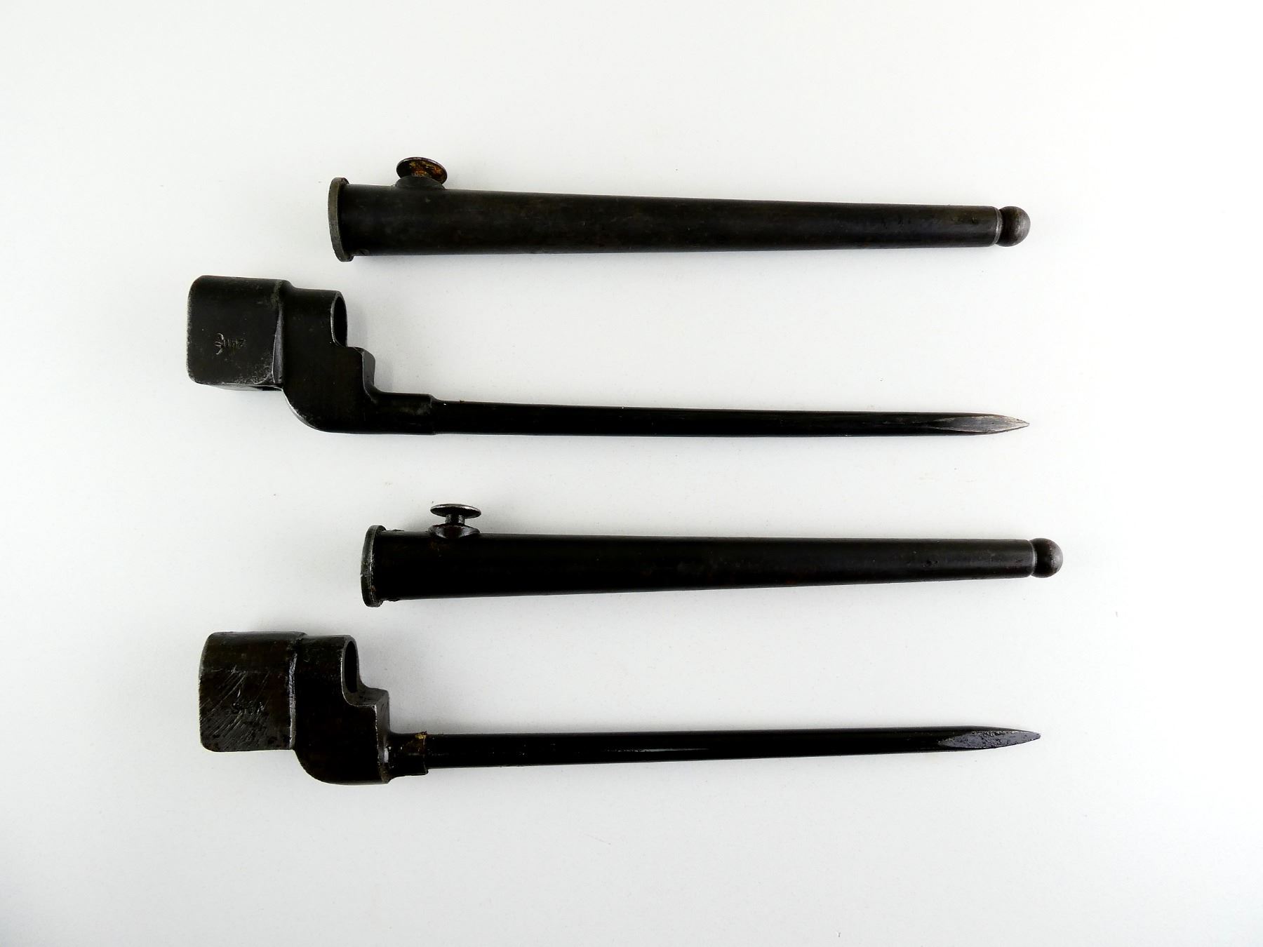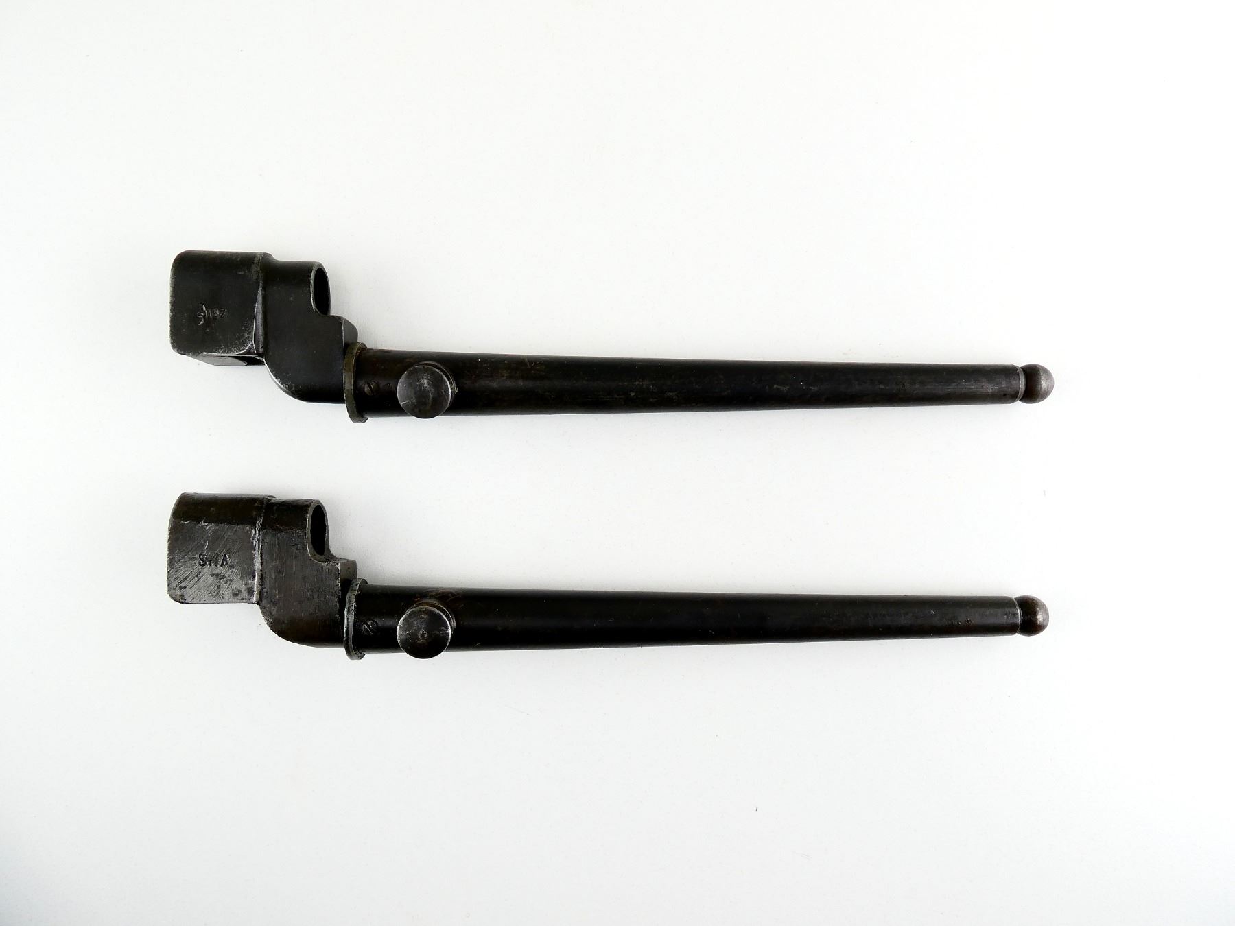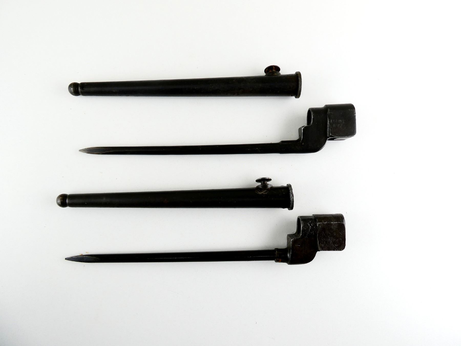LOT INCLUDES; (1) NO.4 MKII SPIKE BAYONET, FITS LEE ENFIELD NO.4 MKI & MKII SERIES RIFLES, SOCKET MARKED: "NO4 MK II, N67", "N, 67", "115Z", BROAD ARROW, METAL MKI SCABBARD, NO VISIBLE MARKINGS, BLADE APPROX. 8 1/8", OVERALL LENGTH APPROX. 10" & (1) NO.4 MKII* SPIKE BAYONET, FITS LEE ENFIELD NO.4 MKI & MKII SERIES RIFLES, CATCH RELEASE IS STUCK, SOCKET MARKED: "NO4MK II*, P.S&SLTD", "VNS", BROAD ARROW OVER "?", "N??" IN A CIRCLE, METAL MKI SCABBARD, NO VISIBLE MARKINGS, BLADE APPROX. 8" & OVERALL LENGTH APPROX. 10". SEE PHOTOS.