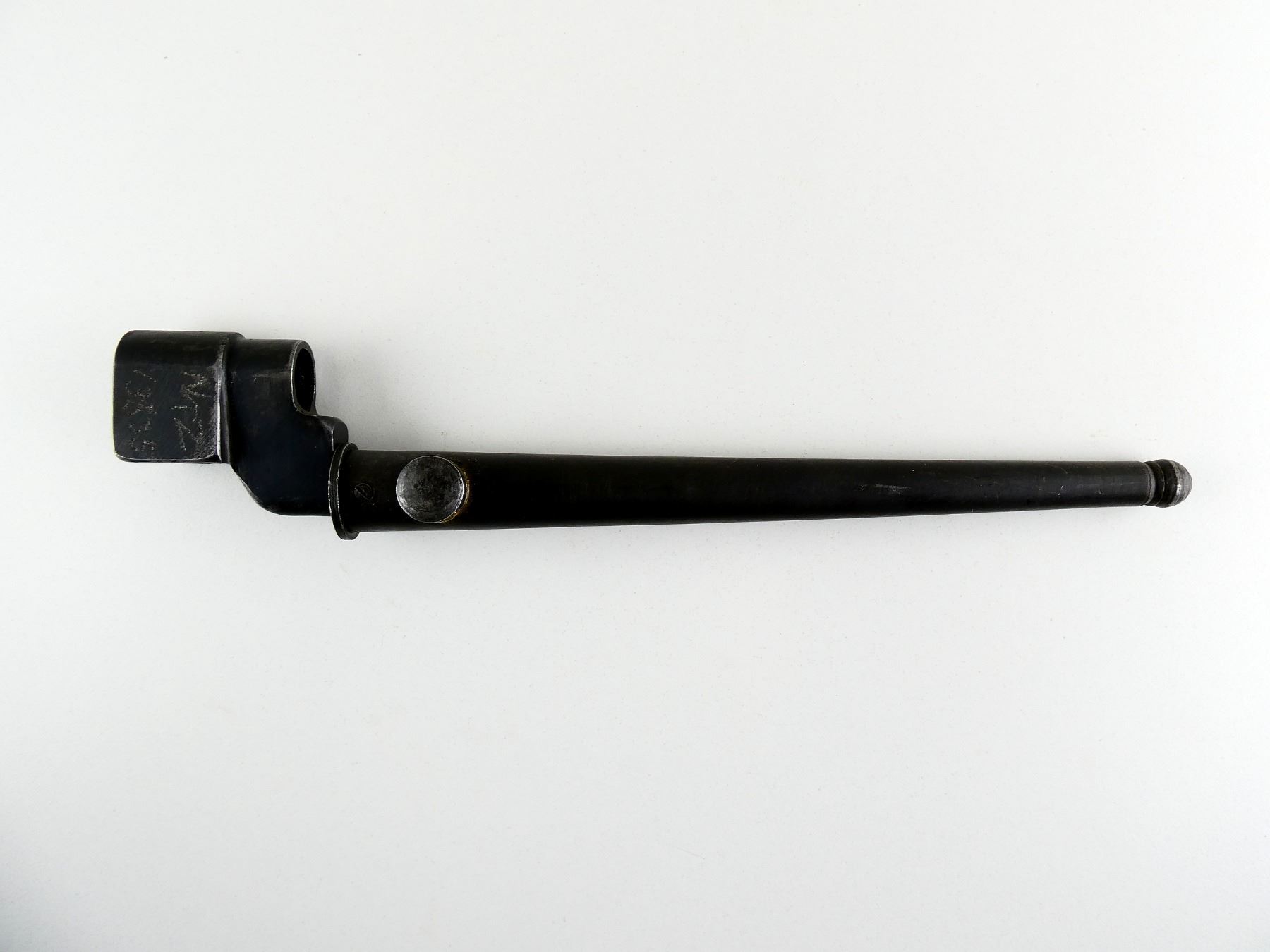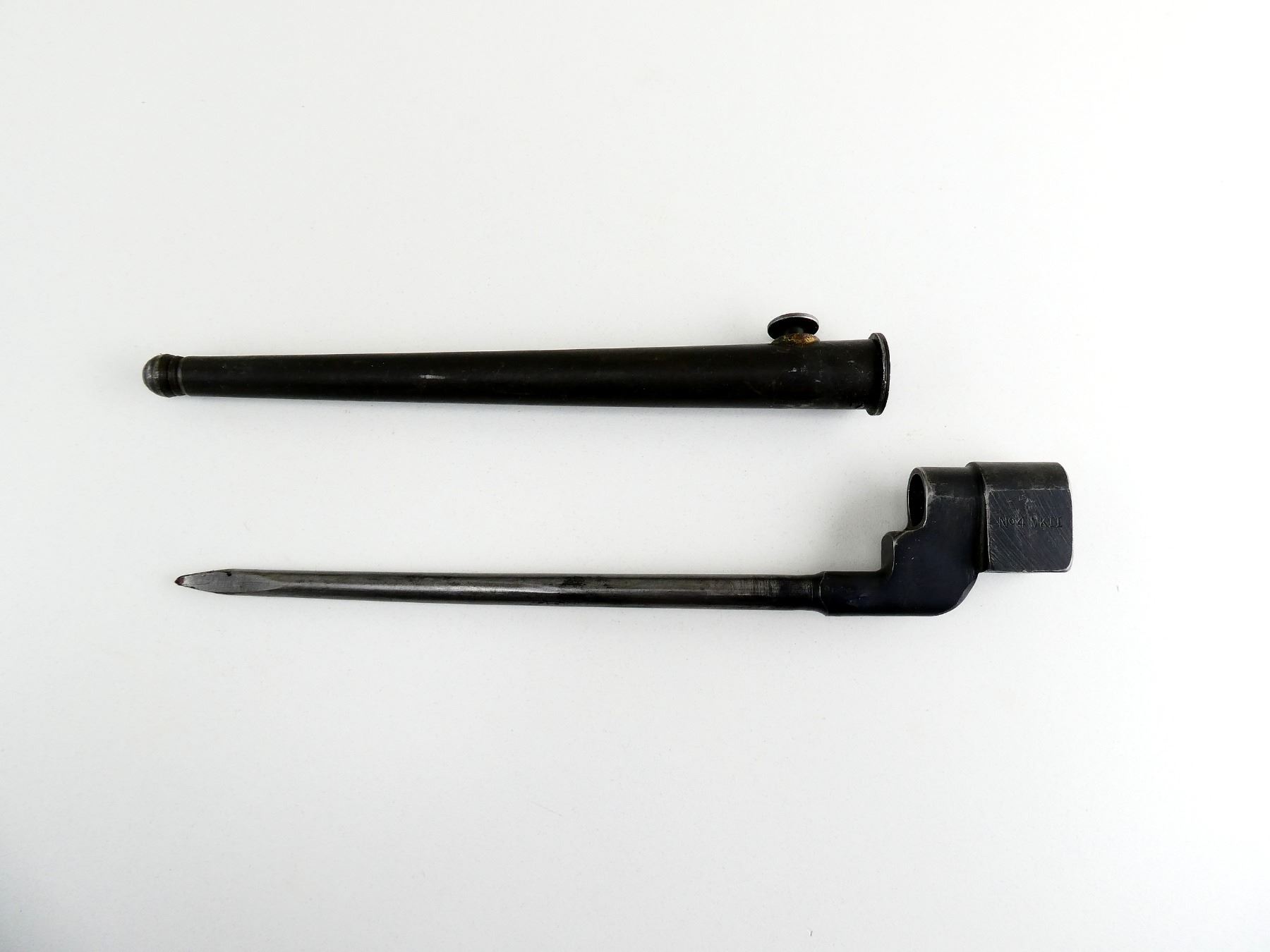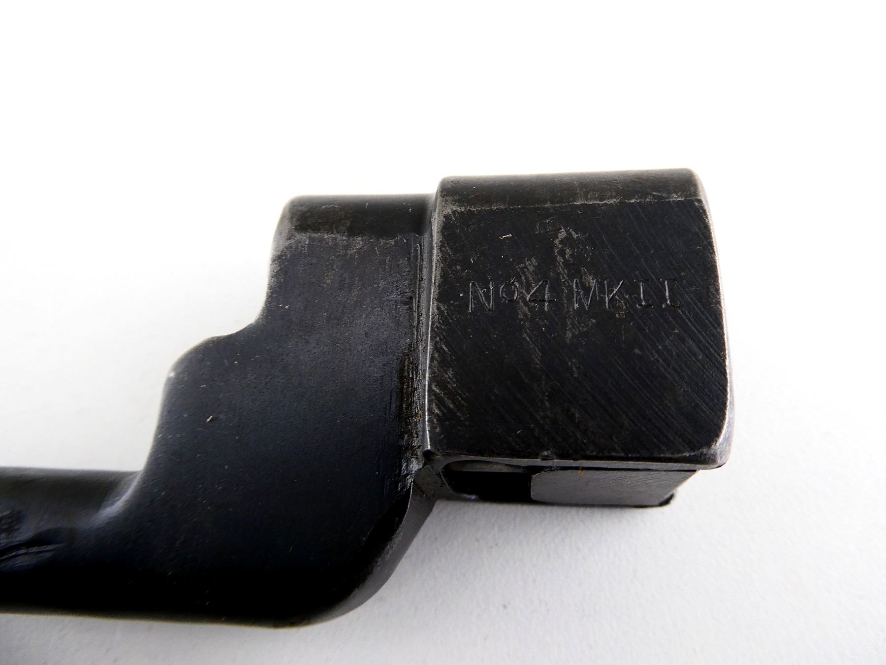 (1) FITS LEE ENFIELD NO.4 MKI & MKII SERIES RIFLES, SOCKET MARKED: "NO4 MKII", "LB (LONG BRANCH)", "55", ETCHED: "N", BROAD ARROW, "Z", "/3535", METAL MKI SCABBARD, THROAT MARKED: "NO4 MK1", BROAD ARROW WITH VARIOUS OTHER FAINT / UN-CLEAR MARKINGS, BLADE APPROX. 8" & OVERALL LENGTH APPROX. 9 7/8". SEE PHOTOS.