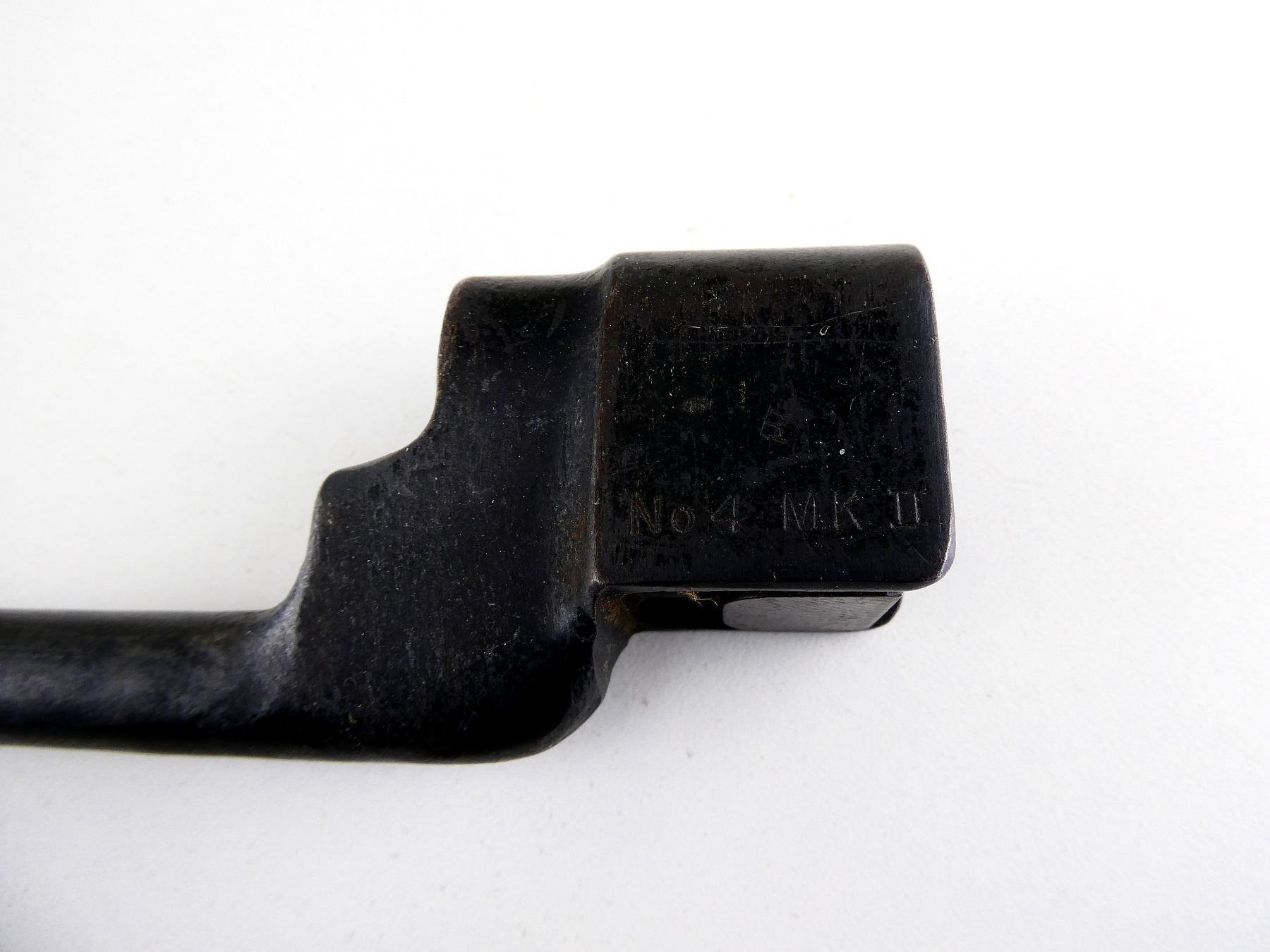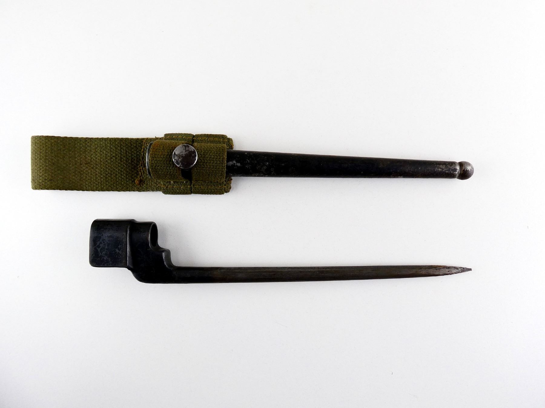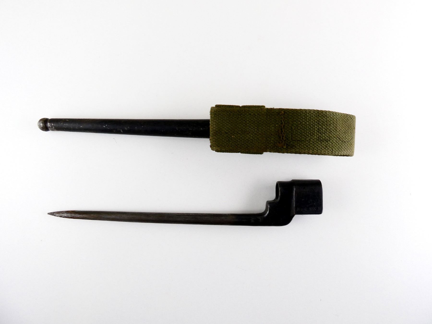 (1) FITS LEE ENFIELD NO.4 MKI & MKII SERIES RIFLES, SOCKET MARKED: "NO4 MK II", "LB (LONG BRANCH)", METAL MKI SCABBARD WITH GREEN CANVAS FROG, THROAT MARKED WITH VARIOUS PROOF MARKS, BALL TIP MARKED WITH BROAD ARROW, FROG MARKED: "1953" WITH FAINT MAPLE LEAF PROOF MARK, BLADE APPROX. 8" & OVERALL LENGTH APPROX. 10". SEE PHOTOS.
