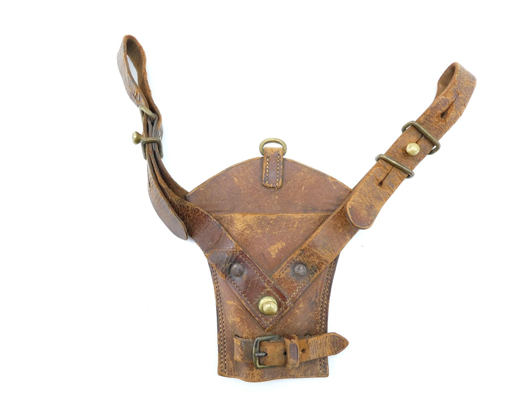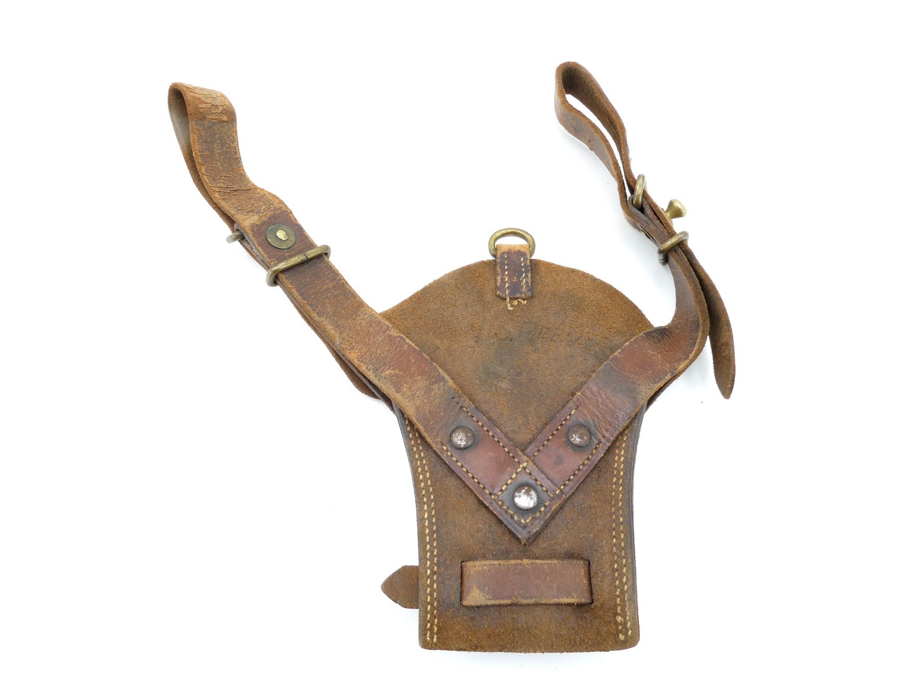 (1) BROWN LEATHER SWORD HANGER, NO VISIBLE MARKINGS, BRASS / STEEL FITTINGS, LEATHER IS SOFT, SHOWS AGE / WEAR, TOP OPENING APPROX. 4" WIDE, BOTTOM OPENING APPROX. 2.5" WIDE & OVERALL LENGTH APPROX. 7" (NOT INCLUDING STRAPS). SEE PHOTOS.