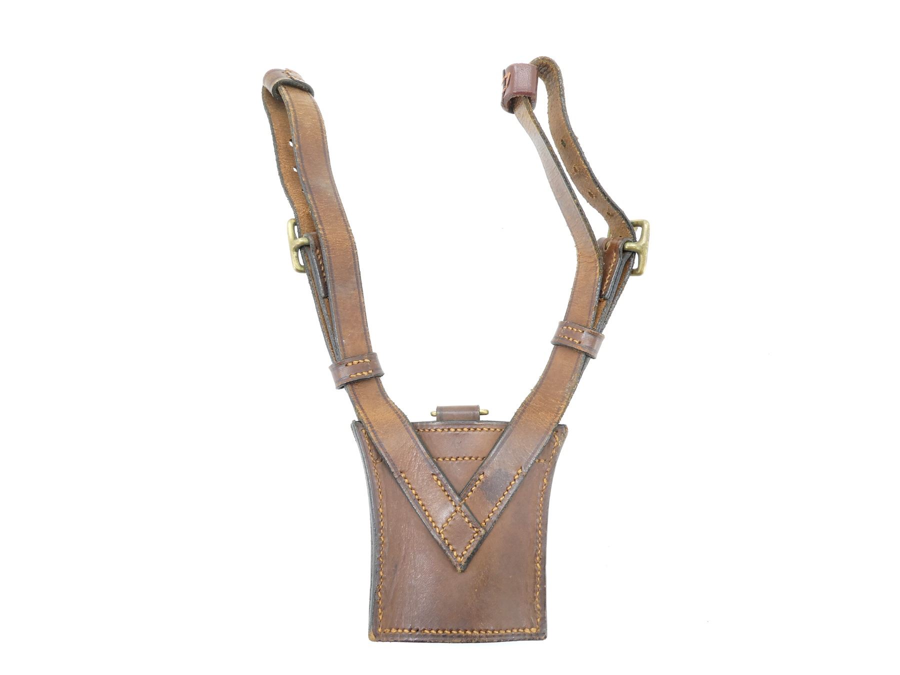 (1) BROWN LEATHER SWORD HANGER WITH BRASS FITTINGS, NO VISIBLE MARKINGS, SAM BROWNE STYLE, LEATHER IS PARTIALLY SOFT, TOP OPENING APPROX. 3" WIDE, BOTTOM OPENING APPROX. 2.25" WIDE & OVERALL LENGTH APPROX. 3.75" (NOT INCLUDING STRAPS). SEE PHOTOS.