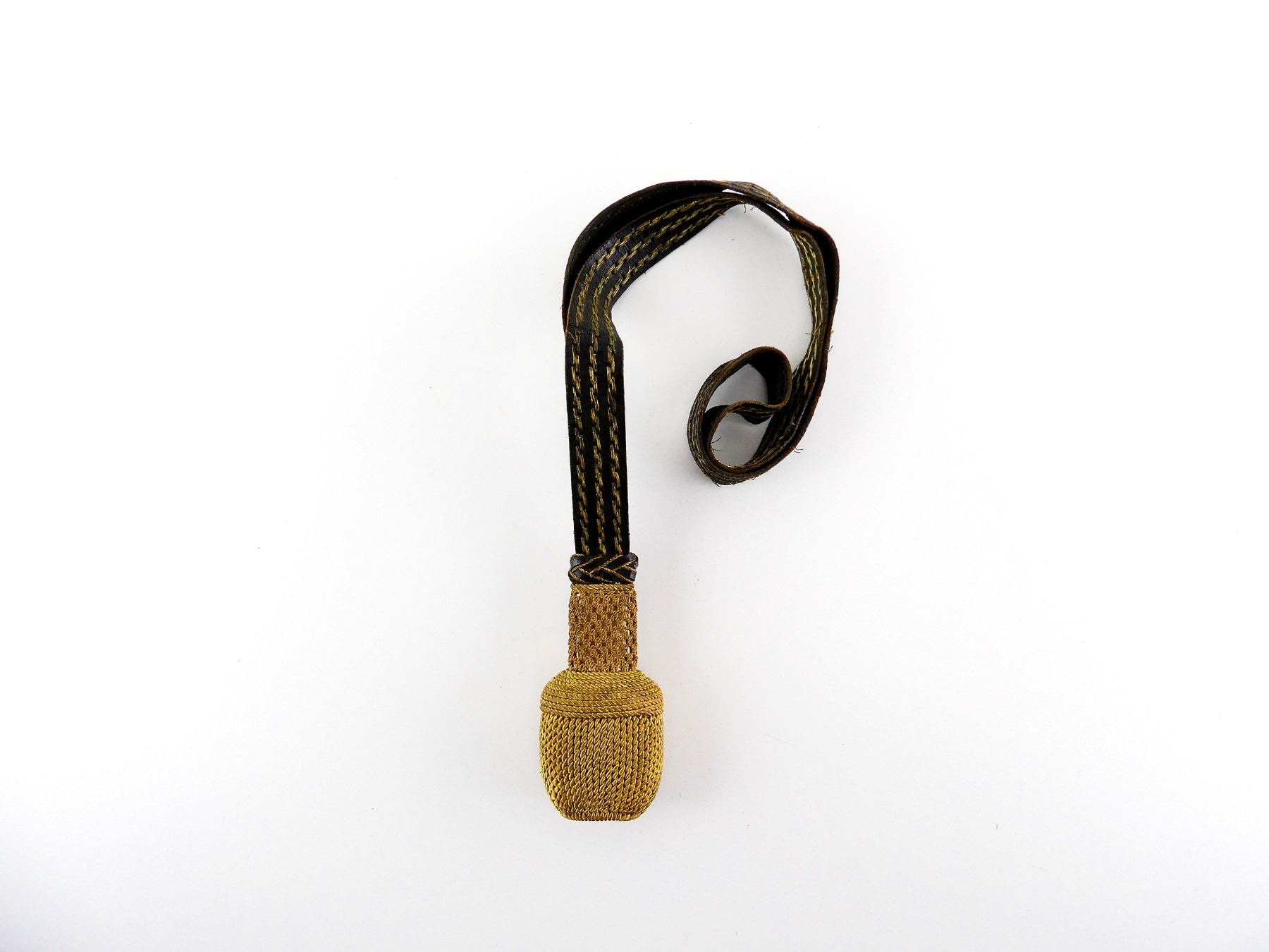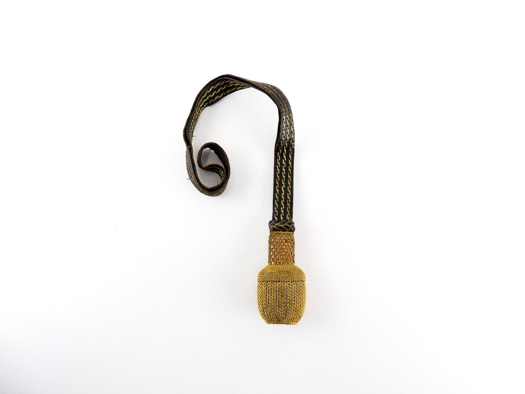 CONSIGNOR STATES: "SWORD KNOT IS MOST LIKELY FOR THE DUKEDOM OF BRAUNSHWEIG, PROBABLY FOR A HUSSAR OR UHLAN OFFICER", (1) PORTAPEE WITH LEATHER STRAP, STRAP HAS THREE LINES OF GOLD COLOURED WIRE, BRAIDED LEATHER / GOLD COLOURED WIRE SLIDE, GOLD COLOURED WIRE STEM / CROWN / BALL, NO VISIBLE MARKINGS, OVERALL LENGTH APPROX. 17 7/8". SEE PHOTOS.
