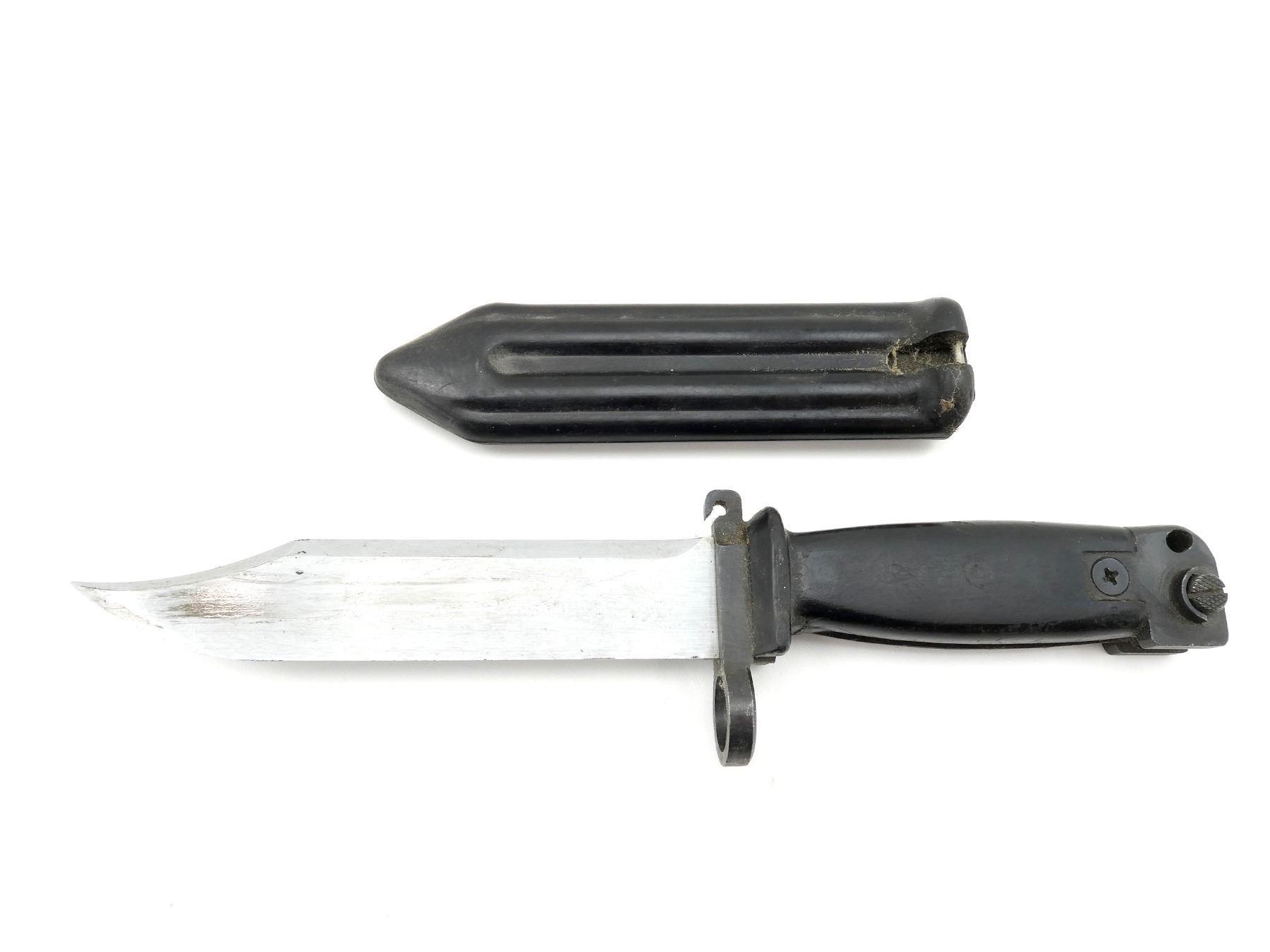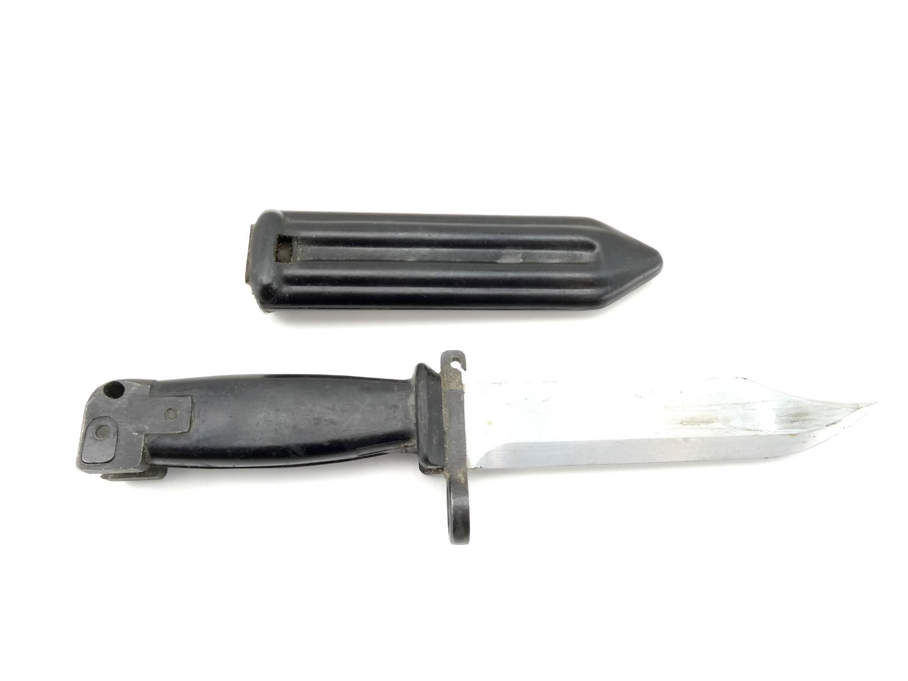 (1) FITS SEMI-AUTOMATIC 7.62MM AKM ASSAULT RIFLES, 2-PIECE BLACK POLYMER GRIP, STEEL POMMEL, NO VISIBLE MARKINGS, BLACK FIBERGLASS SCABBARD, NO VISIBLE MARKINGS, BLADE APPROX. 6" & OVERALL LENGTH APPROX. 10 7/8". SEE PHOTOS.